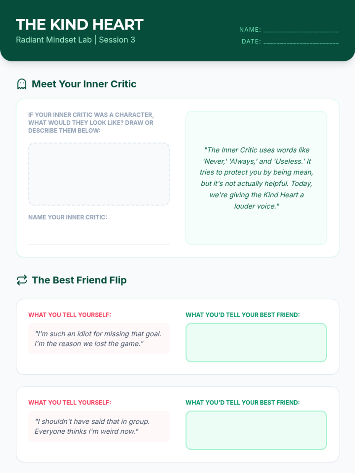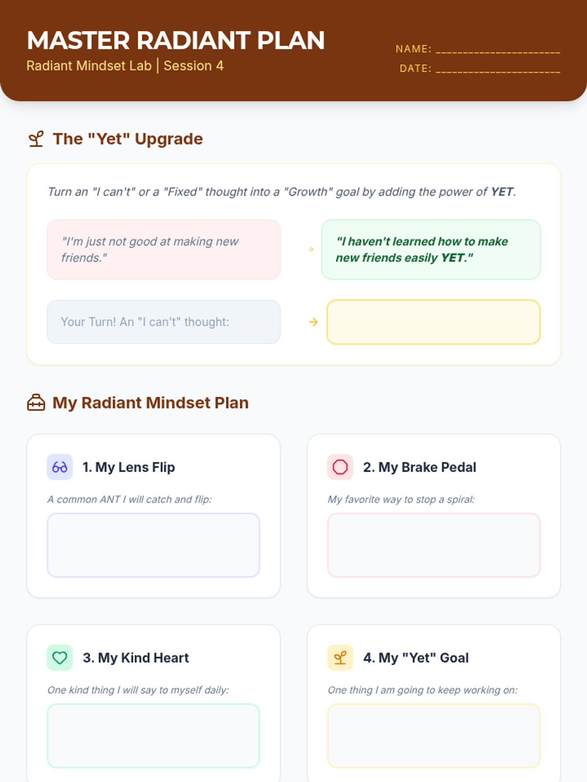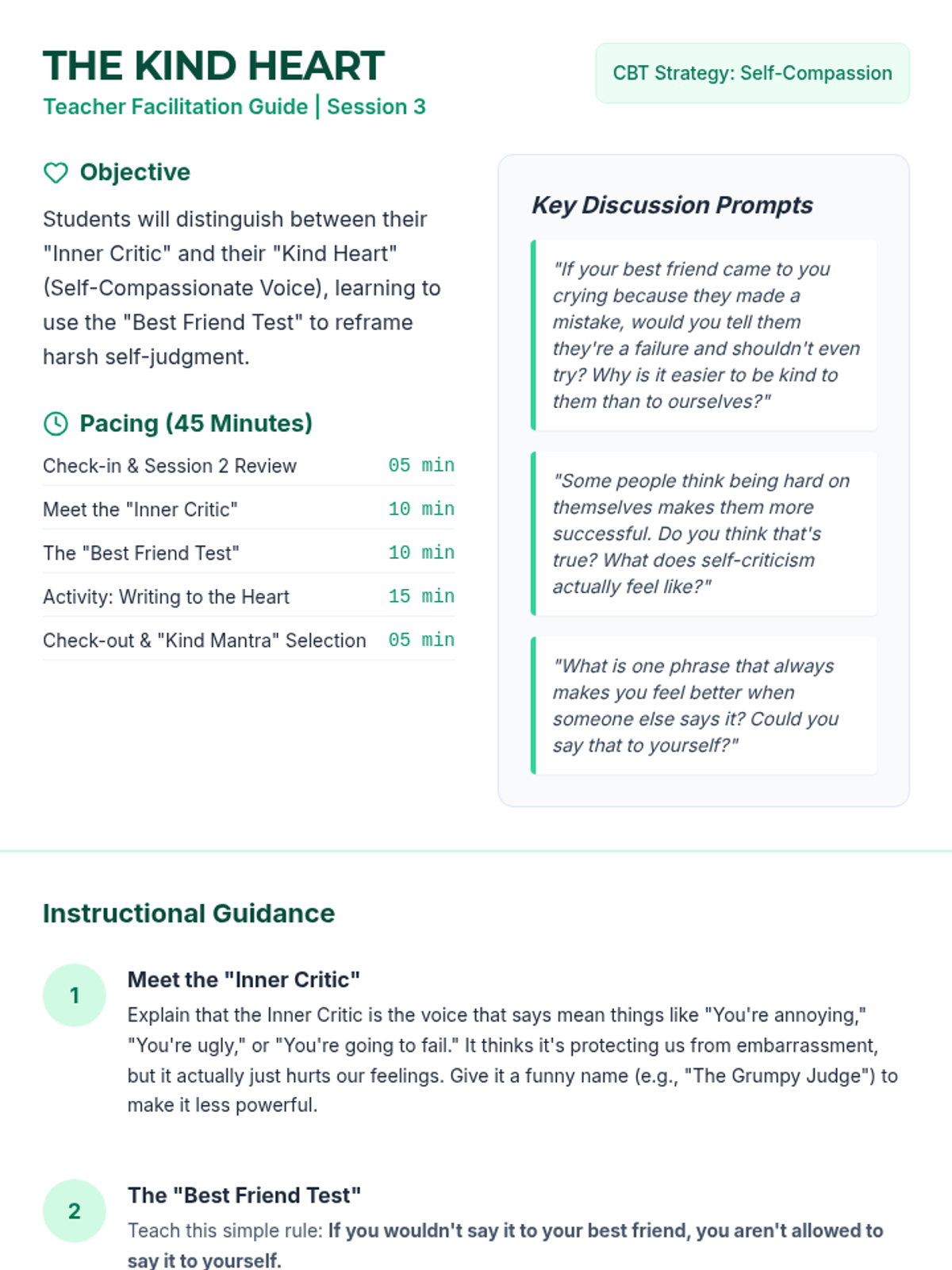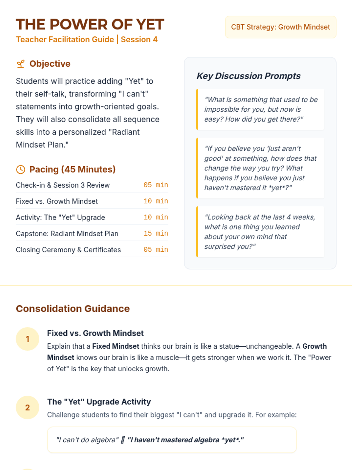 A 4-session Tier 2 CBT sequence for girls focusing on self-esteem and negative thinking patterns. This sequence builds on CBT basics to provide advanced strategies for cognitive reframing, thought stopping, self-compassion, and growth mindset.