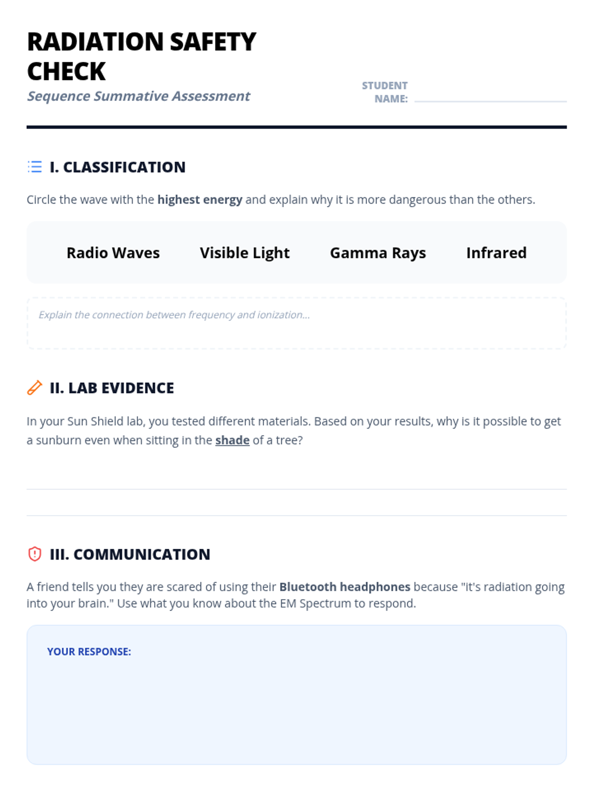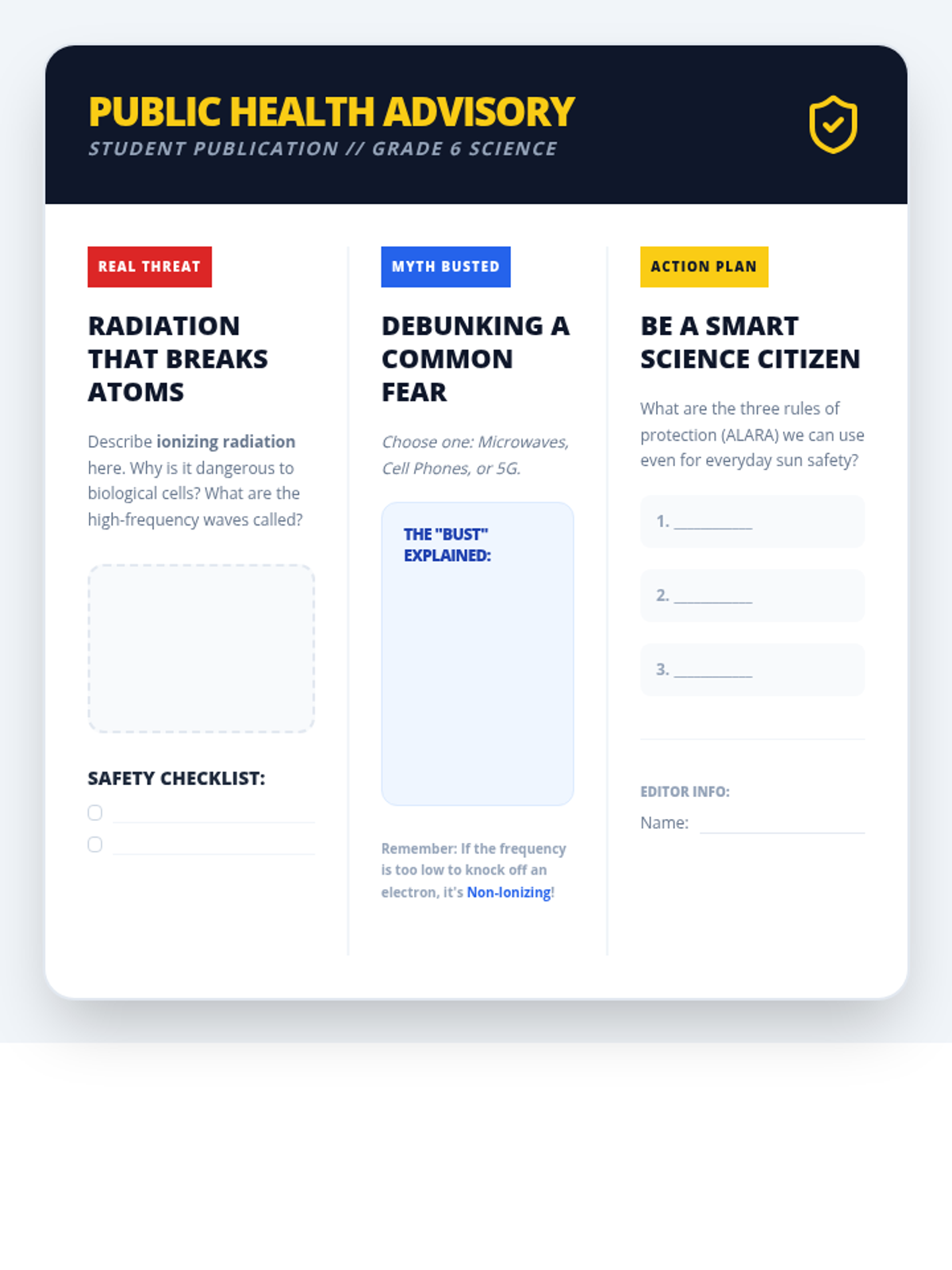 This 5-lesson sequence for 6th-grade students explores the biological impacts of electromagnetic radiation. Students distinguish between ionizing and non-ionizing types, investigate UV intensity, test sun-protection materials, and evaluate the use of high-energy radiation in medicine.