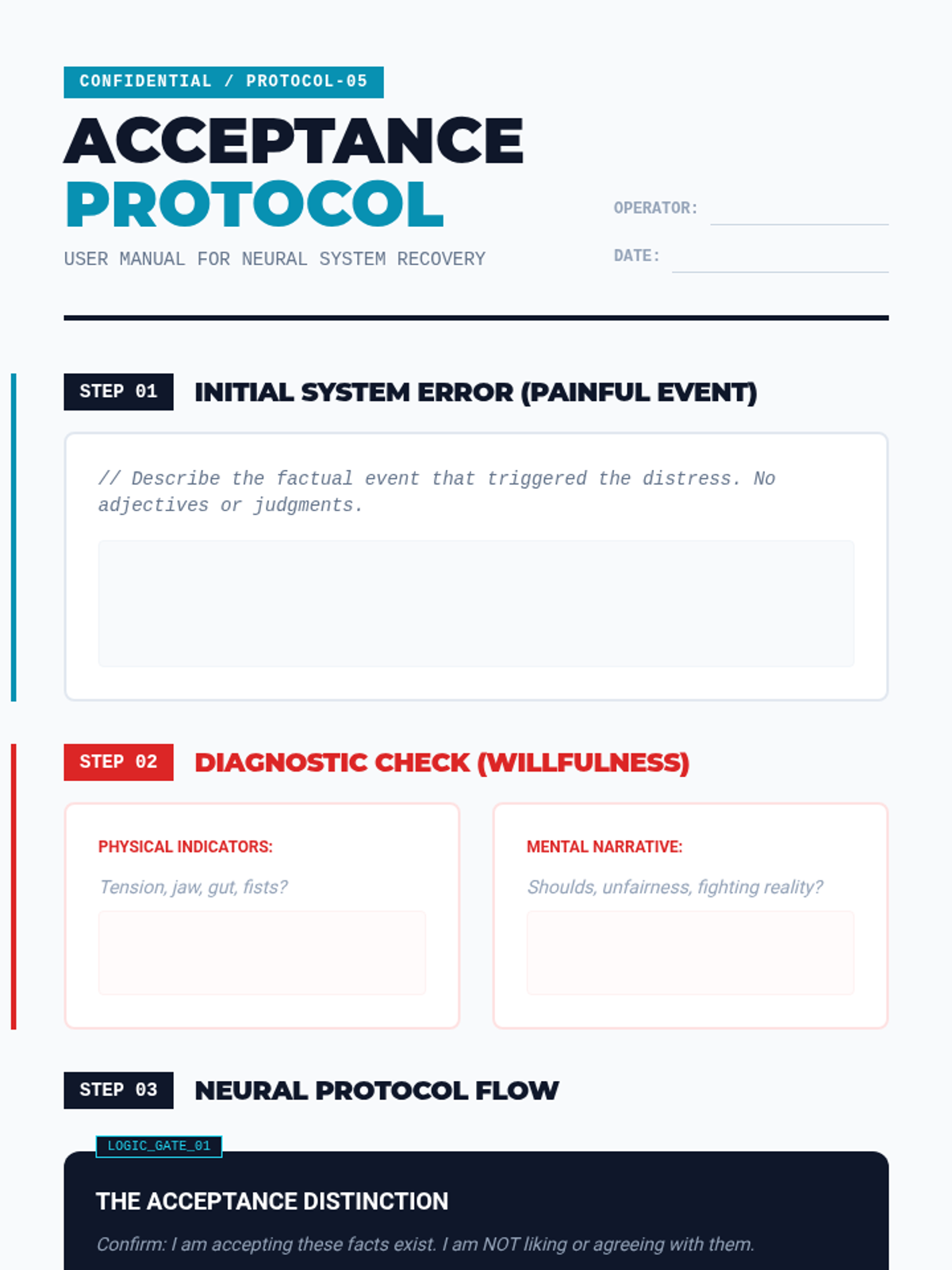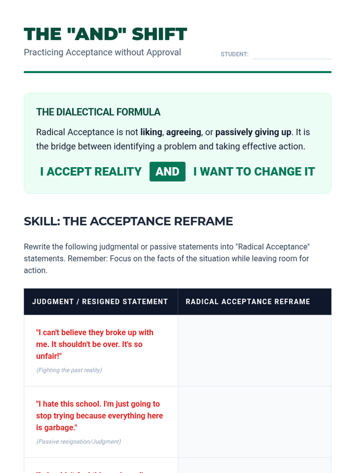 This 12th-grade sequence introduces the psychological mechanics of Radical Acceptance through a Dialectical Behavior Therapy (DBT) lens. Students move from understanding the 'Mathematics of Suffering' (Pain x Resistance) to developing personalized protocols for navigating distress by distinguishing between unavoidable reality and optional suffering.