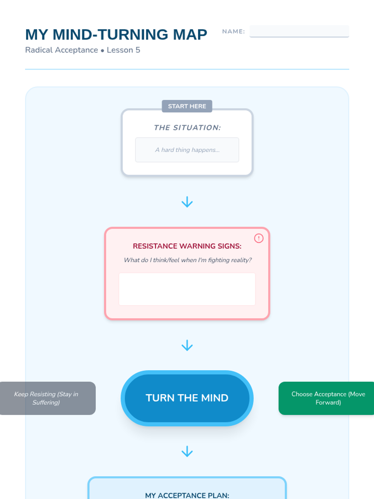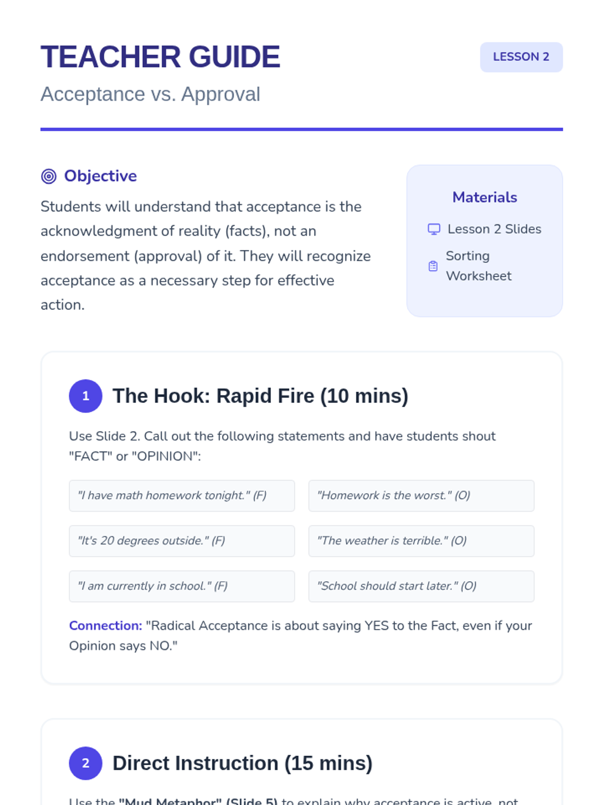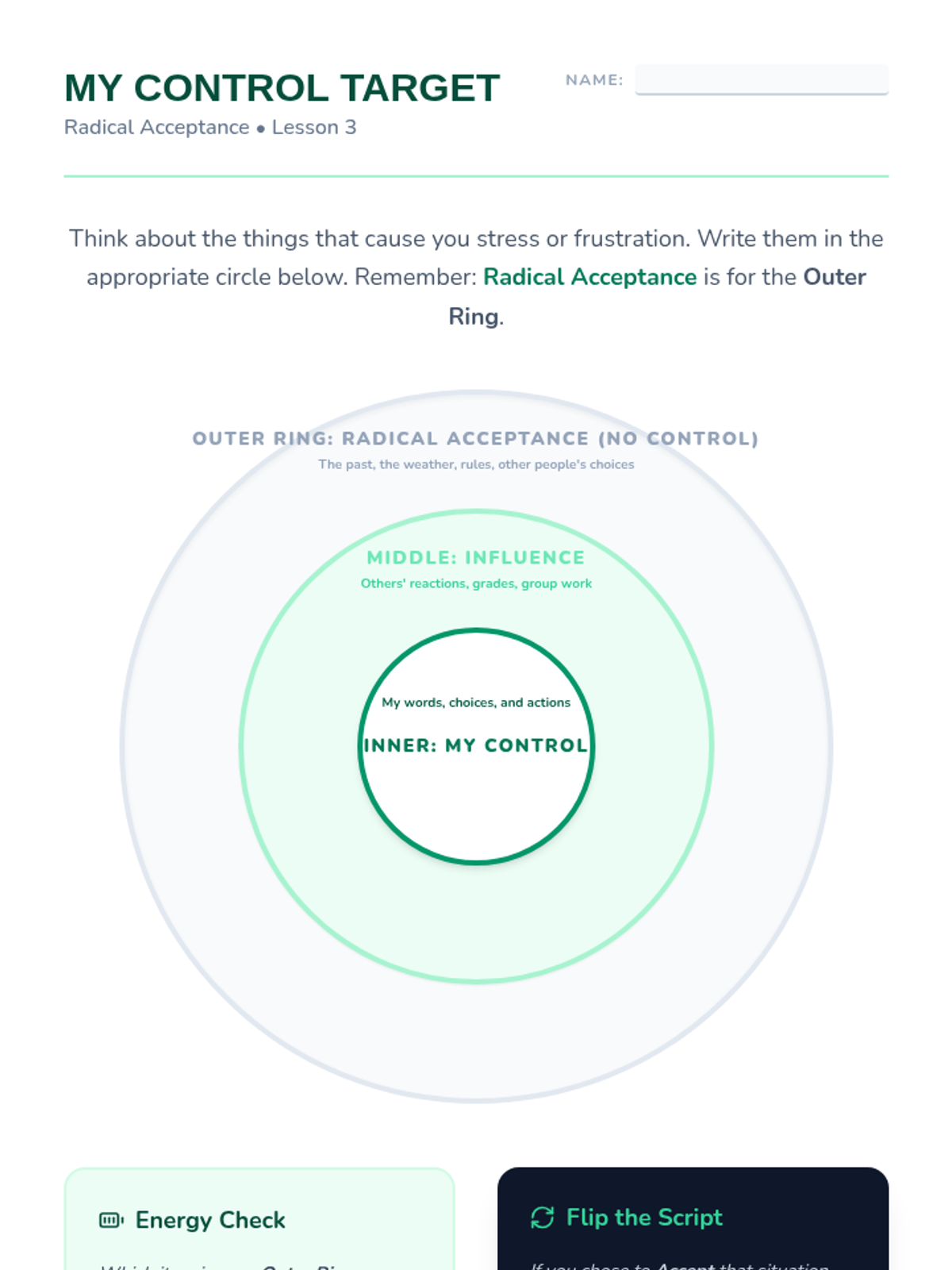 This introductory sequence for 7th-grade students establishes the foundational concepts of Radical Acceptance by distinguishing between pain and suffering. Students learn to move from resisting reality to accepting it through practical skills, the Sphere of Control, and the technique of 'Turning the Mind'.
