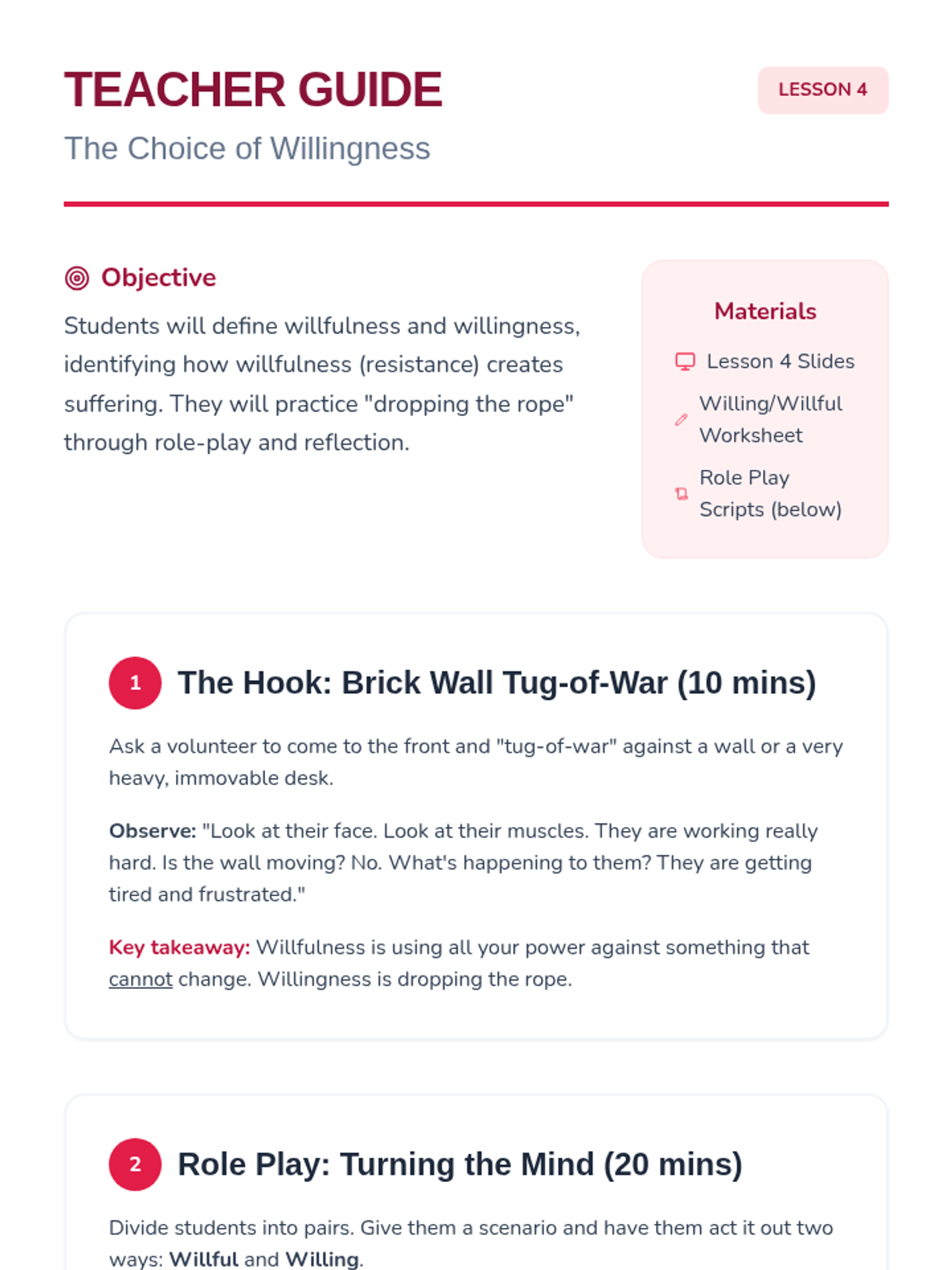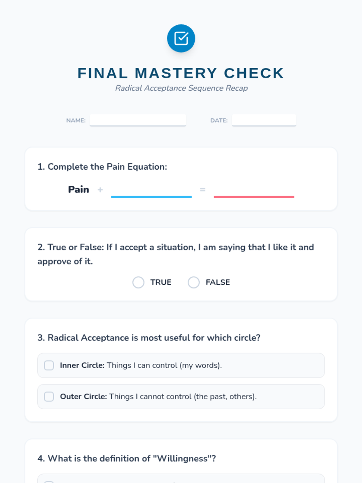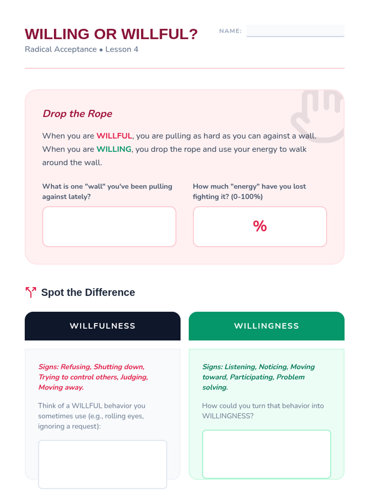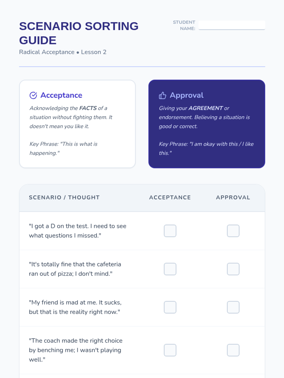 This introductory sequence for 7th-grade students establishes the foundational concepts of Radical Acceptance by distinguishing between pain and suffering. Students learn to move from resisting reality to accepting it through practical skills, the Sphere of Control, and the technique of 'Turning the Mind'.
