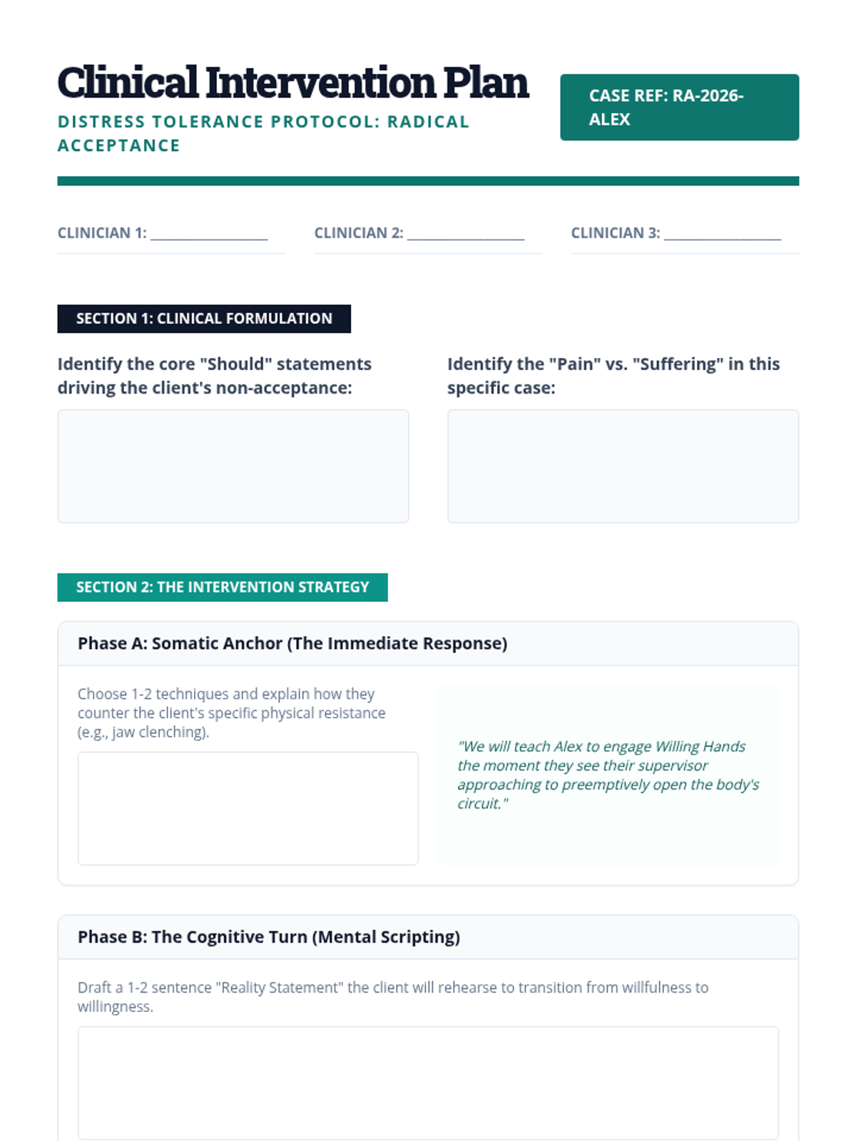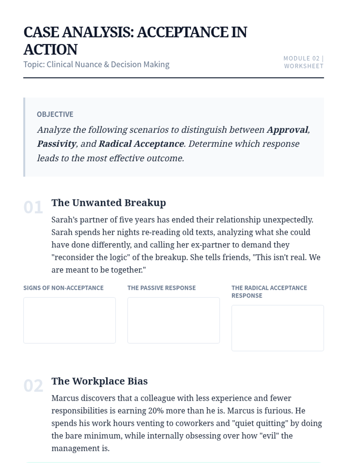 This sequence explores Radical Acceptance through the lens of Dialectical Behavior Therapy (DBT), focusing on the distinction between pain and suffering, somatic techniques, and cognitive restructuring. Students will progress from foundational concepts to clinical application, learning to manage emotional dysregulation by accepting reality without judgment.