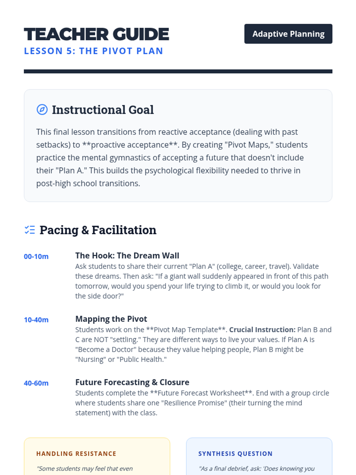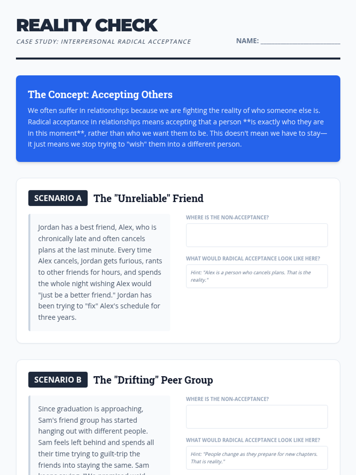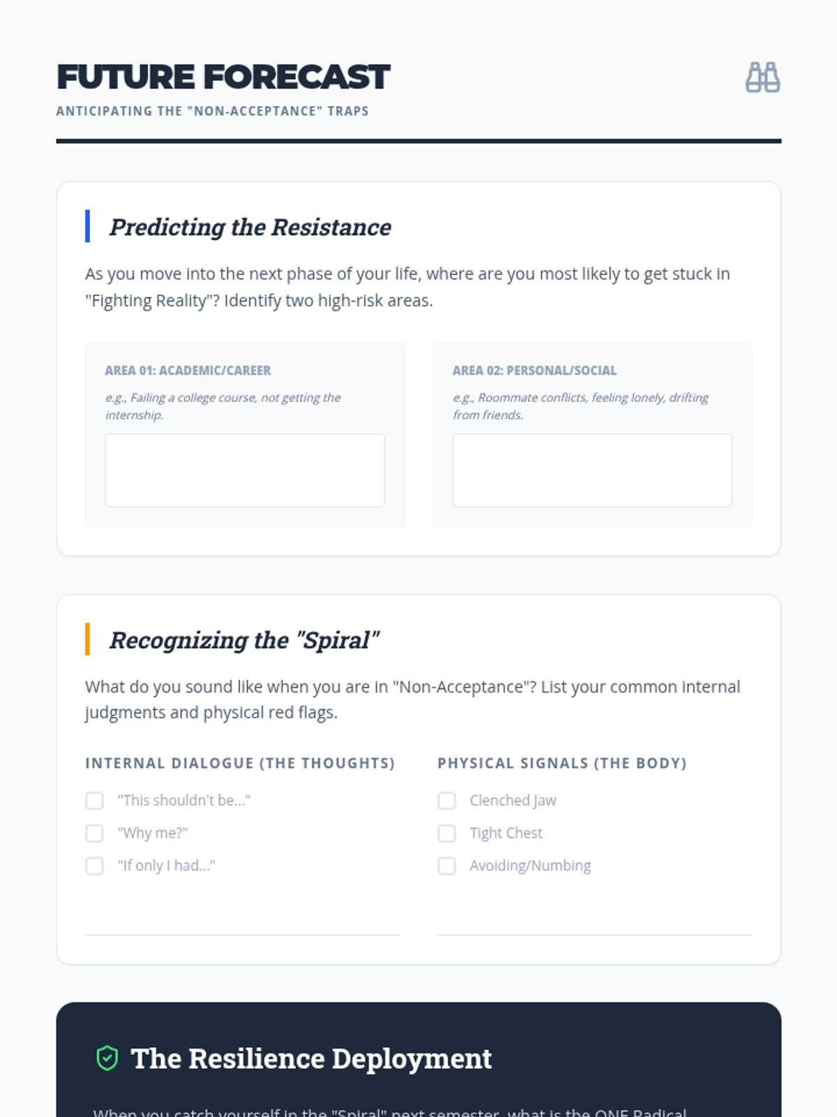 A counseling and life skills sequence for 12th-grade students focusing on applying Radical Acceptance to major life transitions, setbacks, and relationship changes as they prepare for life after graduation.