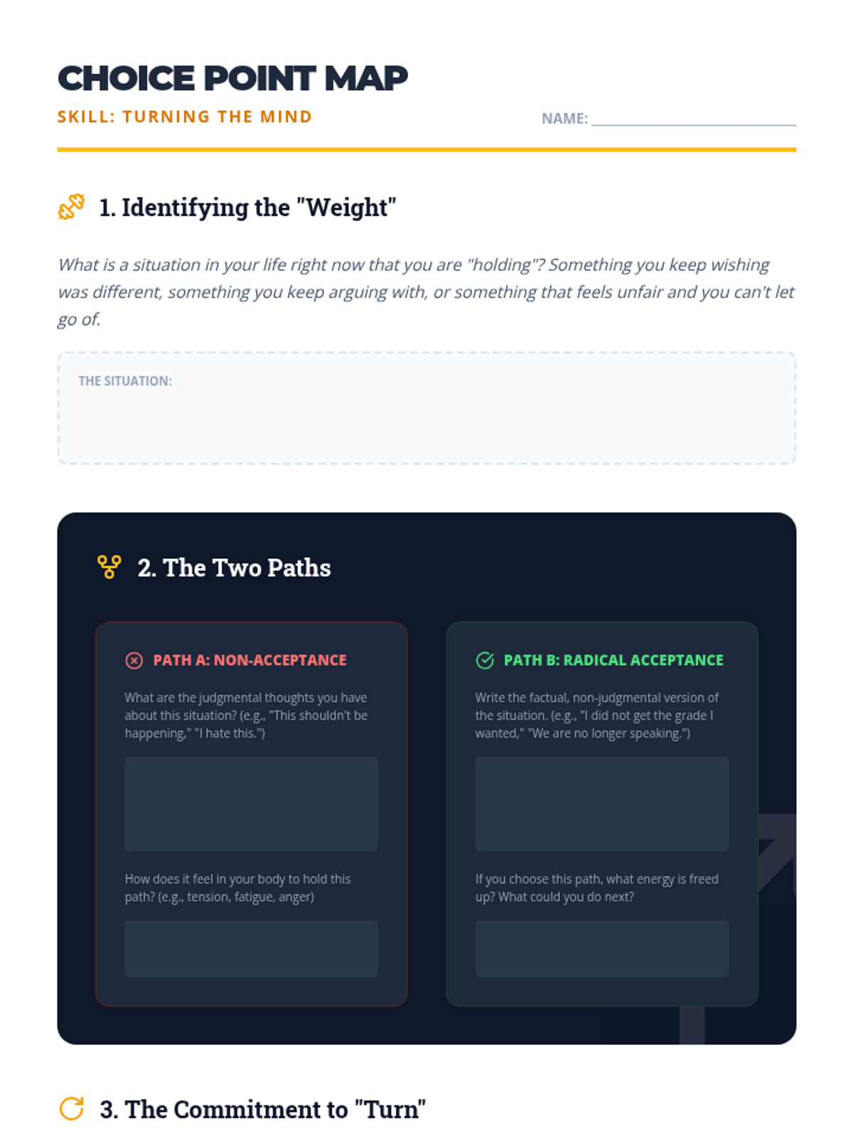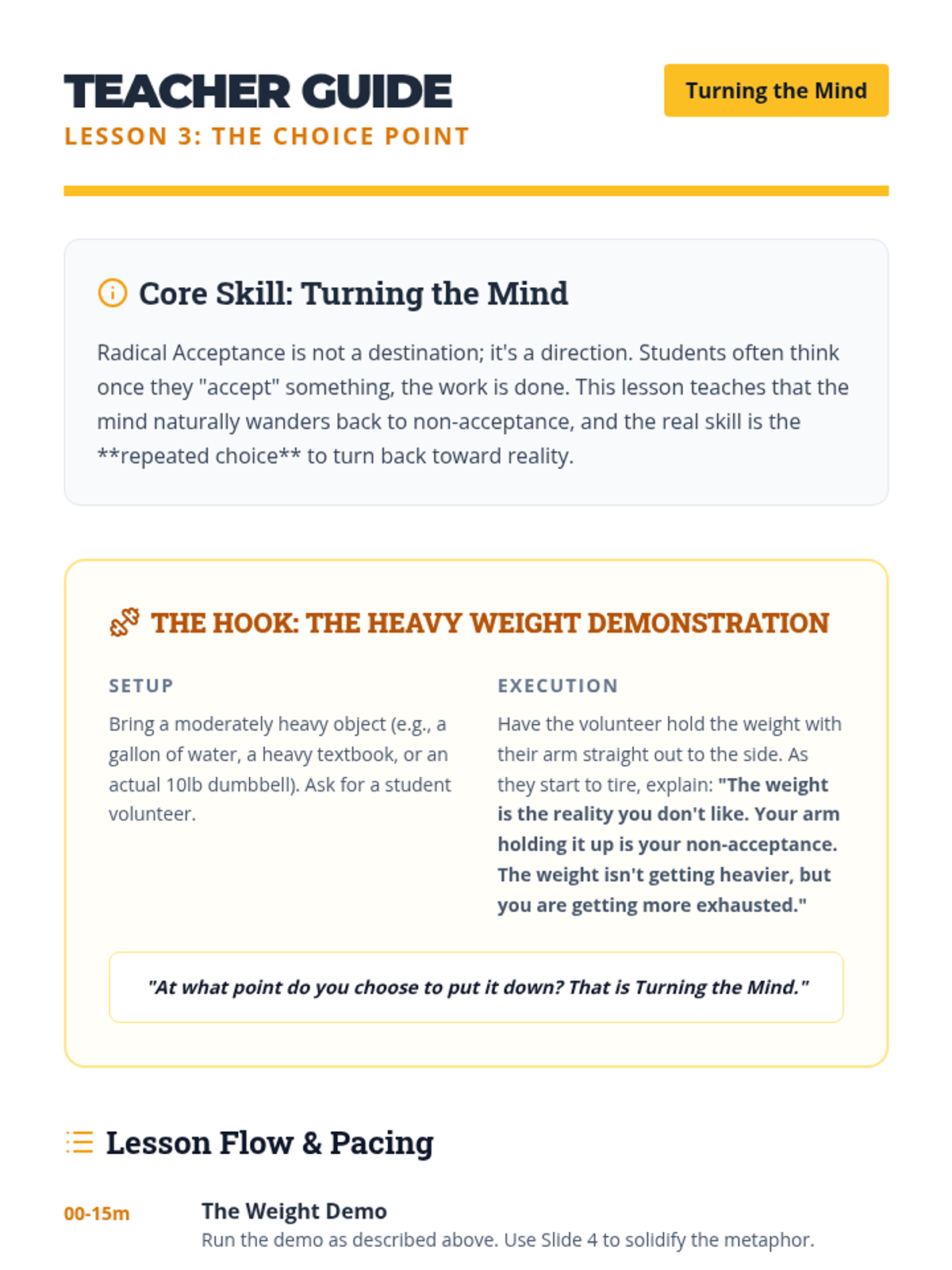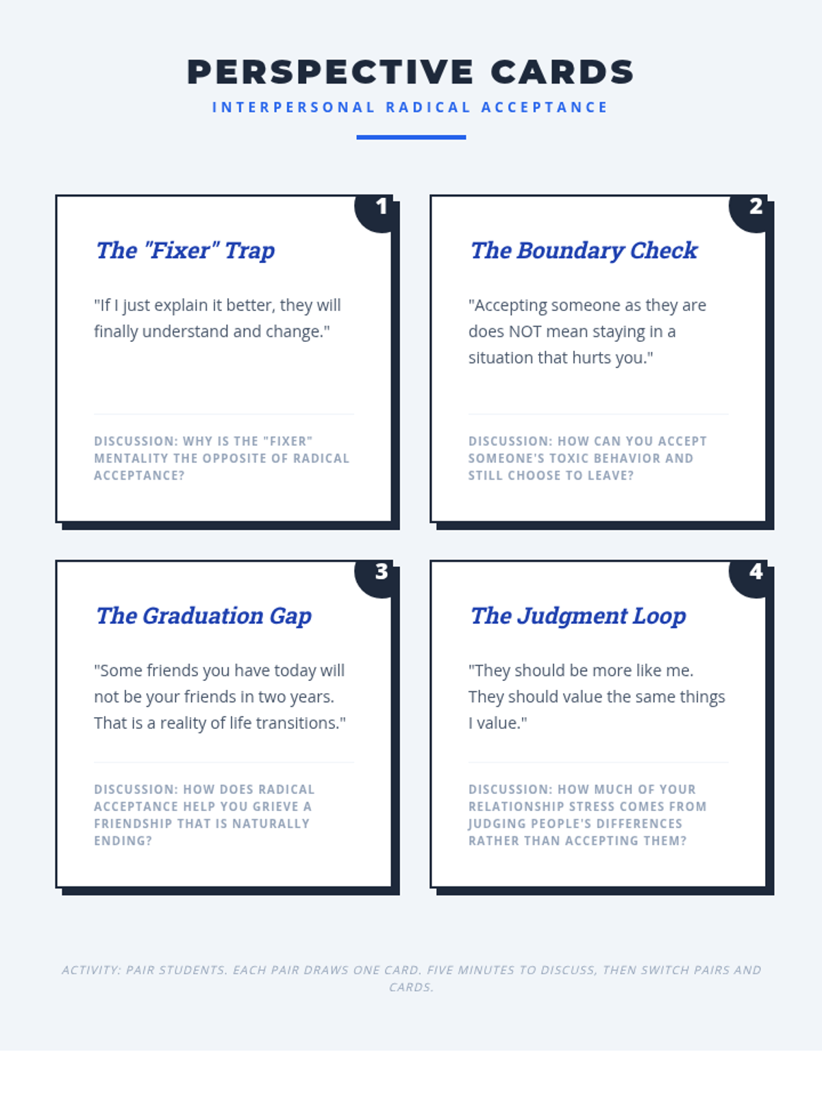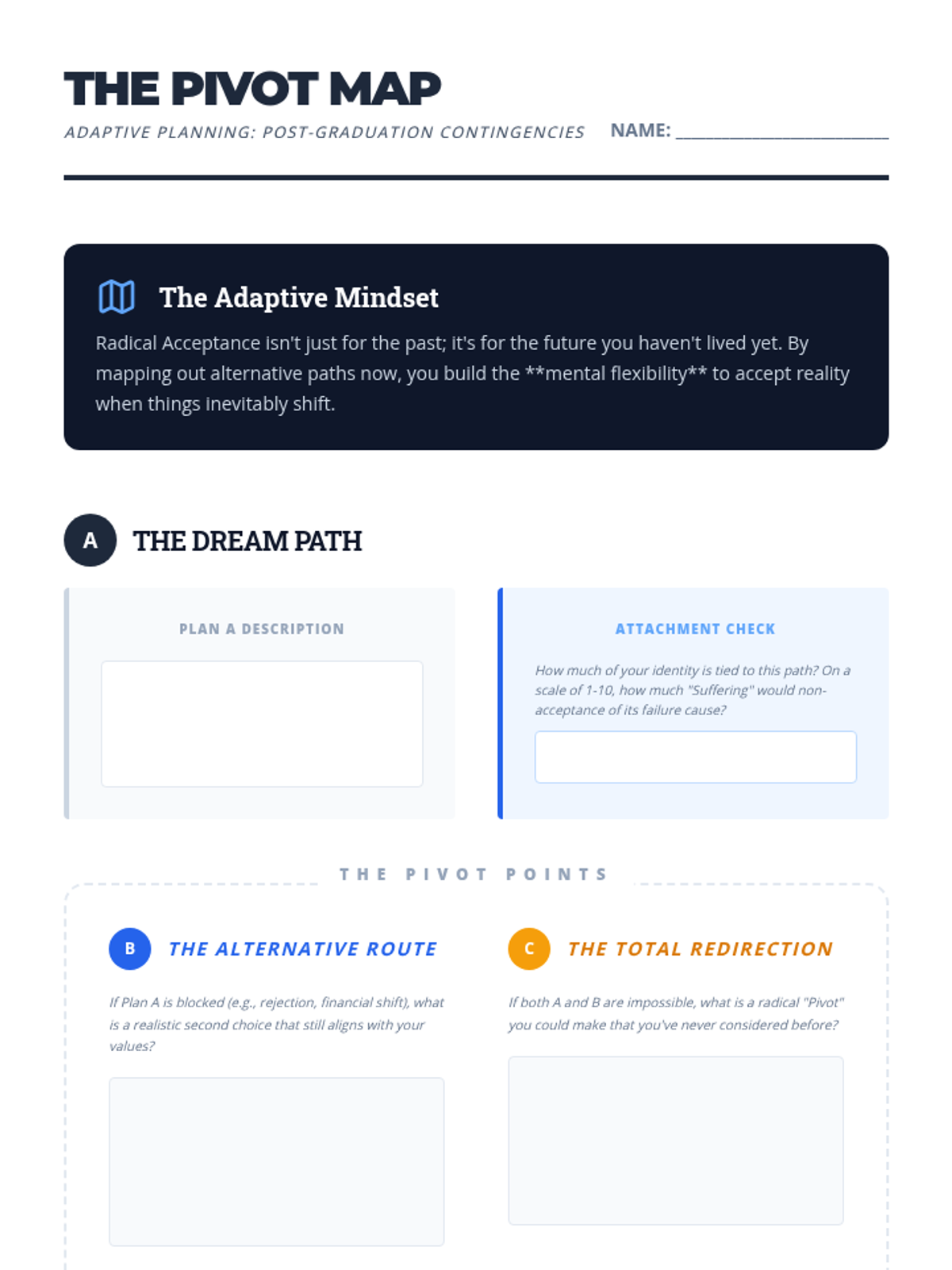 A counseling and life skills sequence for 12th-grade students focusing on applying Radical Acceptance to major life transitions, setbacks, and relationship changes as they prepare for life after graduation.