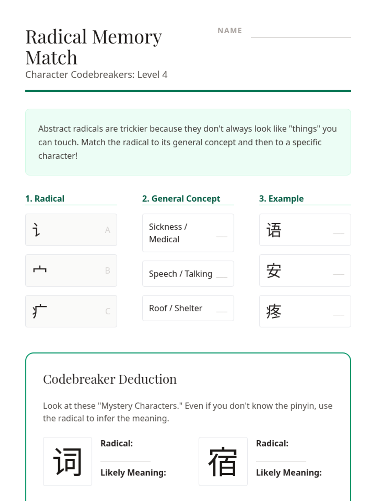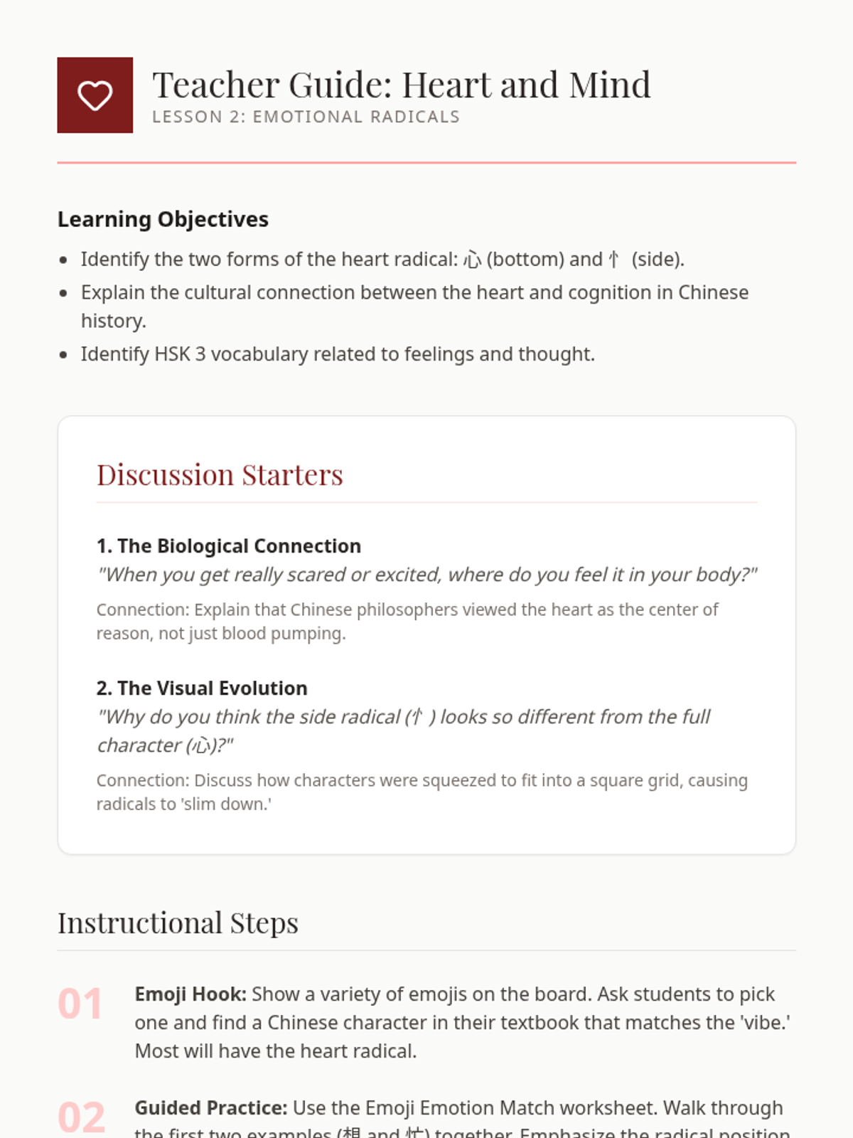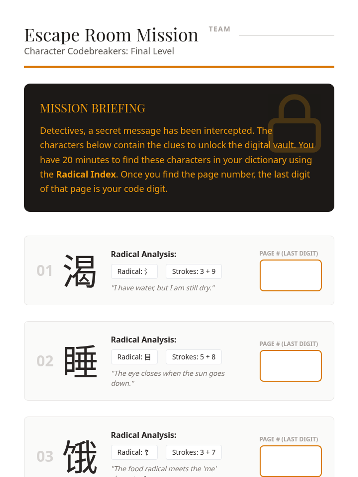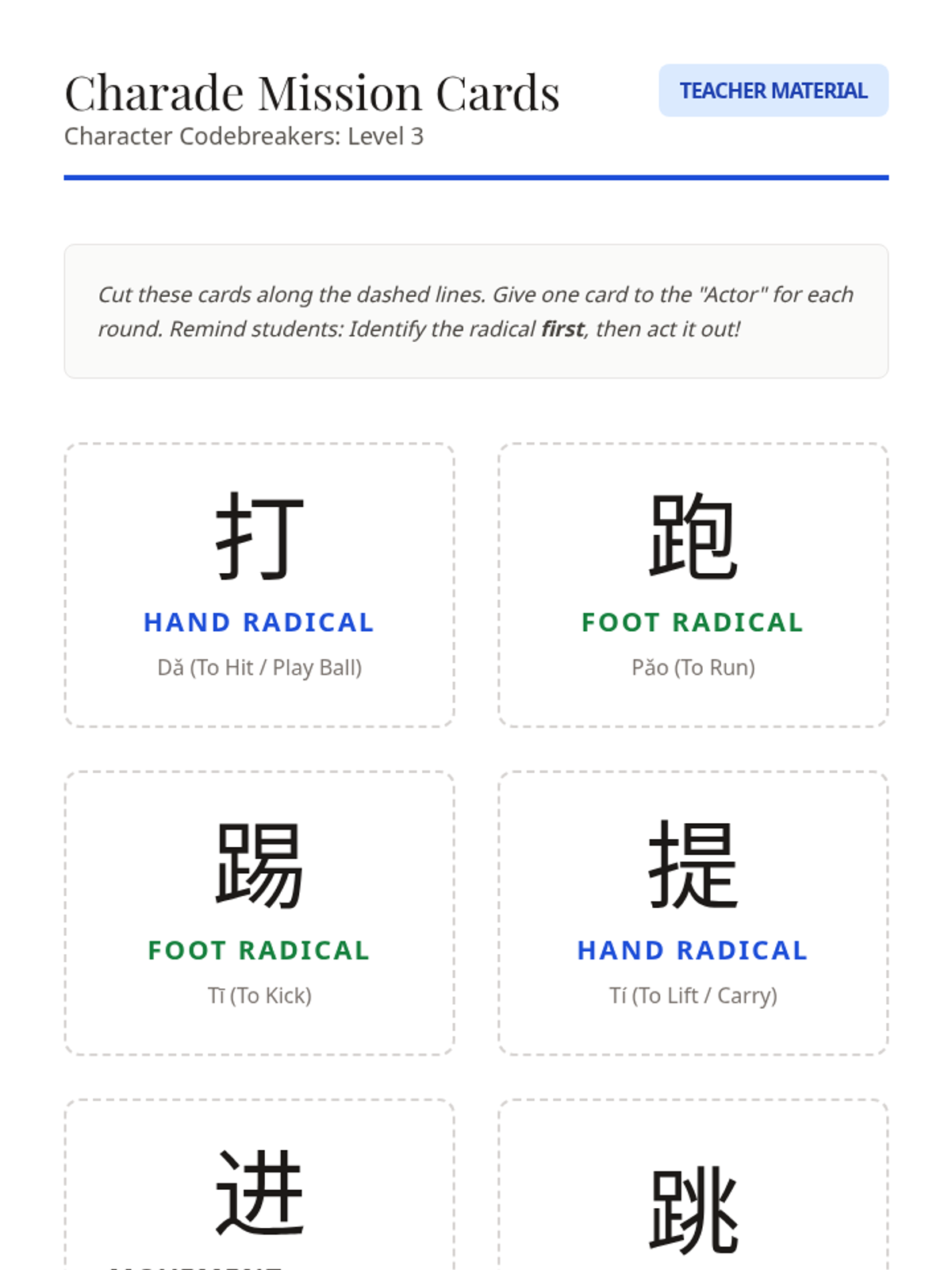 This intermediate Mandarin sequence transforms students into 'Character Codebreakers.' By analyzing the high-frequency radicals that form the building blocks of Chinese characters, students learn to infer meaning in new vocabulary related to nature, emotion, action, and abstract concepts, culminating in a dictionary scavenger hunt.