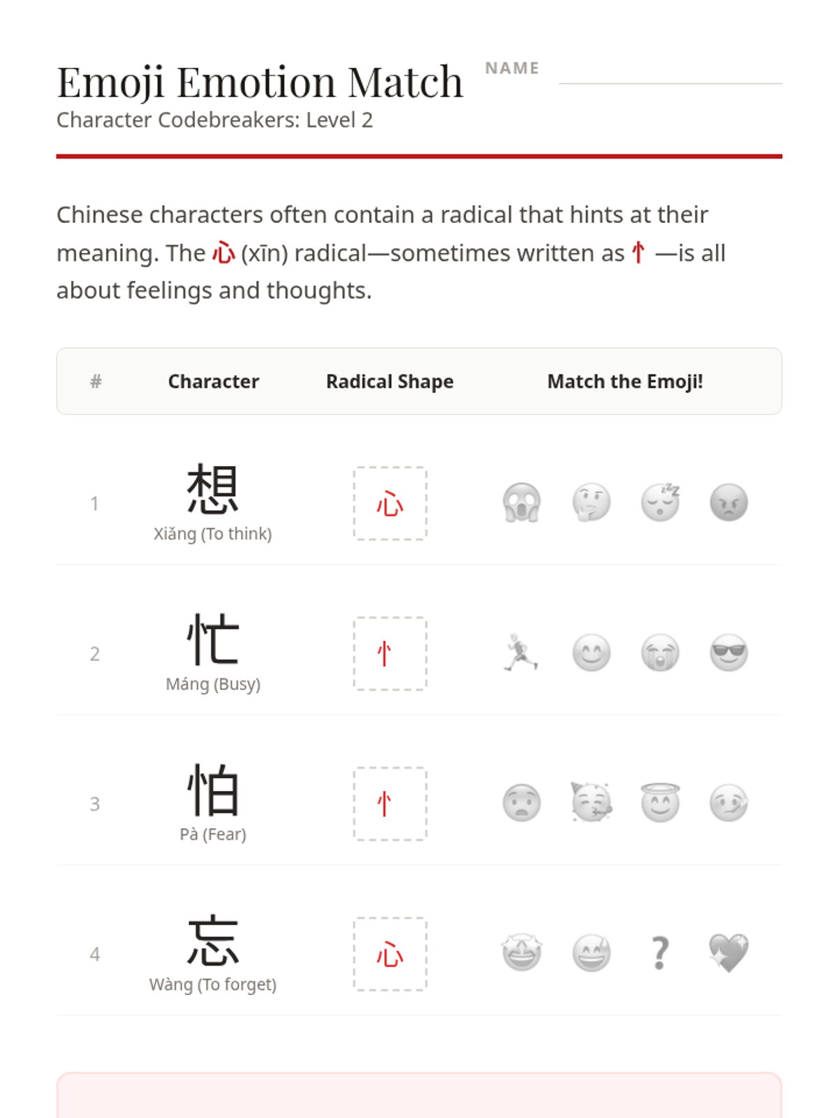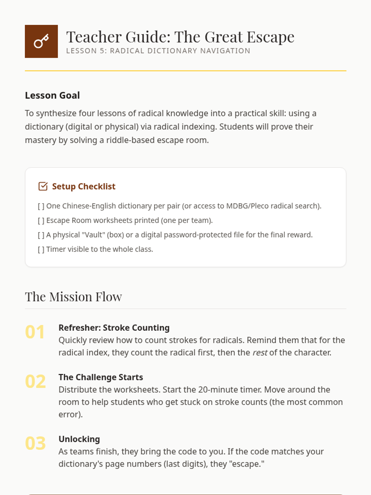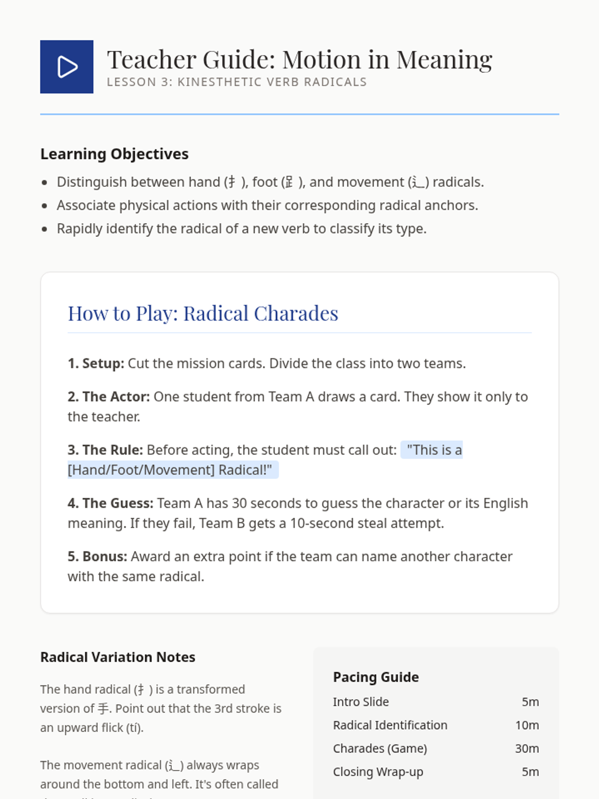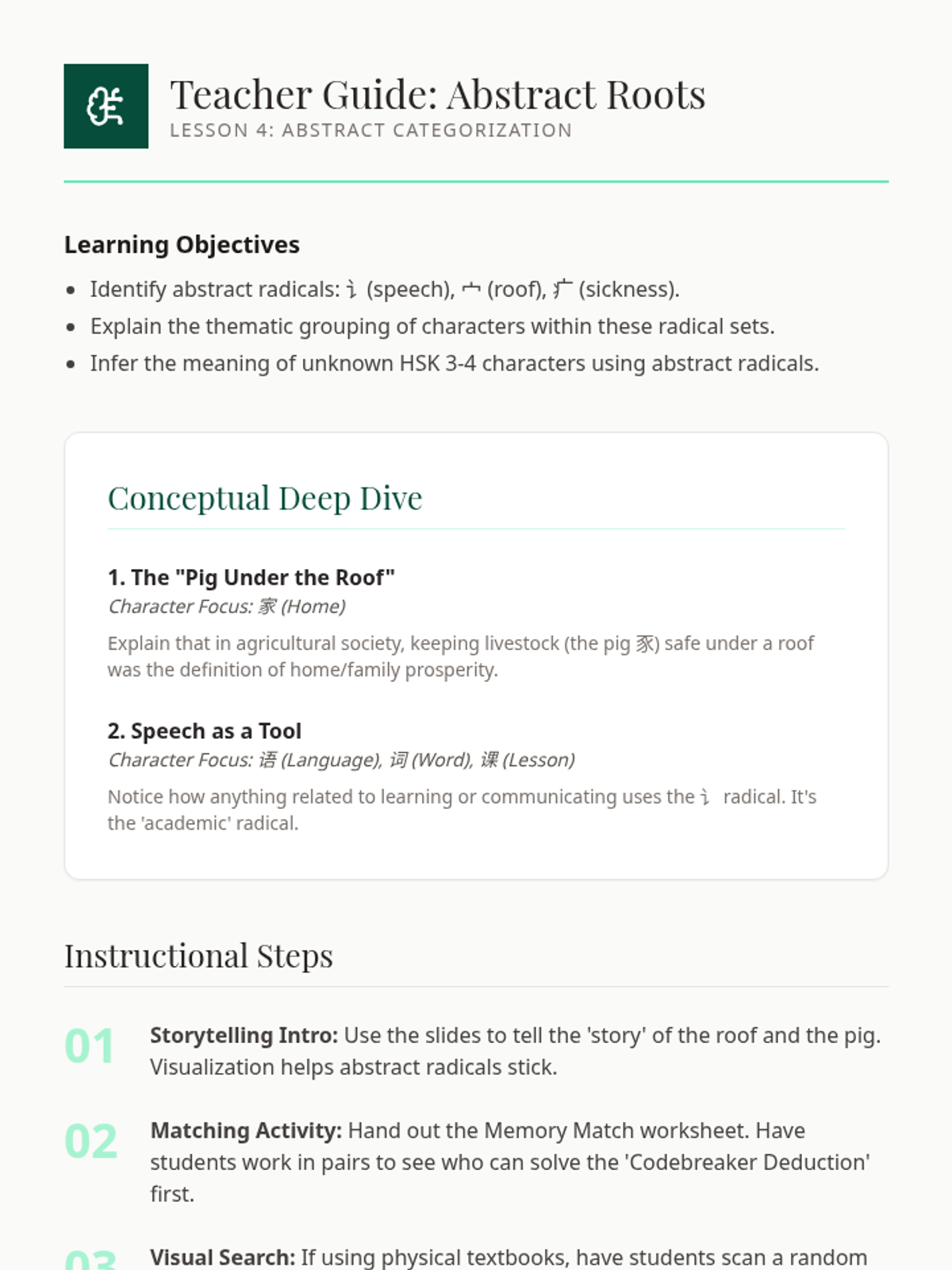 This intermediate Mandarin sequence transforms students into 'Character Codebreakers.' By analyzing the high-frequency radicals that form the building blocks of Chinese characters, students learn to infer meaning in new vocabulary related to nature, emotion, action, and abstract concepts, culminating in a dictionary scavenger hunt.