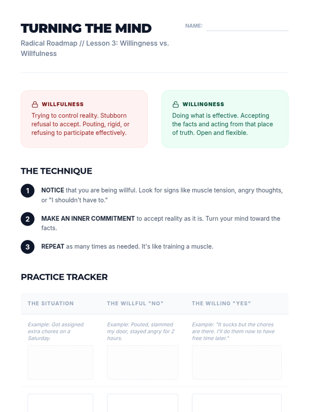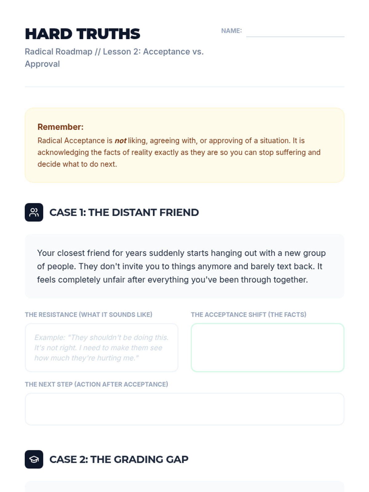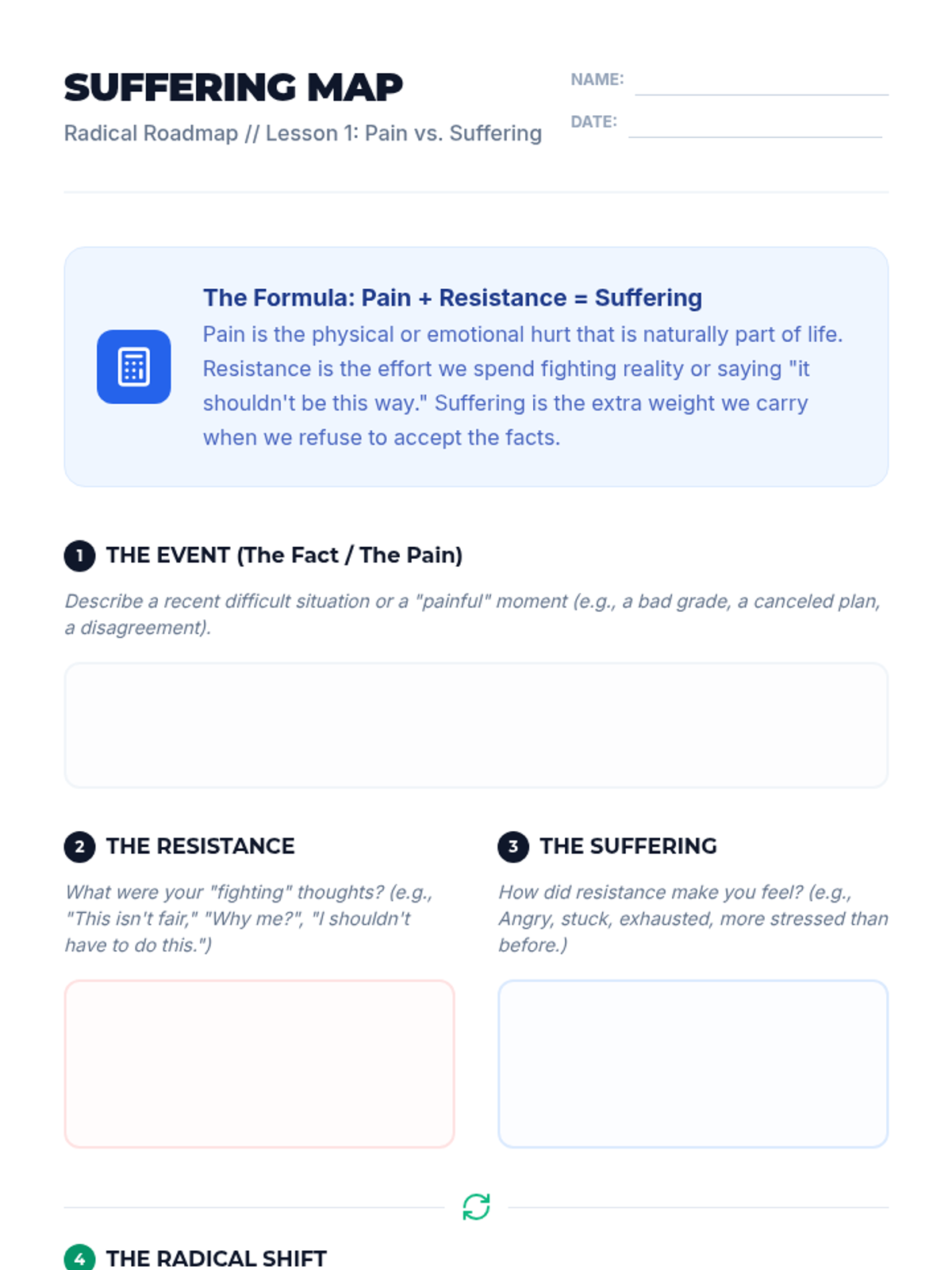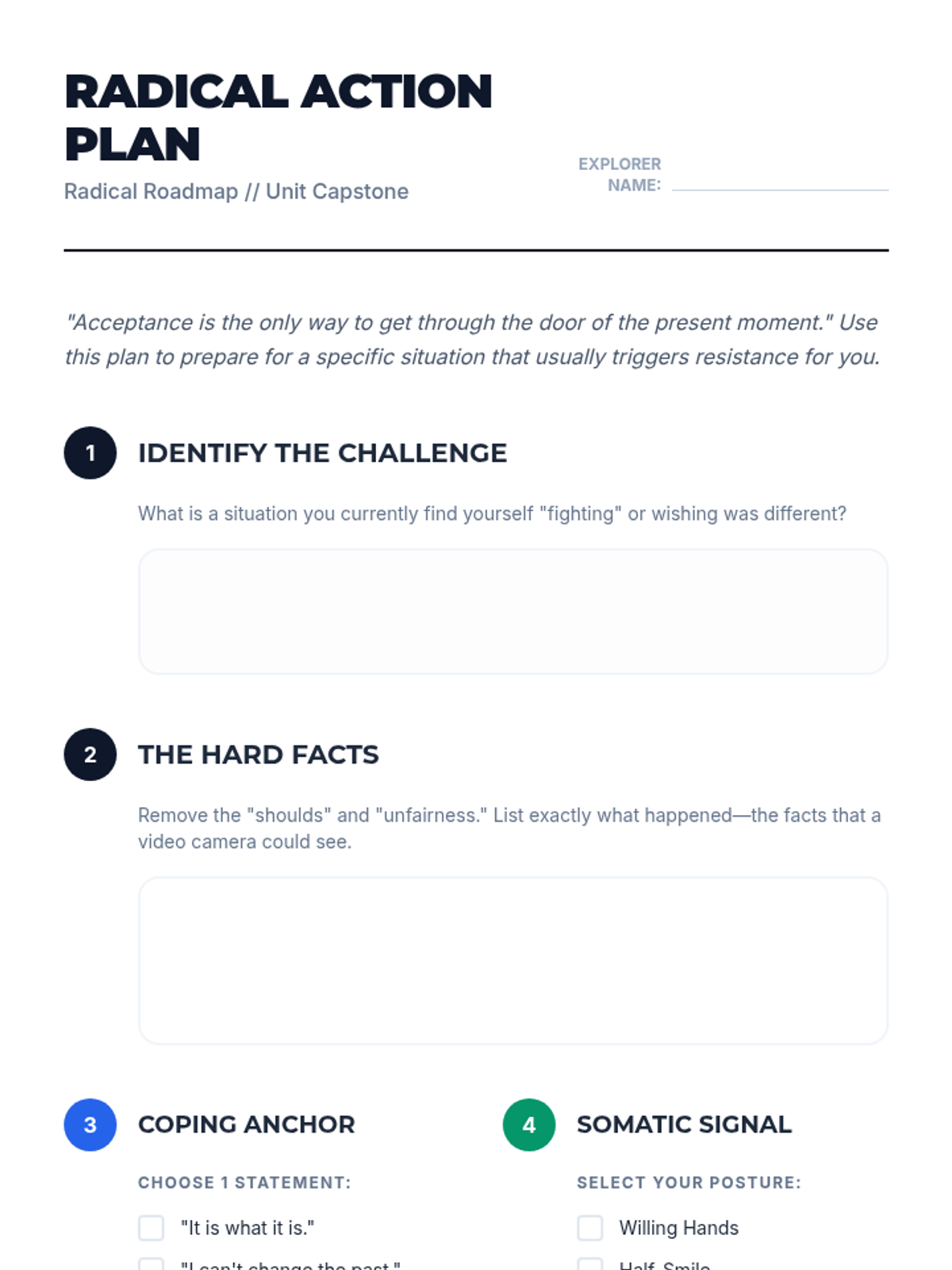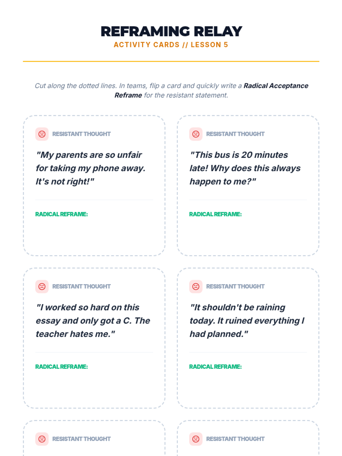 A comprehensive 5-lesson unit for 9th-grade students on the DBT skill of Radical Acceptance. Students learn to distinguish pain from suffering, practice cognitive and somatic acceptance techniques, and build a personalized toolkit for emotional resilience.