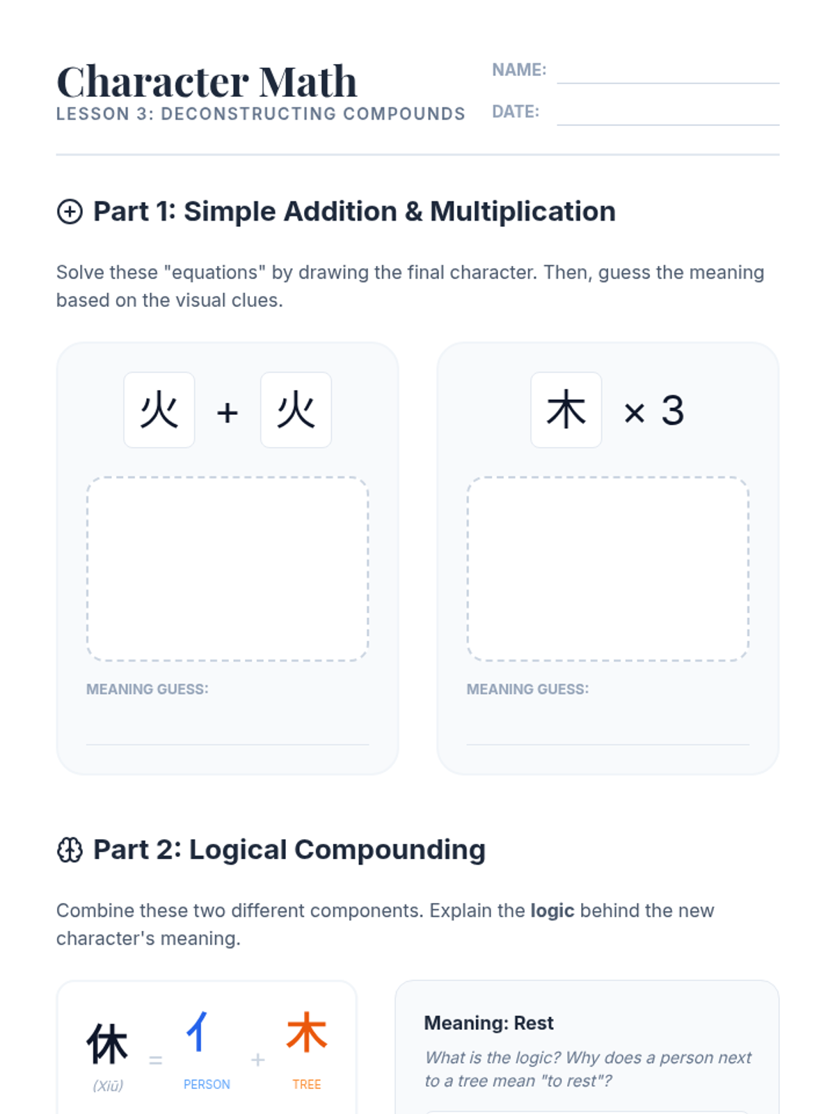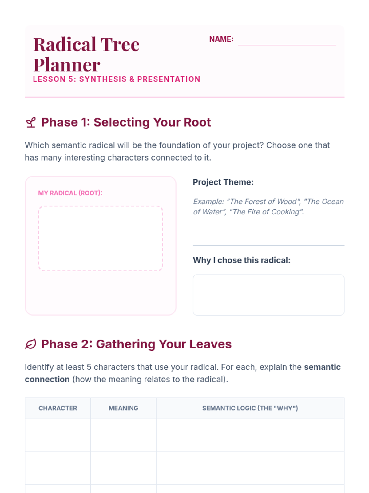 A 5-lesson sequence for 7th-grade students focused on decoding Mandarin Chinese characters through semantic radicals. Students learn to identify nature and human-related components, understand compound character logic, and use radical-based systems for information retrieval.