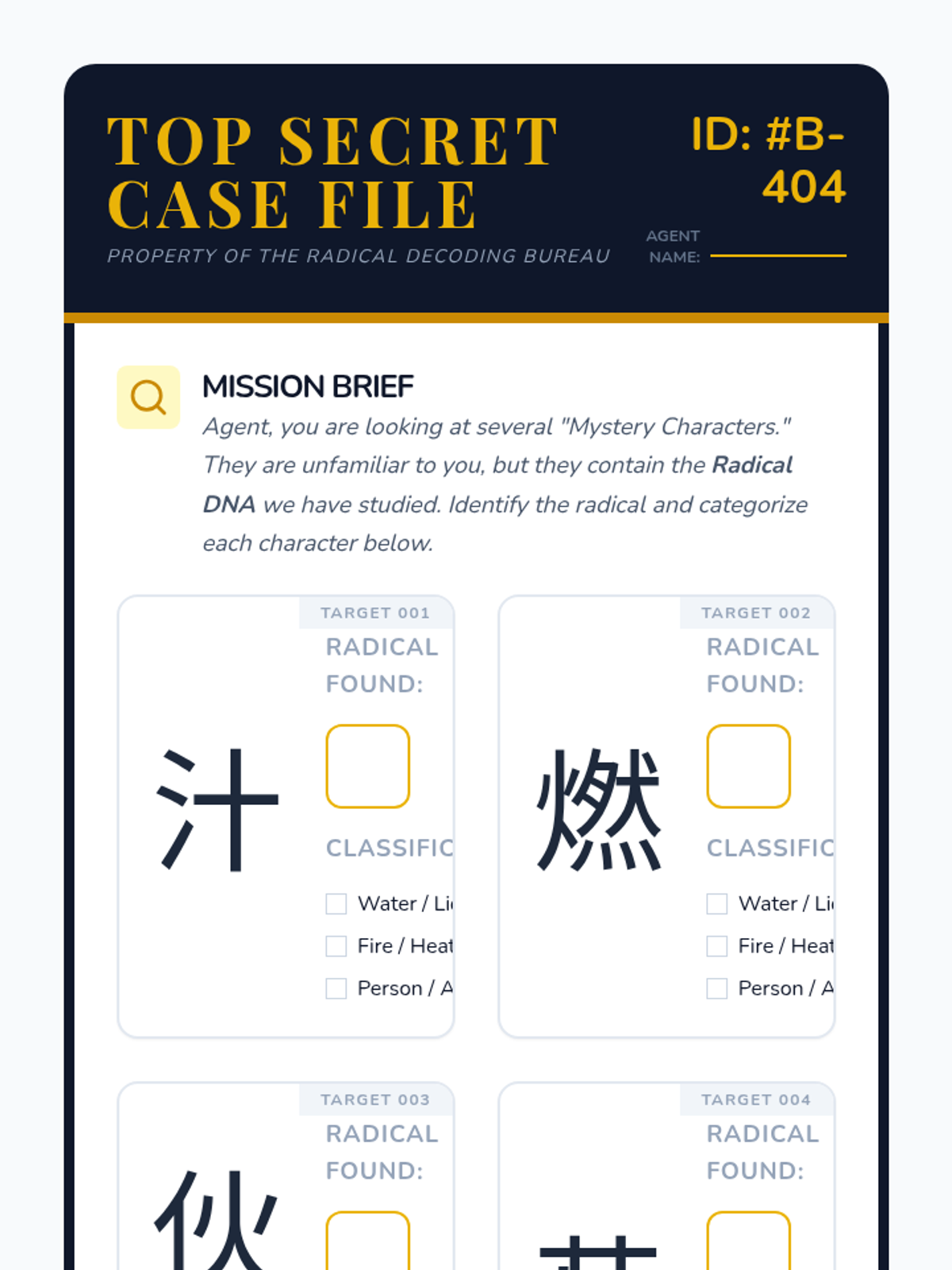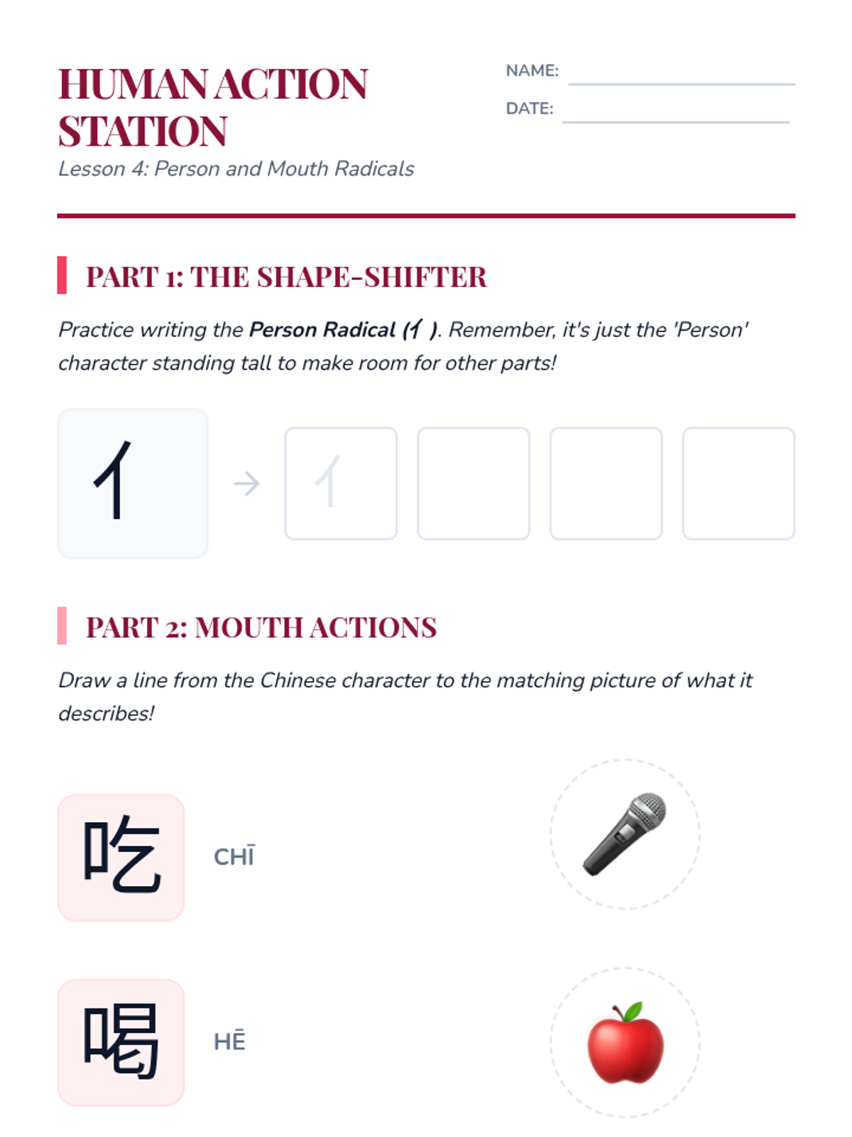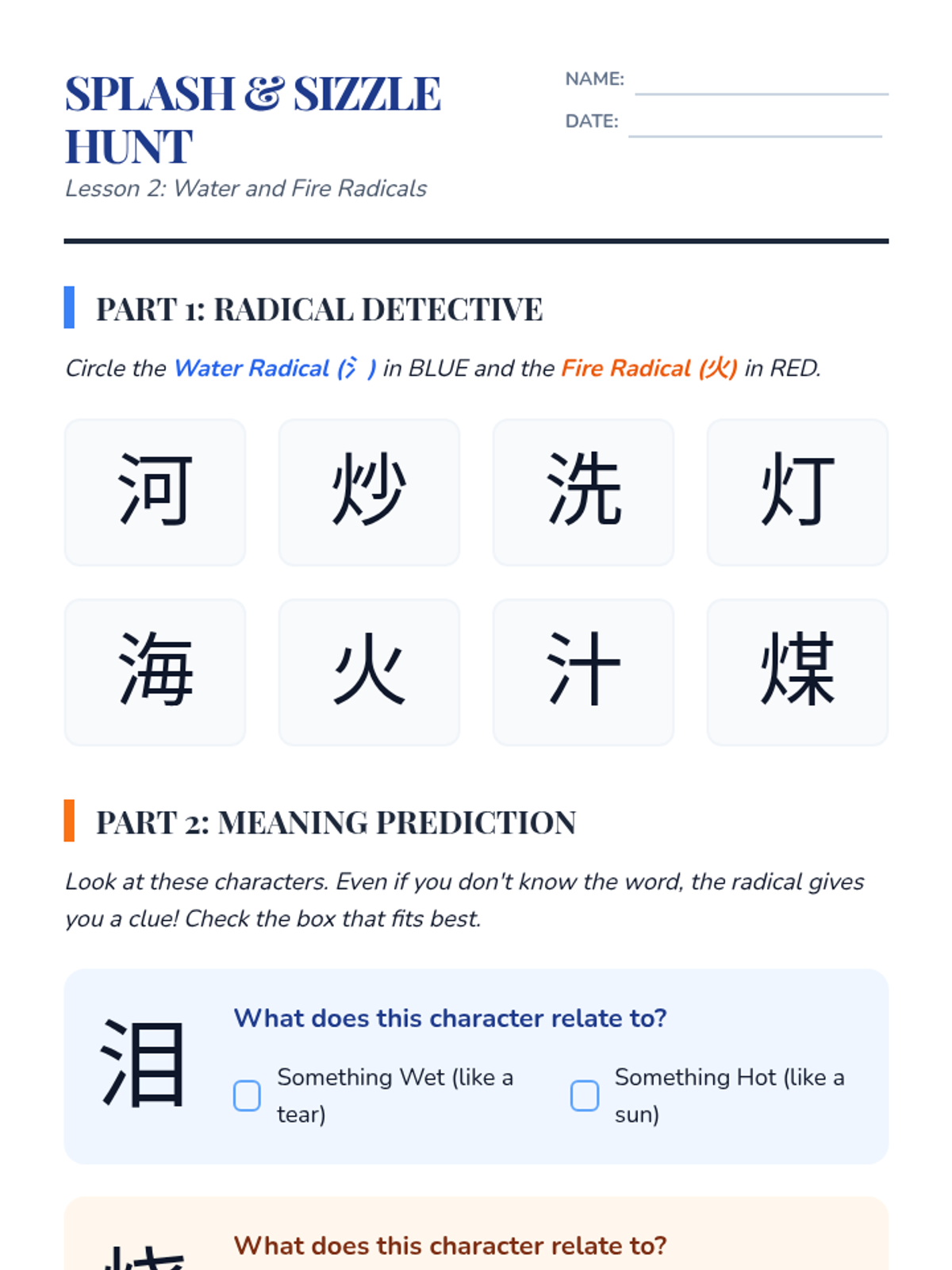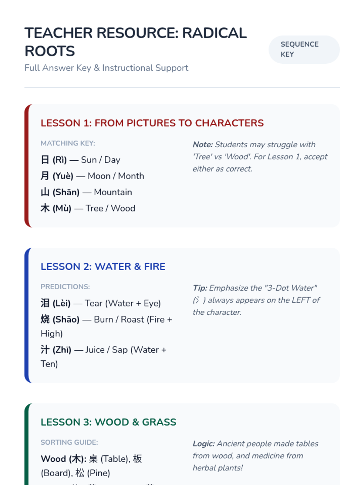 A 5-lesson unit for 4th graders exploring the pictographic origins of Mandarin Chinese characters and how radicals (components) provide clues to meaning. Students will trace the evolution of characters from ancient oracle bone scripts to modern forms and learn to decode new words using common radicals like water, fire, wood, and person.