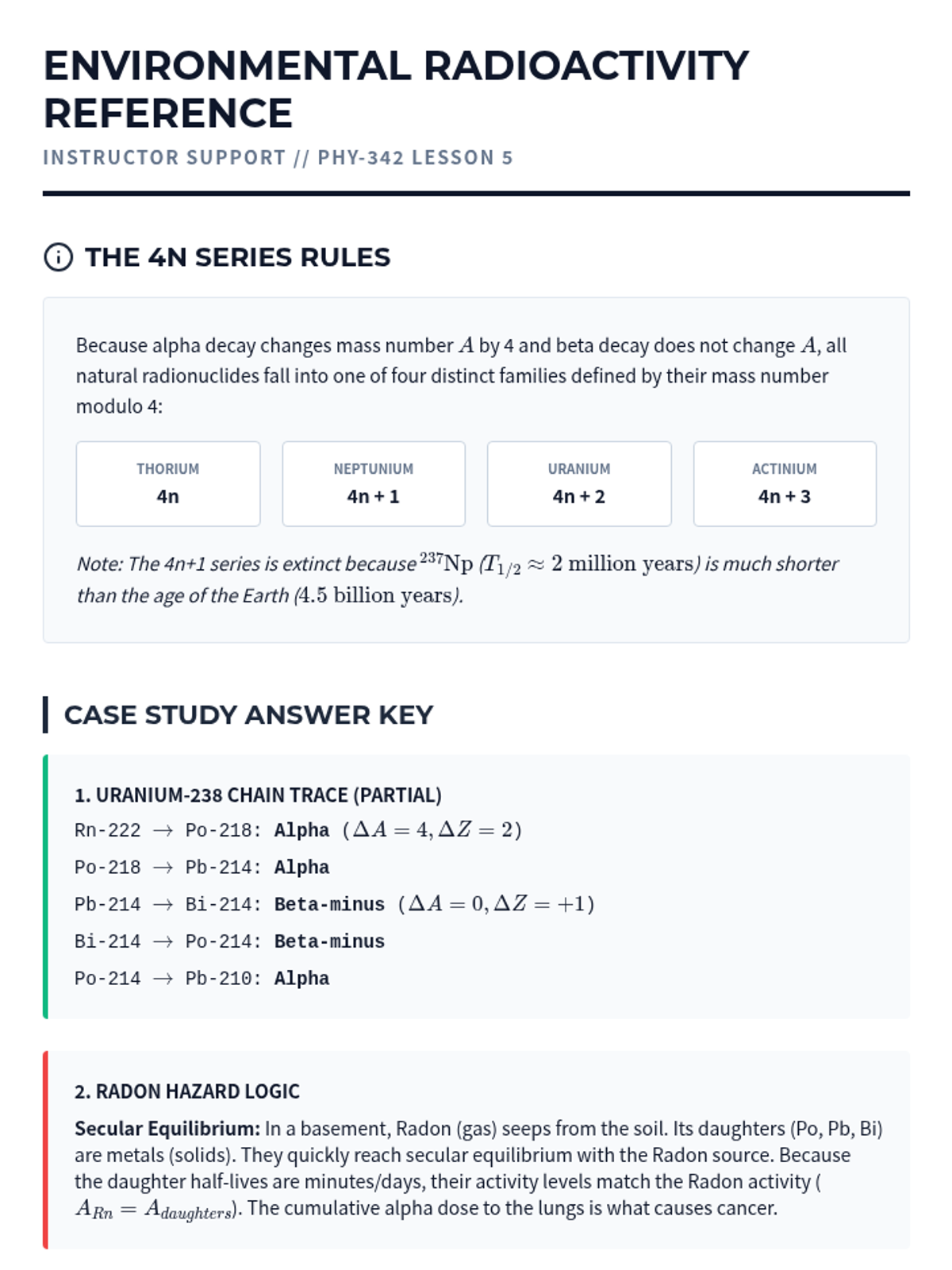 This sequence explores the quantum mechanical mechanisms and mathematical kinetics of radioactive decay. Students will master decay laws, solve multi-step decay chains, and investigate the physics of alpha, beta, and gamma transitions, culminating in an analysis of natural decay series and secular equilibrium.