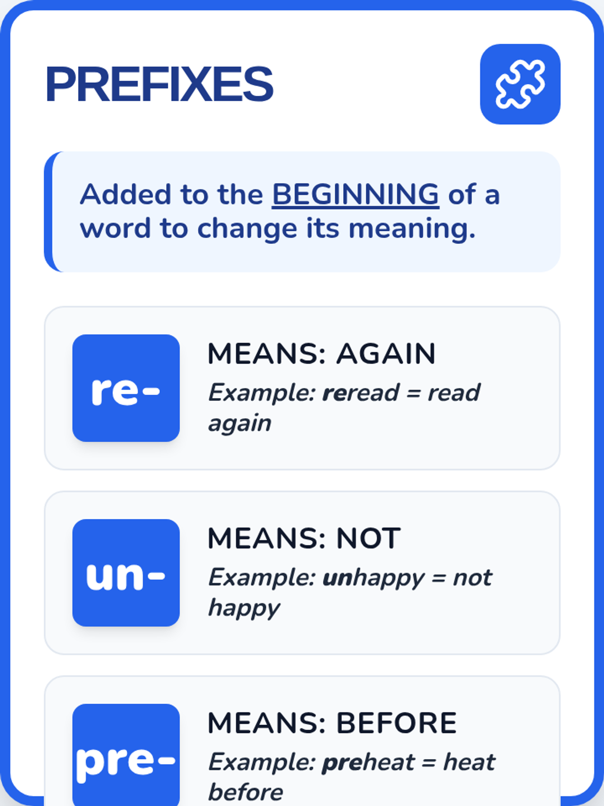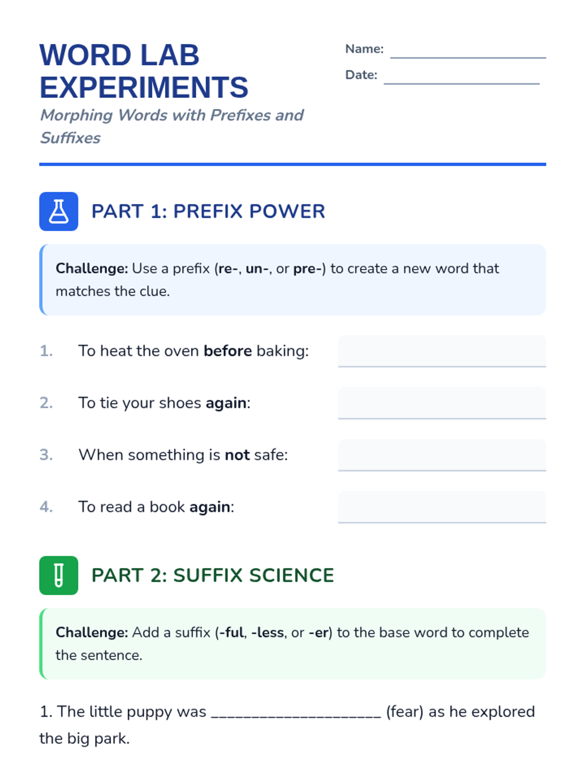 A 5-day intensive focus on common prefixes (re-, un-, pre-) and suffixes (-ly, -y) through daily interactive review slides, movement-based games, and lab-themed practice activities.