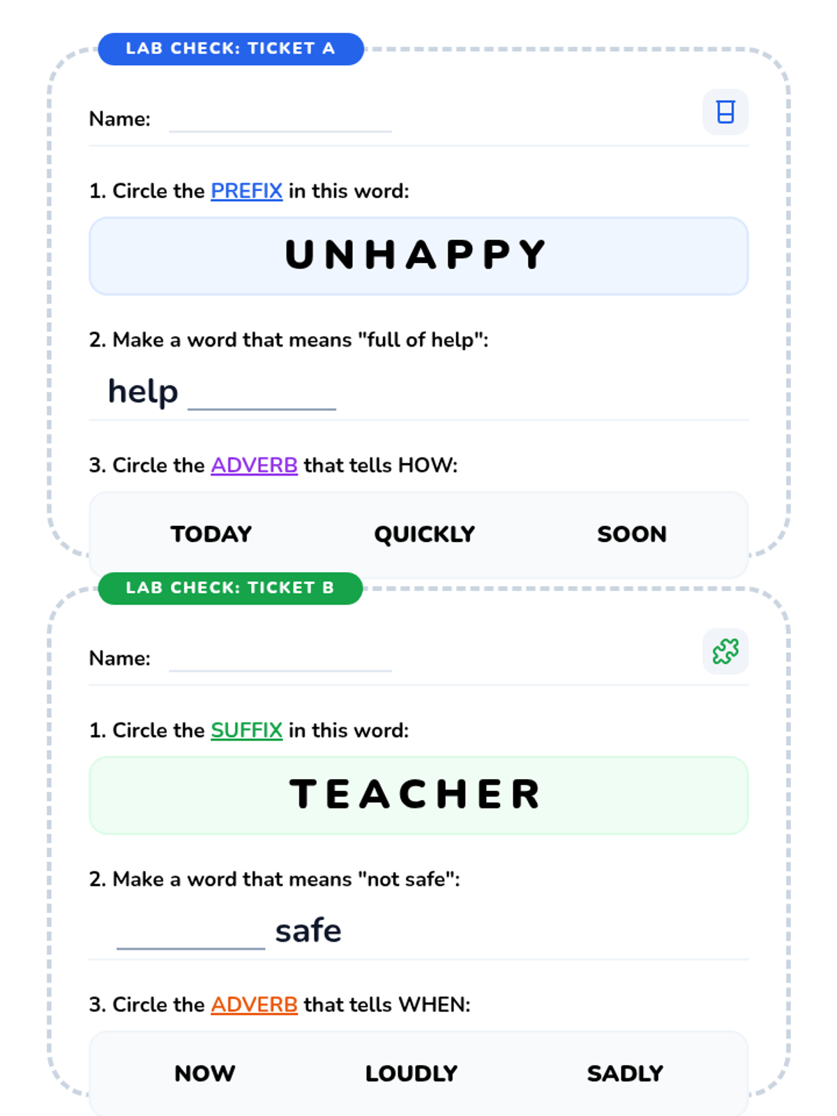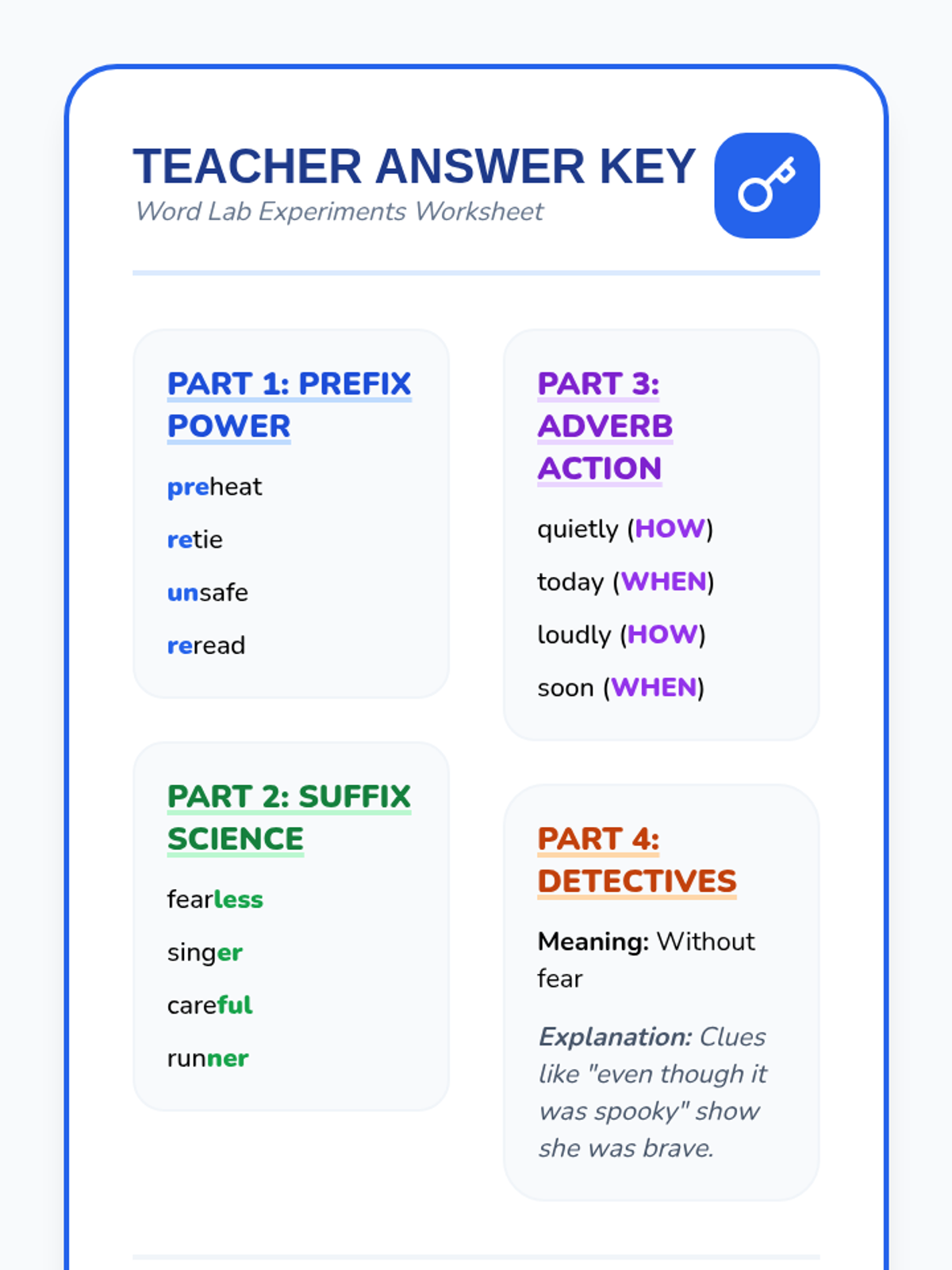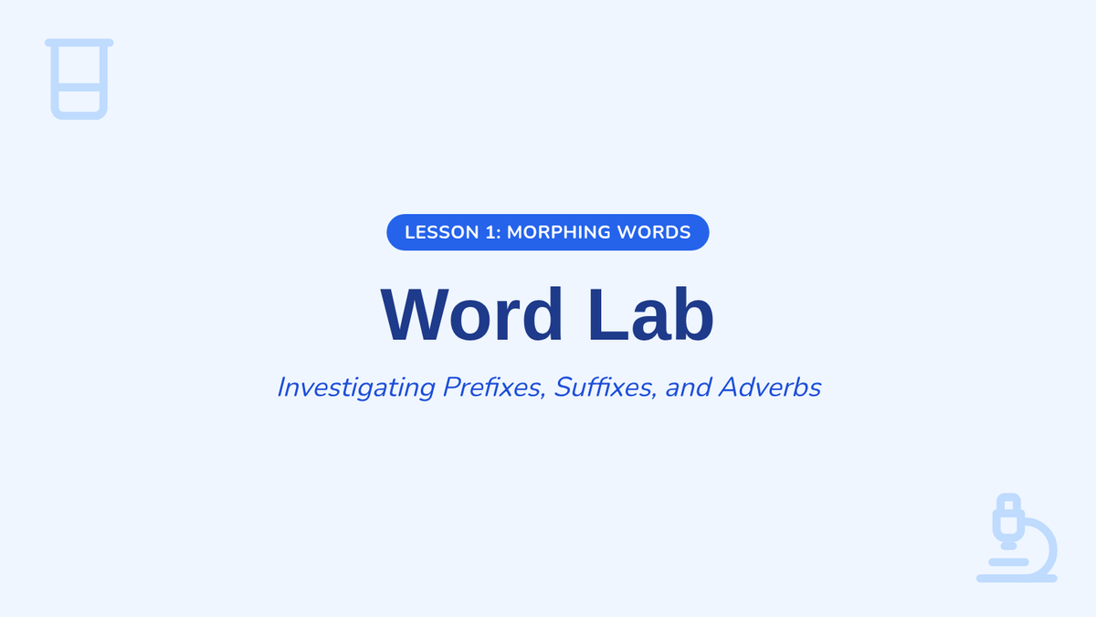 A foundational language arts sequence for 2nd graders focusing on word morphology (prefixes and suffixes) and parts of speech (adverbs), using a laboratory-themed investigative approach to help students decode meaning.