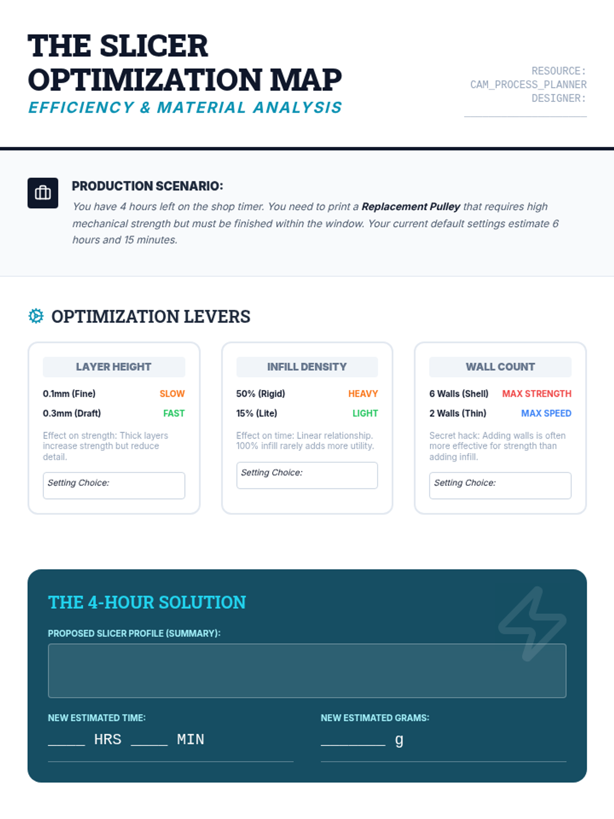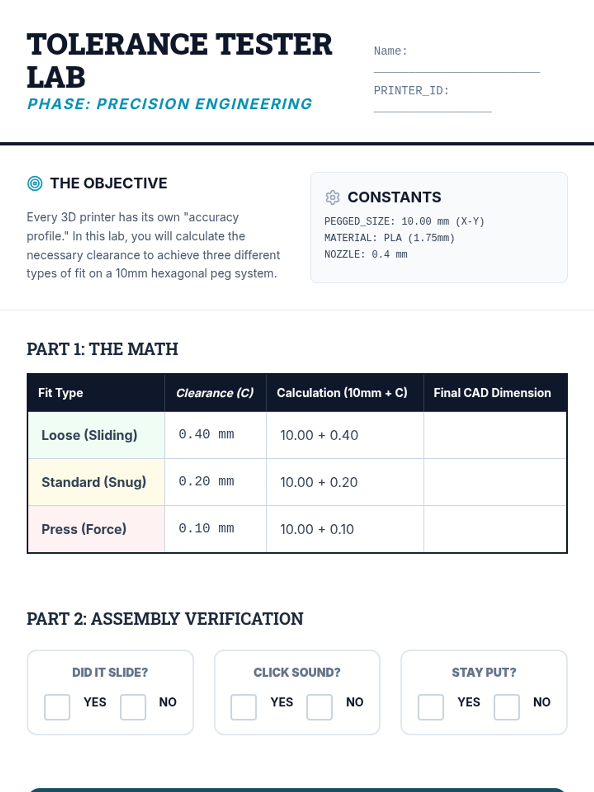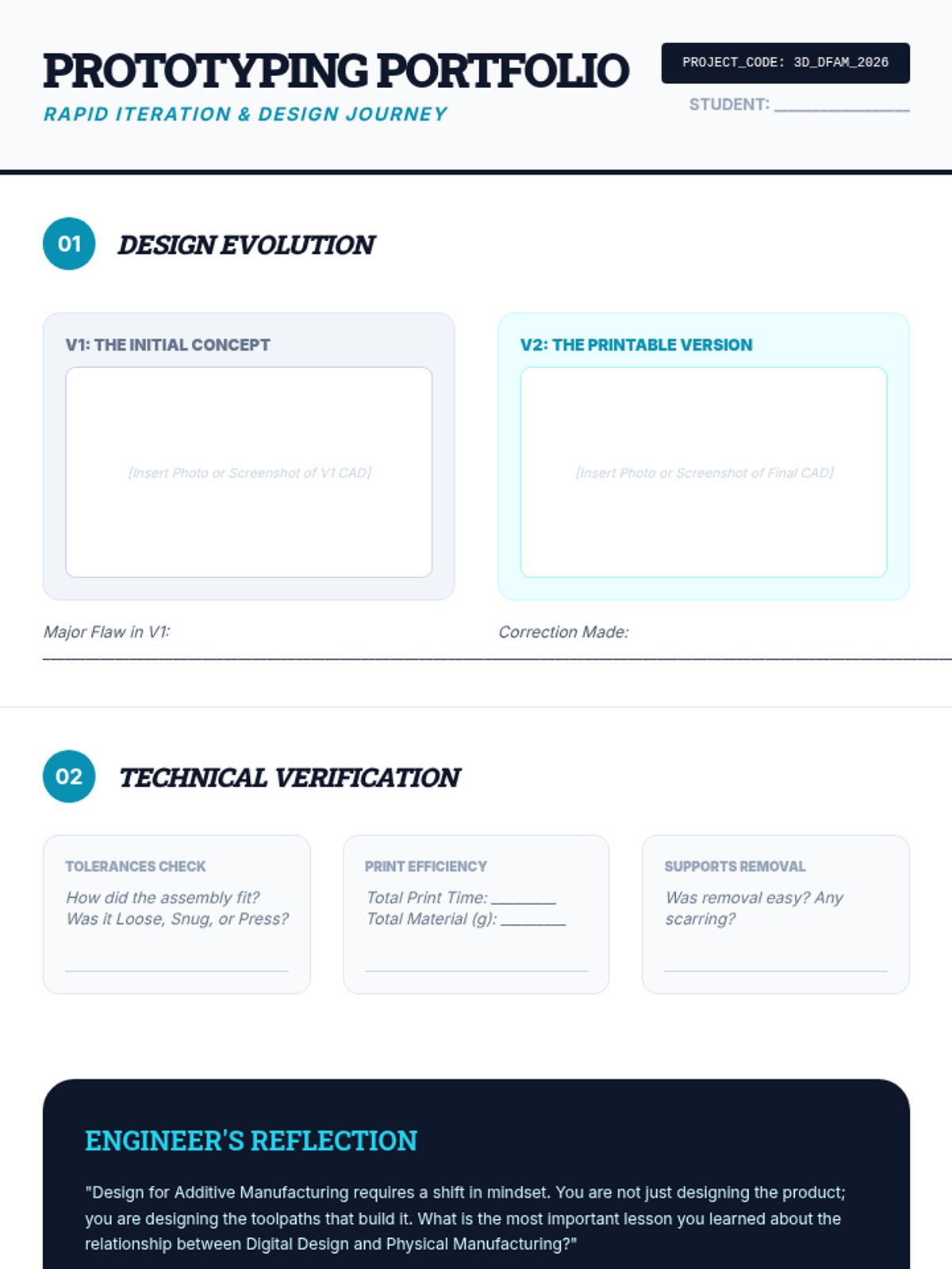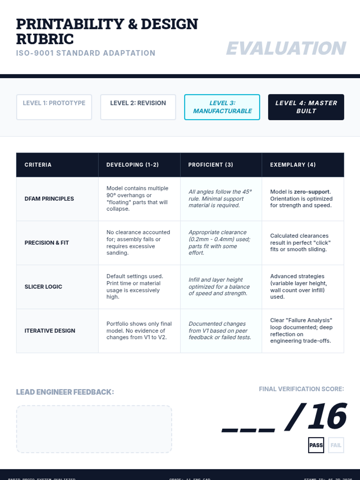 A project-oriented sequence for 11th-grade engineering students focusing on Design for Additive Manufacturing (DFAM), tolerances, slicing, and iterative CAD design. Students move from analyzing print failures to creating a fully documented, printable 3D model.