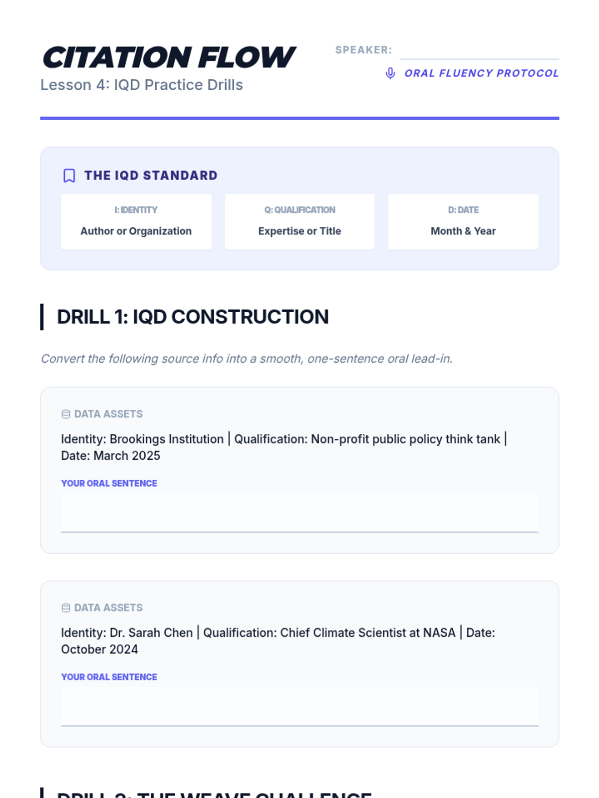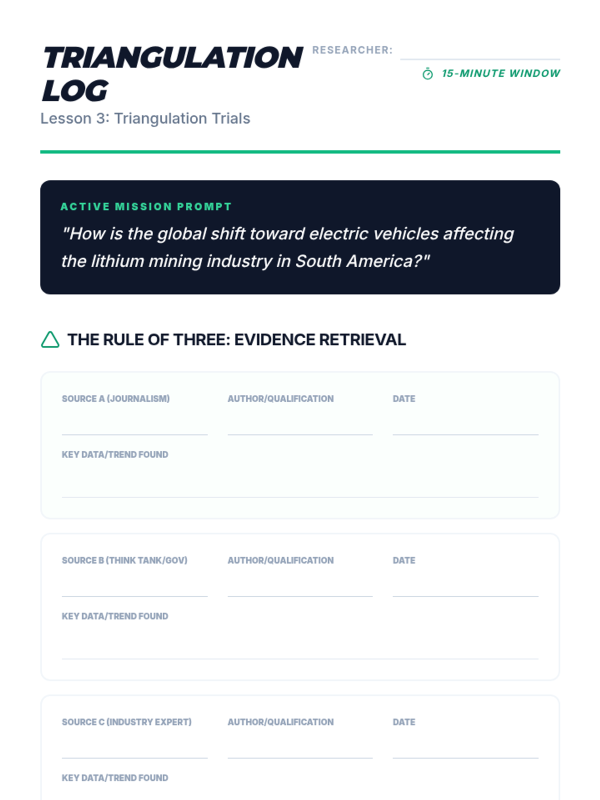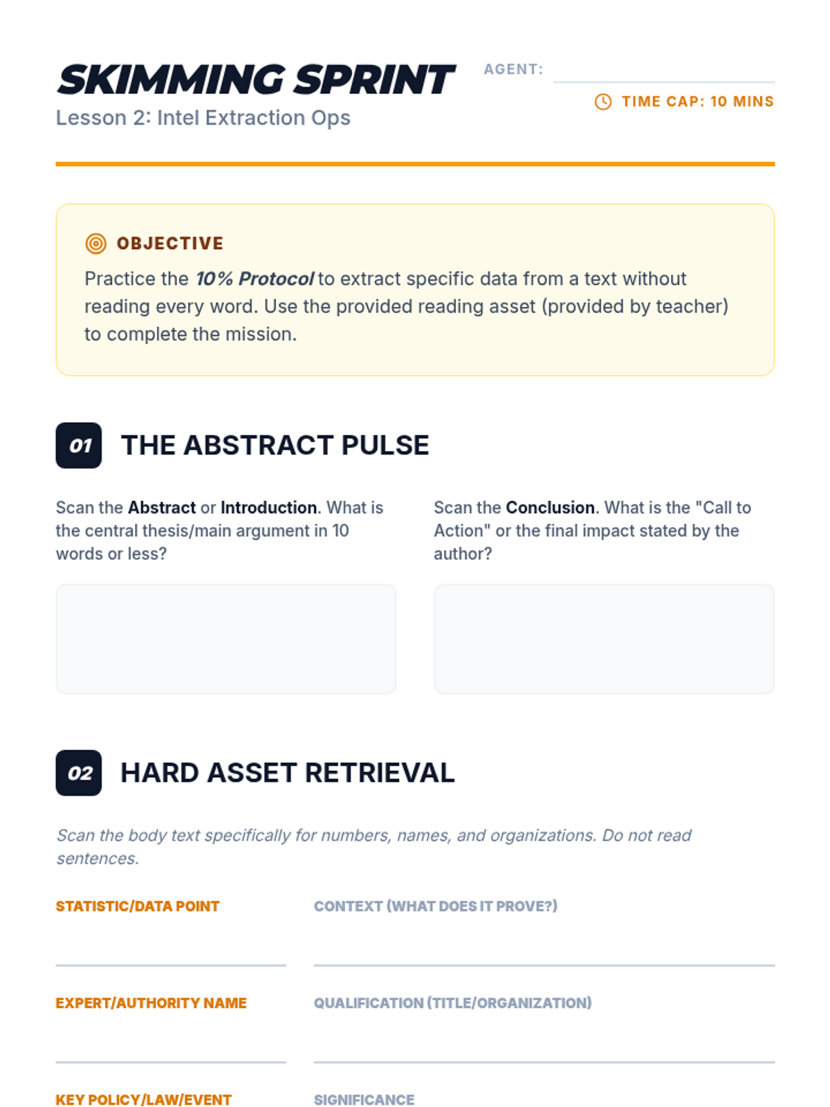 A game-based sequence for 9th-grade students to master rapid keyword generation, skimming techniques, information extraction, and oral citation fluency under time-pressure environments like Extemporaneous Speaking.