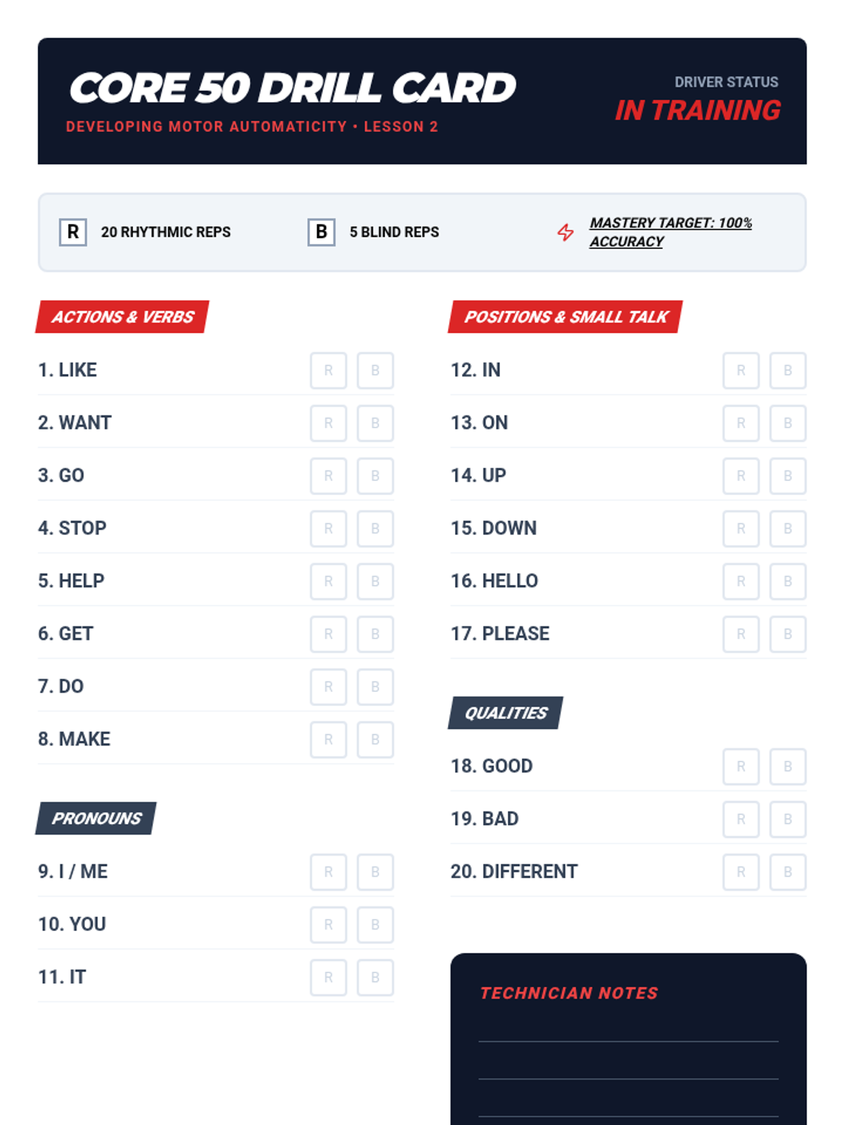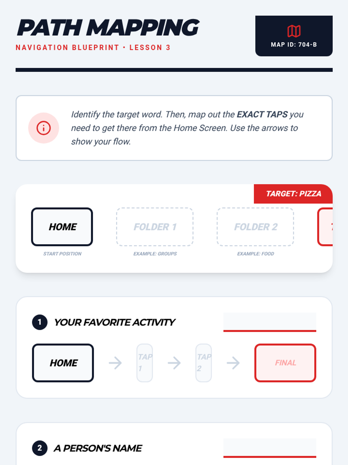 A specialized training sequence for 12th-grade AAC users to transition from visual scanning to motor automaticity. Students use racing-themed drills and gamified challenges to build muscle memory for core vocabulary and folder navigation, culminating in high-speed communication fluency.
