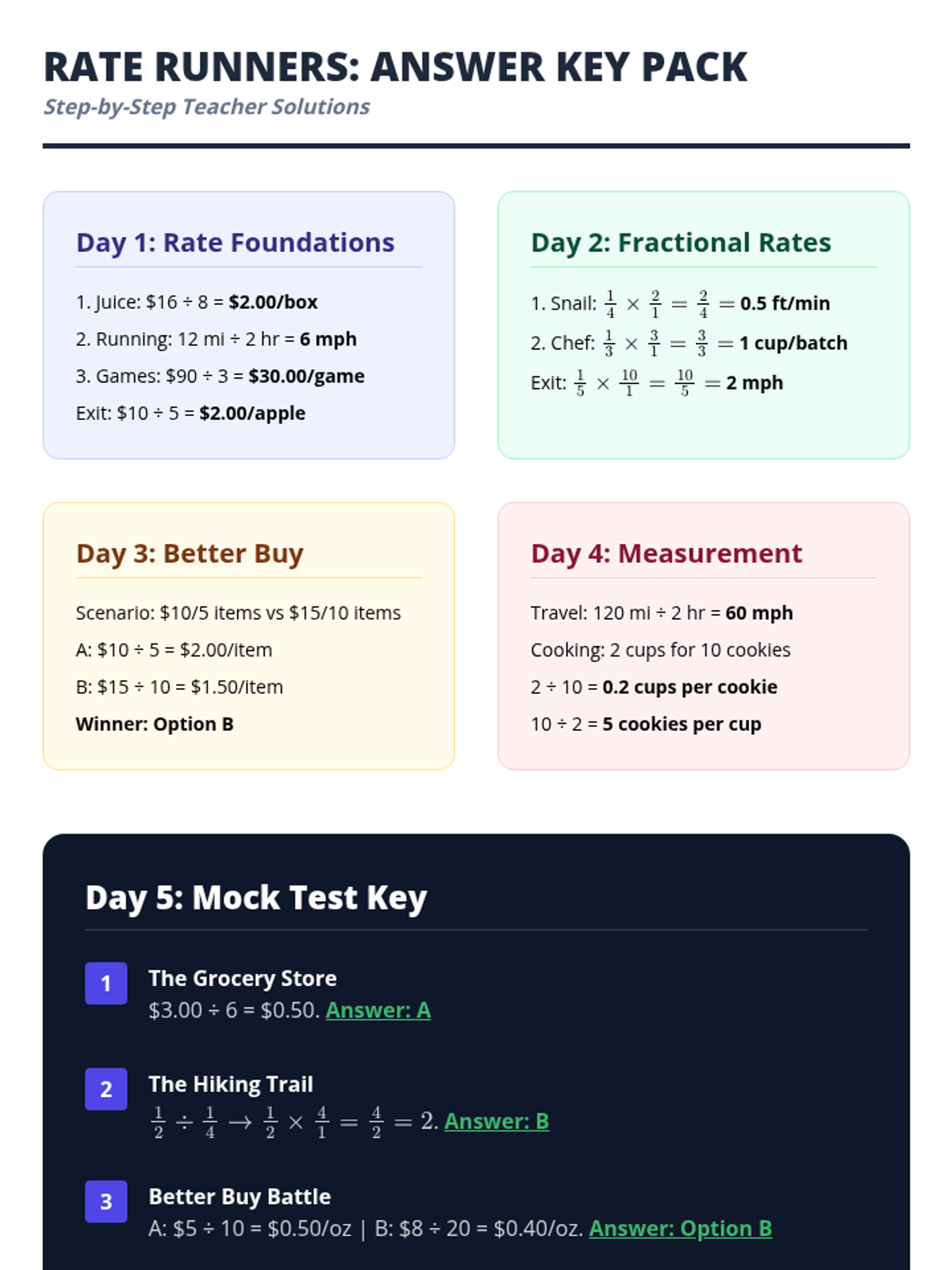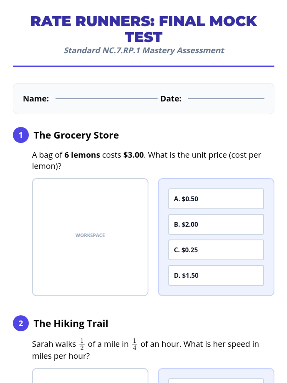A 5-day intensive test prep unit for NC.7.RP.1 focused on unit rates. Designed specifically for special education resource rooms with heavy scaffolding, visual aids, and real-world shopping and measurement applications.