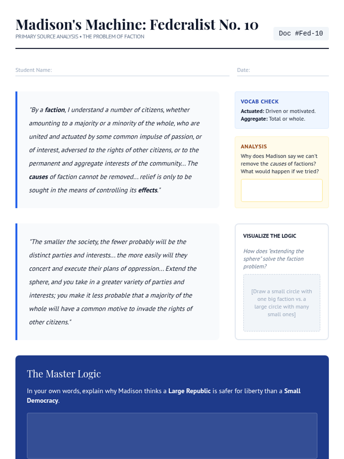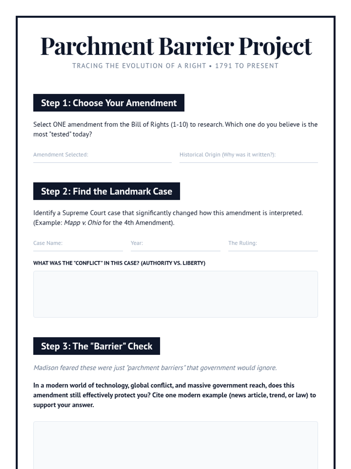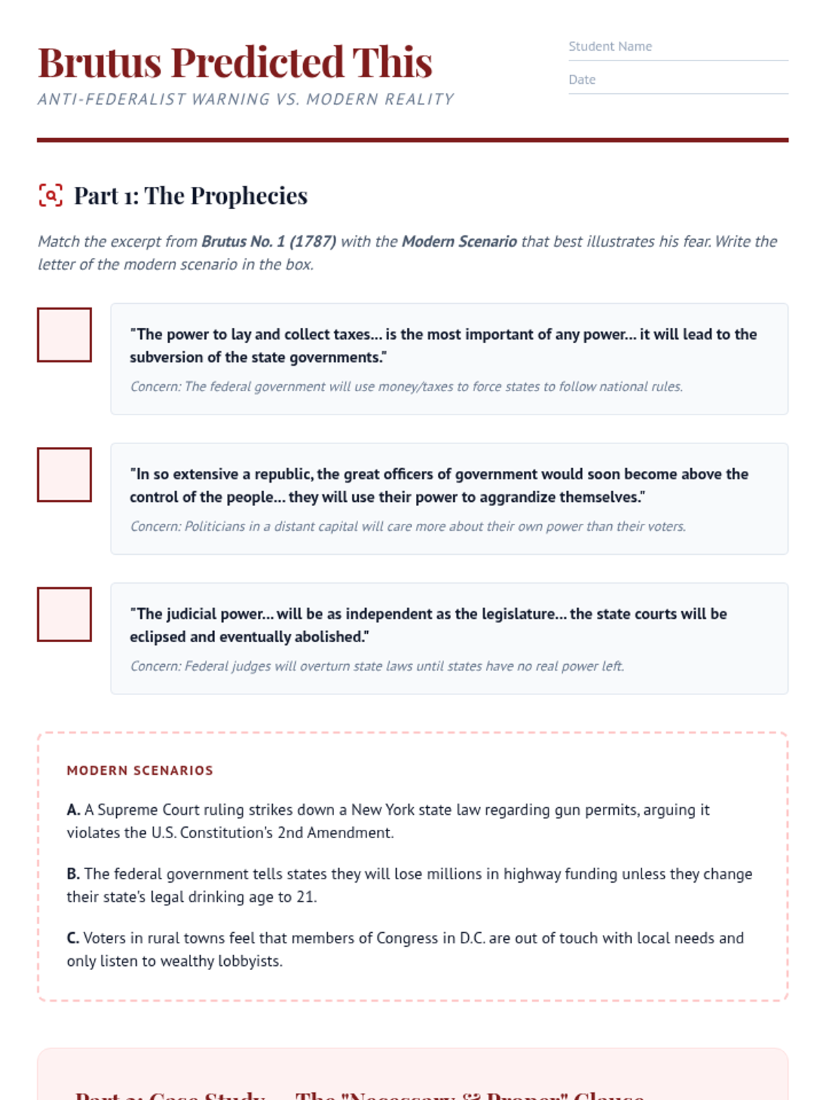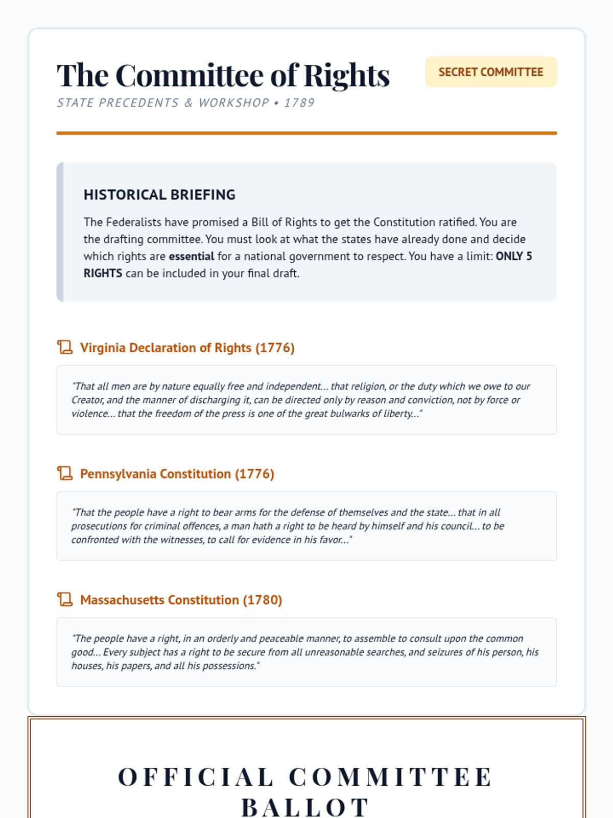 This sequence explores the intense ideological divide between Federalists and Anti-Federalists during the ratification of the U.S. Constitution. Students analyze primary sources like the Federalist Papers and Brutus No. 1, ultimately evaluating how the resulting Bill of Rights continues to shape the balance between federal power and individual liberty.