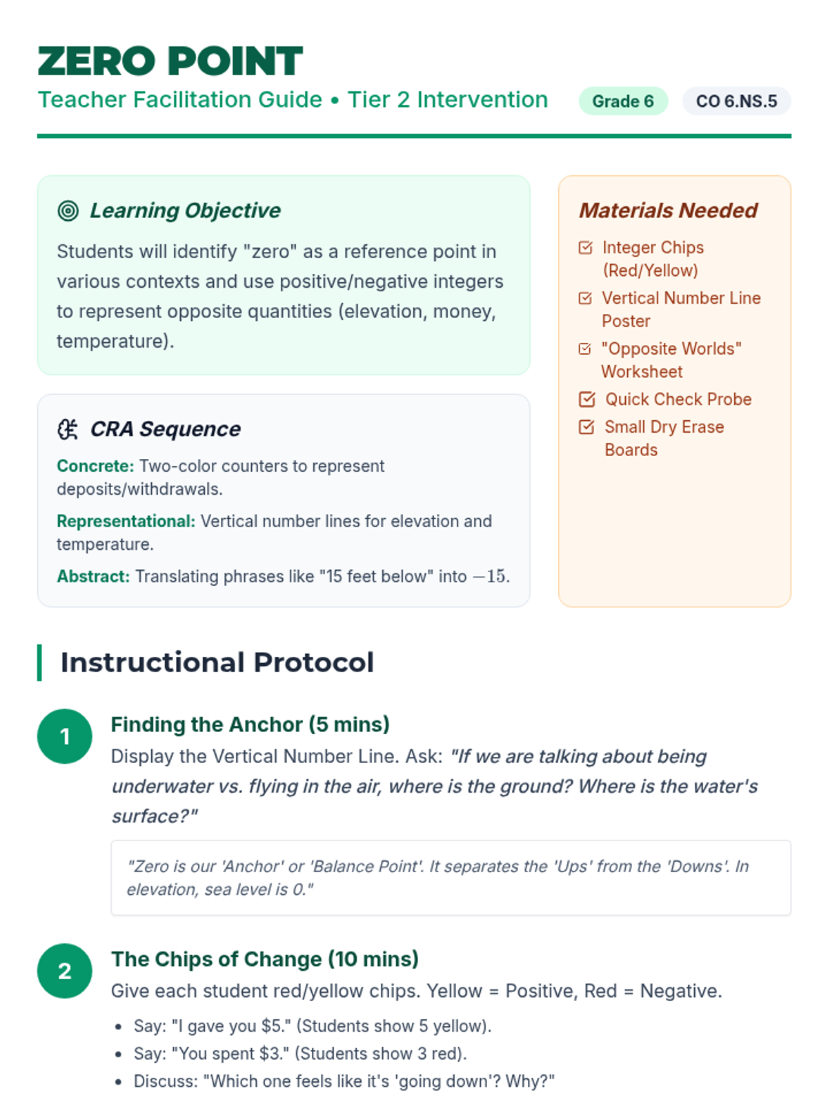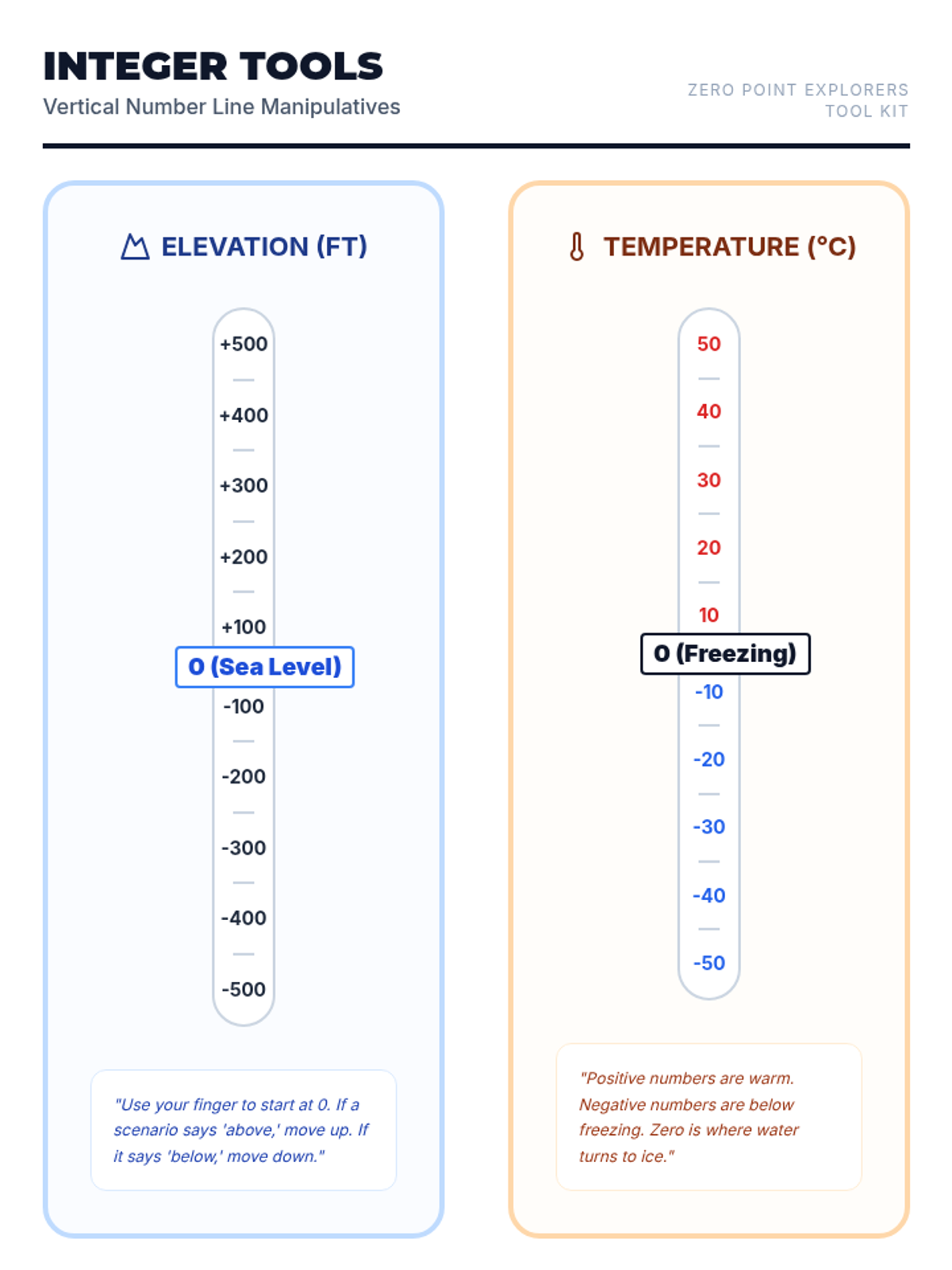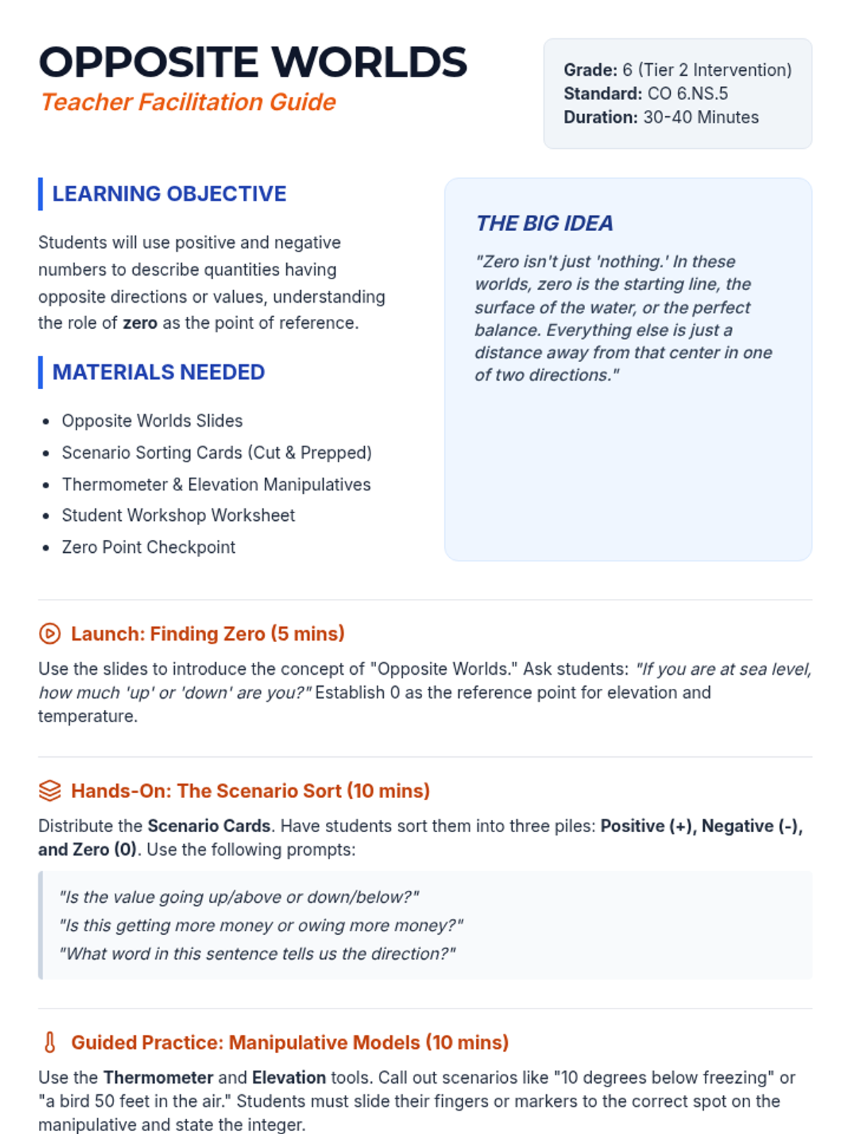 A Tier 2 intervention sequence focused on understanding integers as opposite quantities in real-world contexts, aligned with CO 6.NS.5. Students explore temperature, elevation, and finance using concrete and visual models.