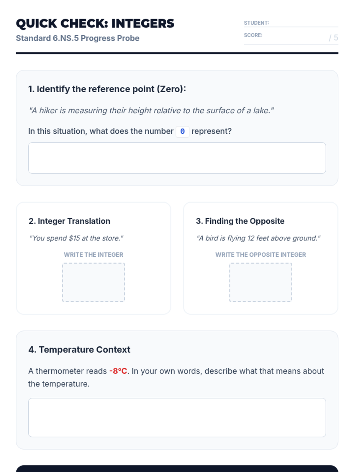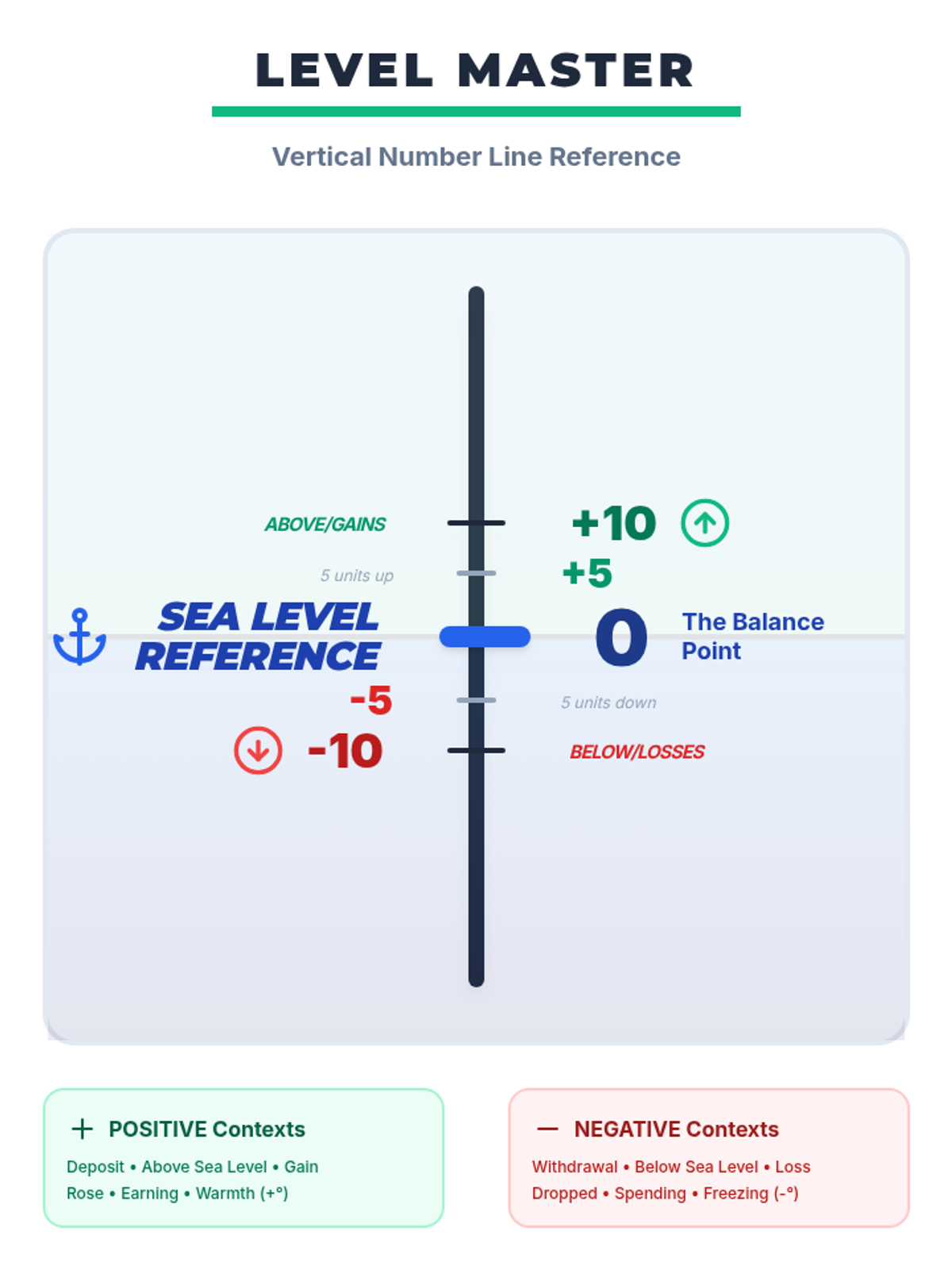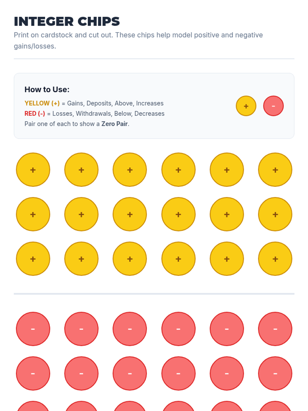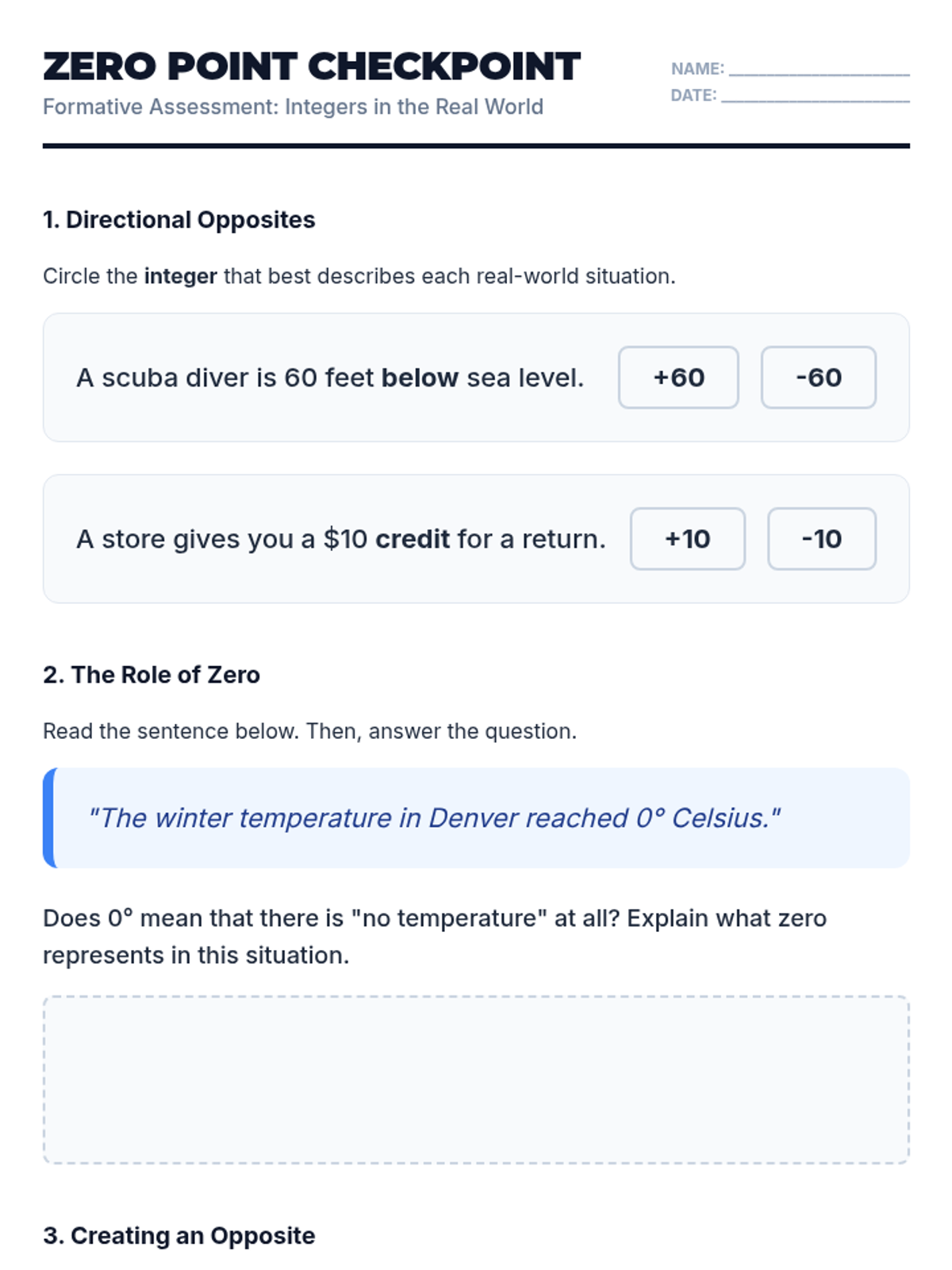 A Tier 2 intervention sequence focused on understanding integers as opposite quantities in real-world contexts, aligned with CO 6.NS.5. Students explore temperature, elevation, and finance using concrete and visual models.