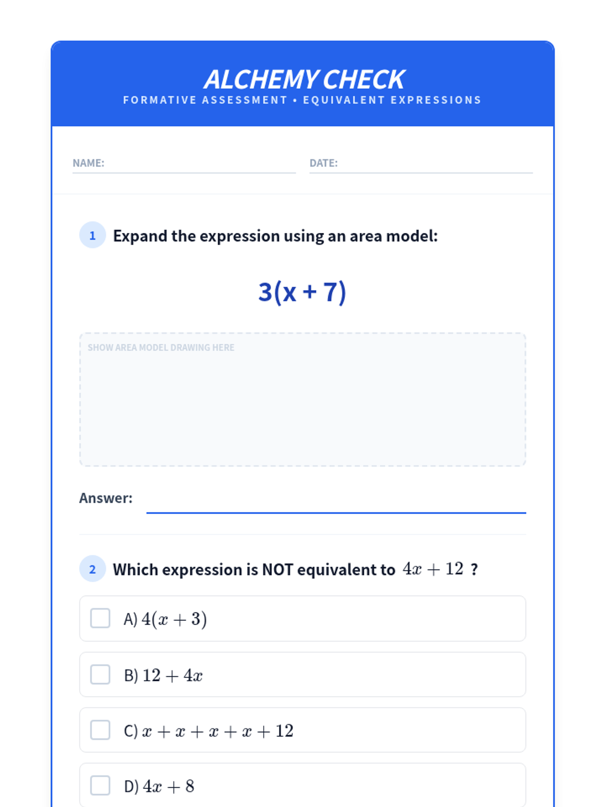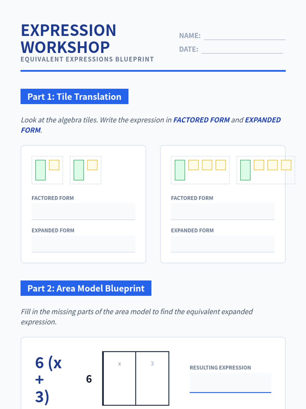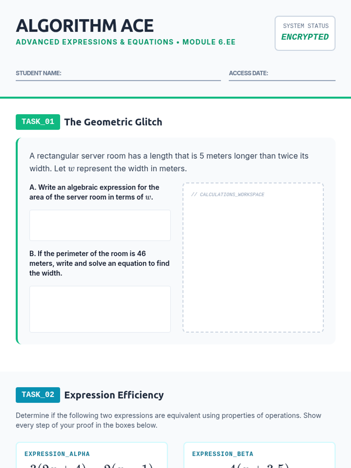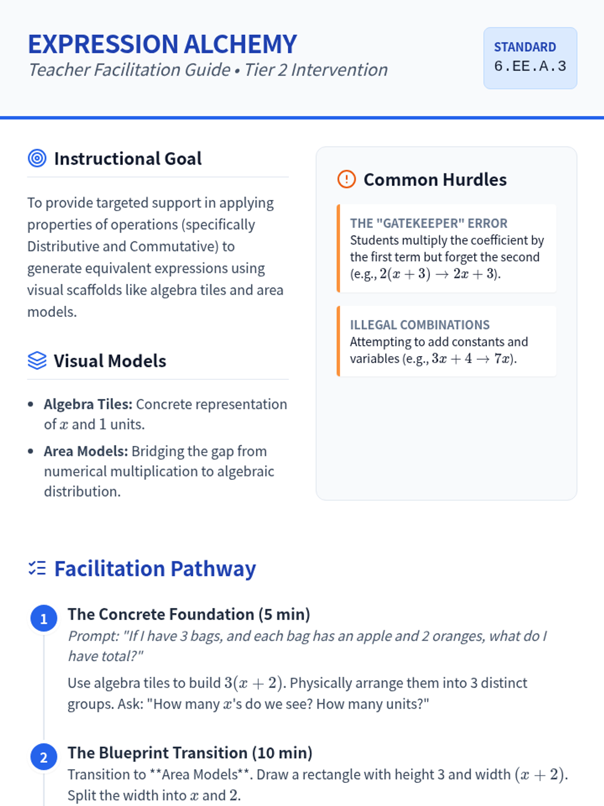 A targeted intervention sequence for Grade 6 students focused on generating equivalent expressions using the properties of operations. This unit utilizes visual models like area models and algebra tiles to build conceptual understanding of the distributive property and combining like terms.