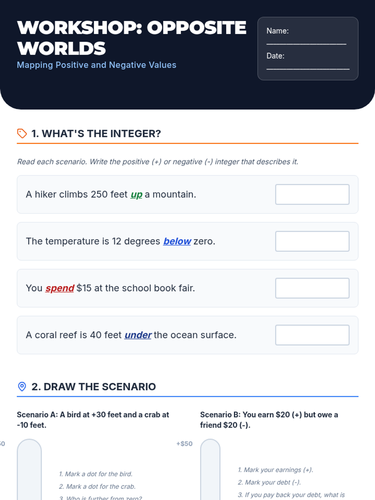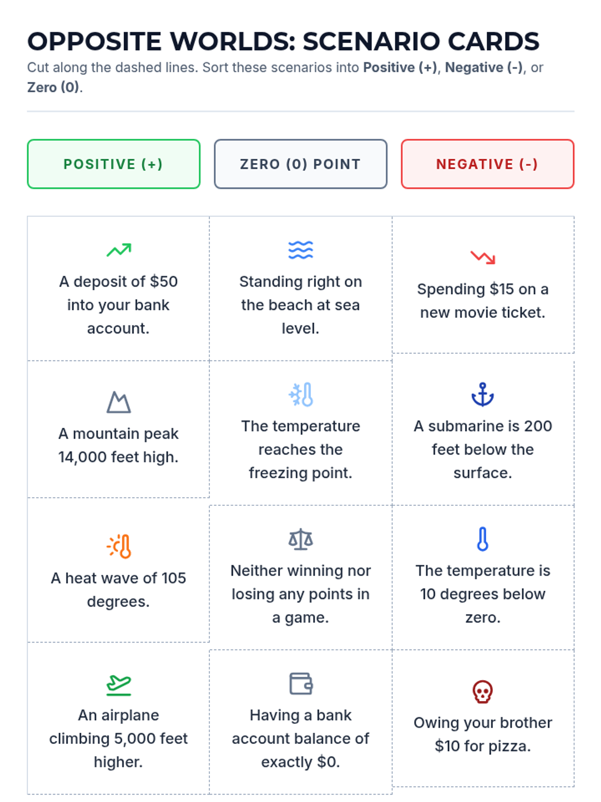 A small group intervention sequence focused on understanding integers through real-world opposites like elevation, temperature, and finance. Students explore the meaning of zero and how positive and negative values represent directional change.