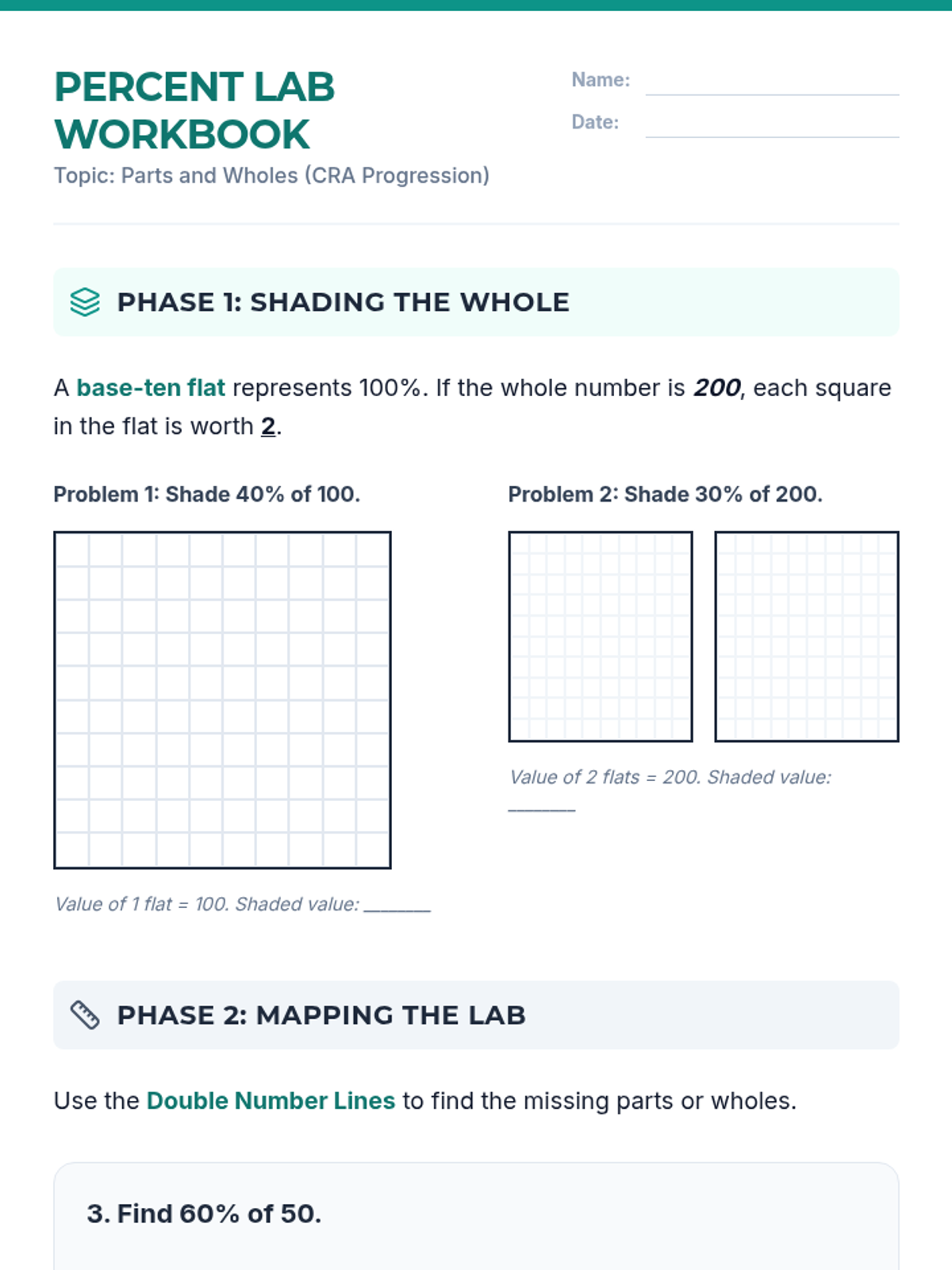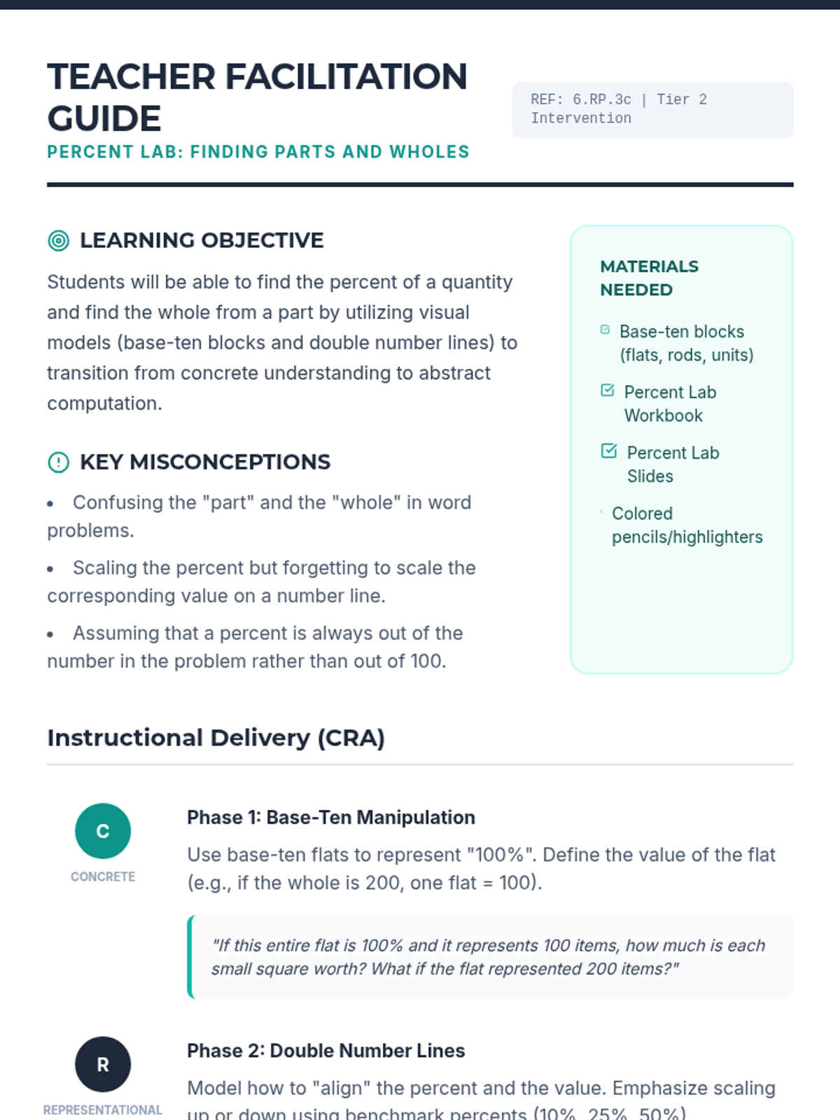 A targeted Tier 2 intervention sequence for 6th grade students focusing on understanding percents as rates per 100 and solving problems involving finding the part and the whole. The sequence utilizes a Concrete-Representational-Abstract (CRA) approach to build conceptual understanding before moving to procedural fluency.