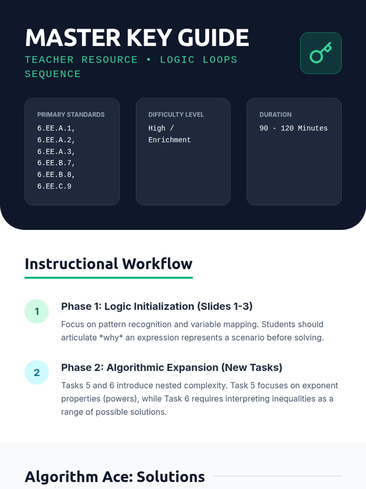 A series of high-level enrichment activities for 6th-grade students to master expressions and equations through logic puzzles and real-world modeling.