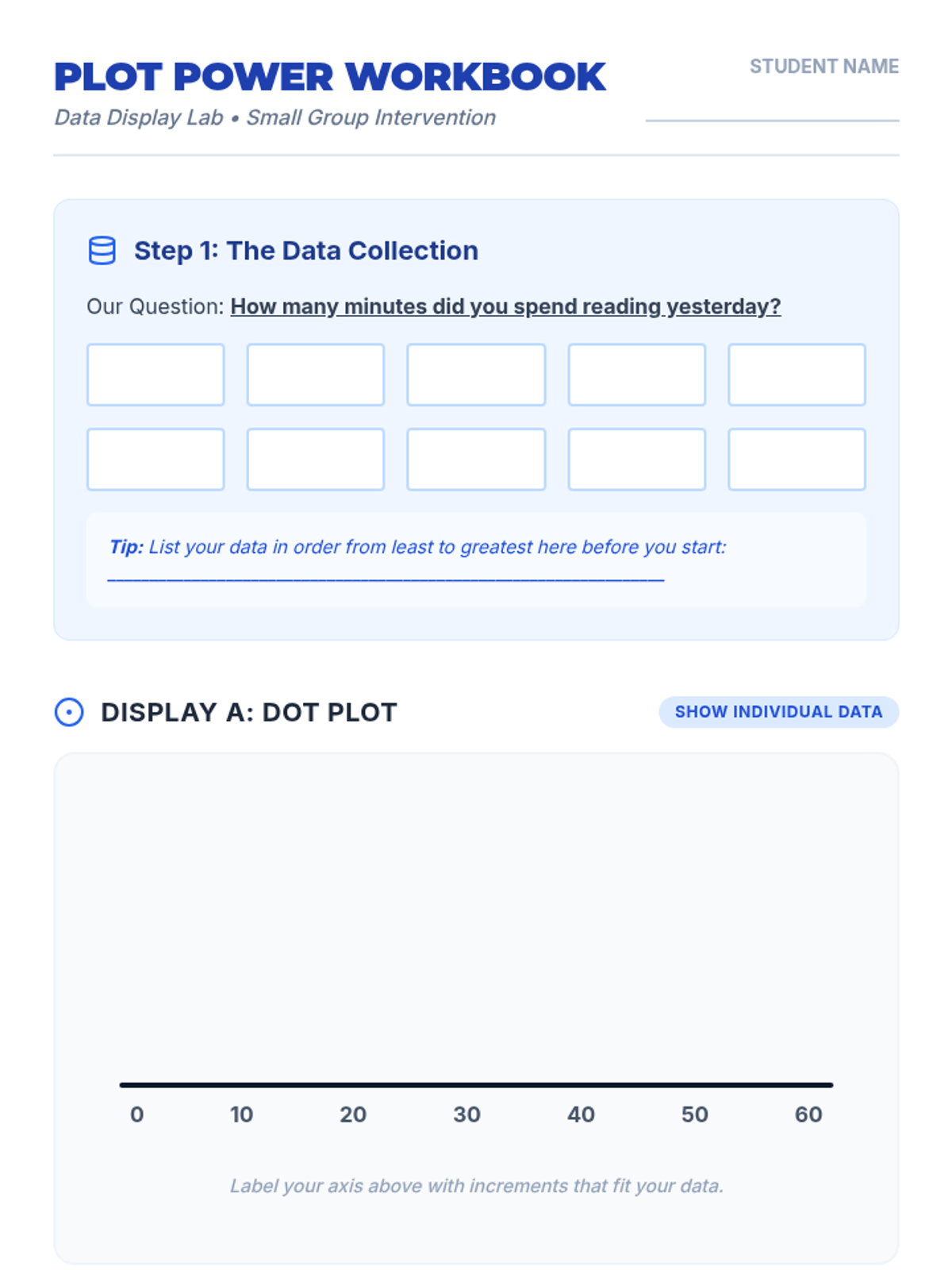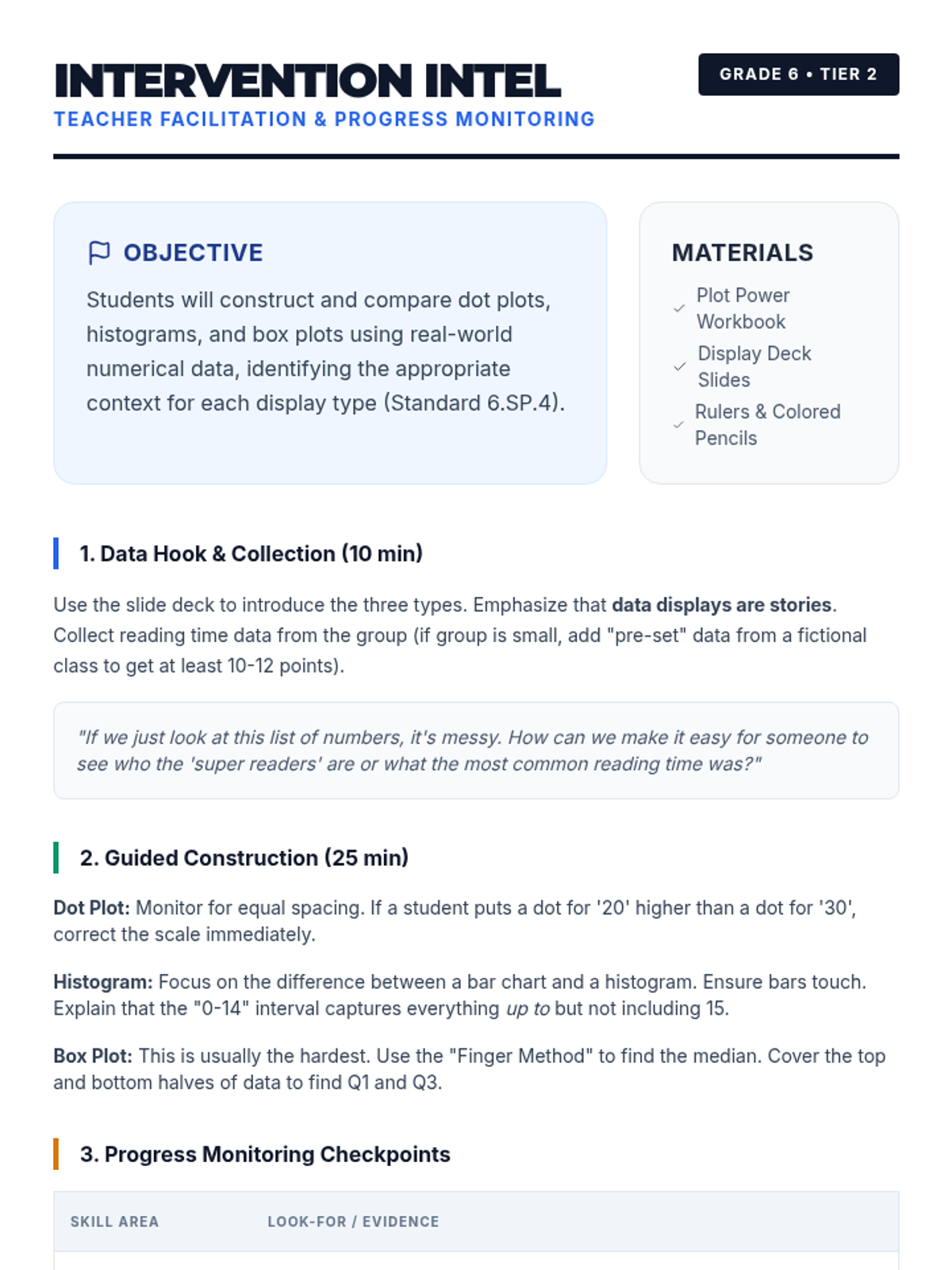 A targeted intervention sequence for 6th-grade students to master the construction and interpretation of dot plots, histograms, and box plots through hands-on data collection and analysis.