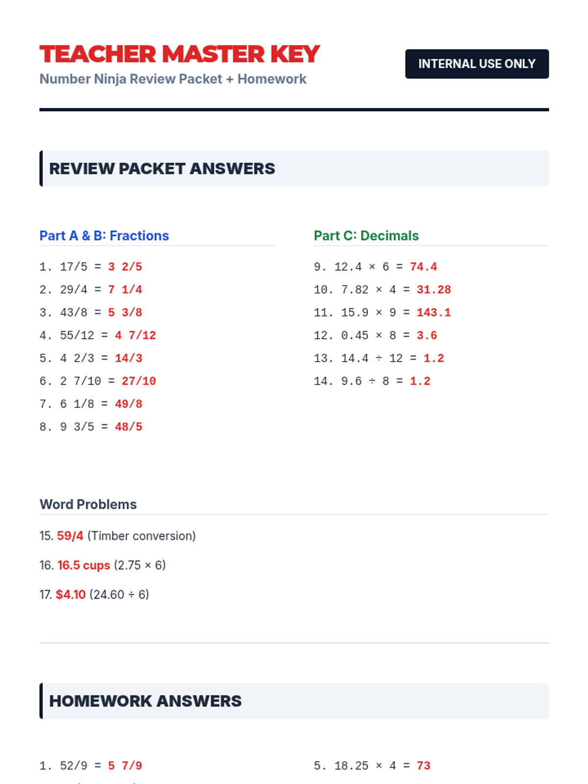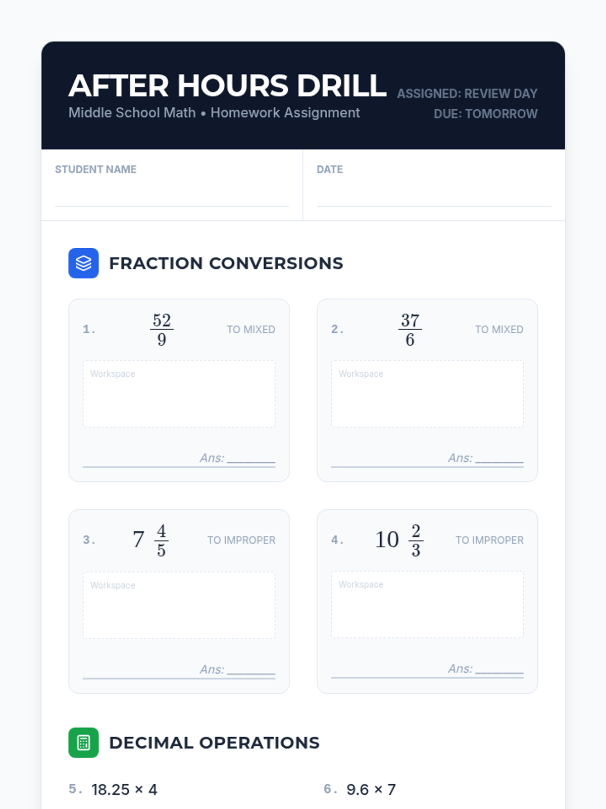 A comprehensive math review sequence focusing on foundational middle school skills including fraction conversions and decimal operations. This unit is designed to bridge conceptual understanding with procedural fluency.