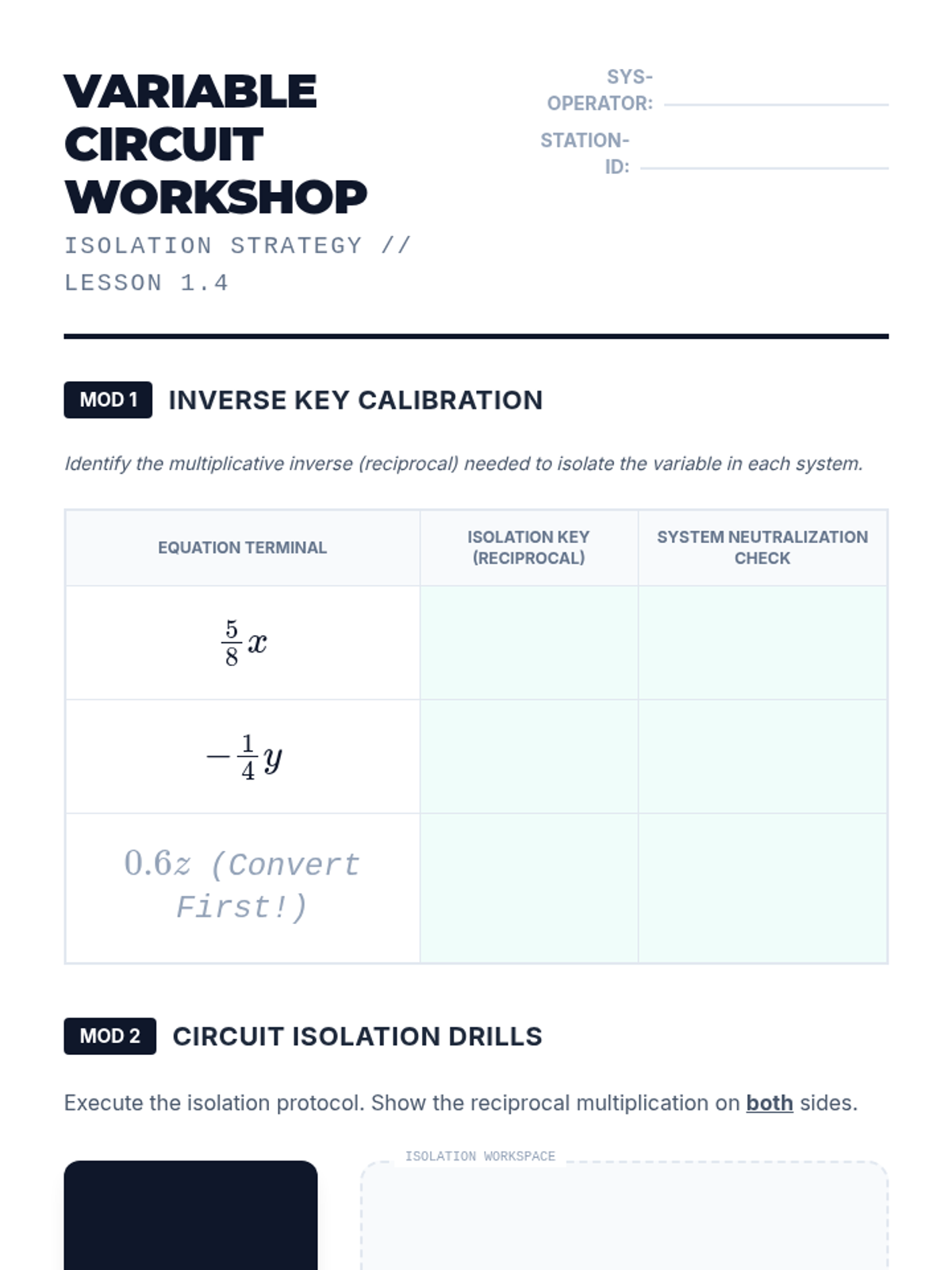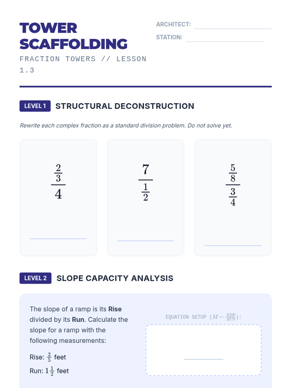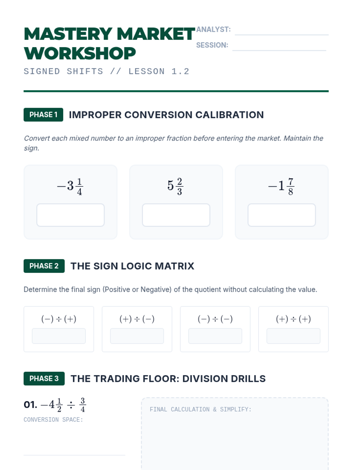 A comprehensive 8th-grade math sequence that bridges the gap between basic fraction division and algebraic reasoning. It covers visual proofs, rational number rules, complex fractions, fractional coefficients in equations, and real-world rate applications.