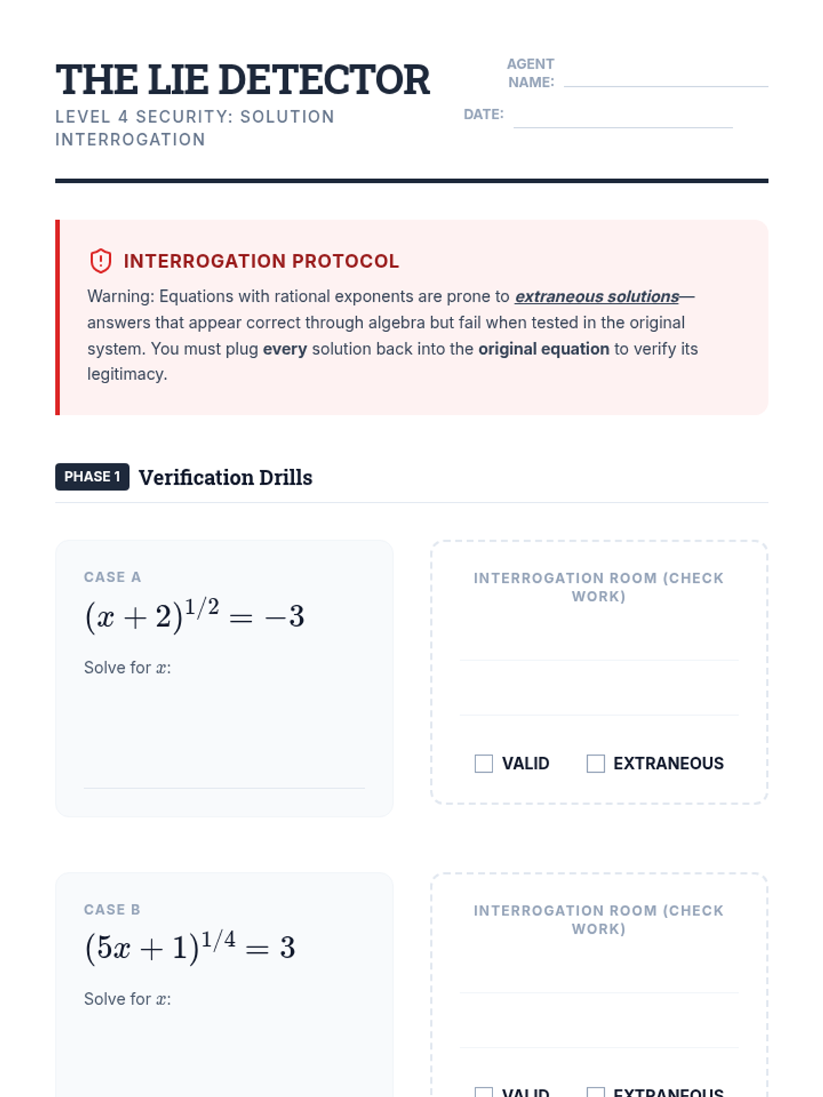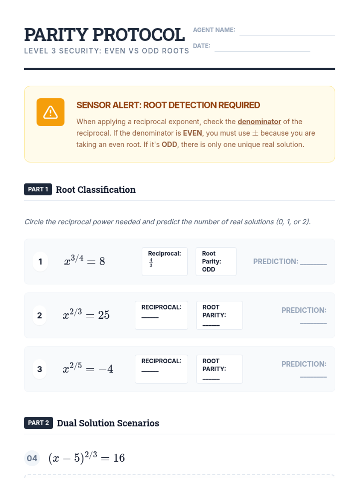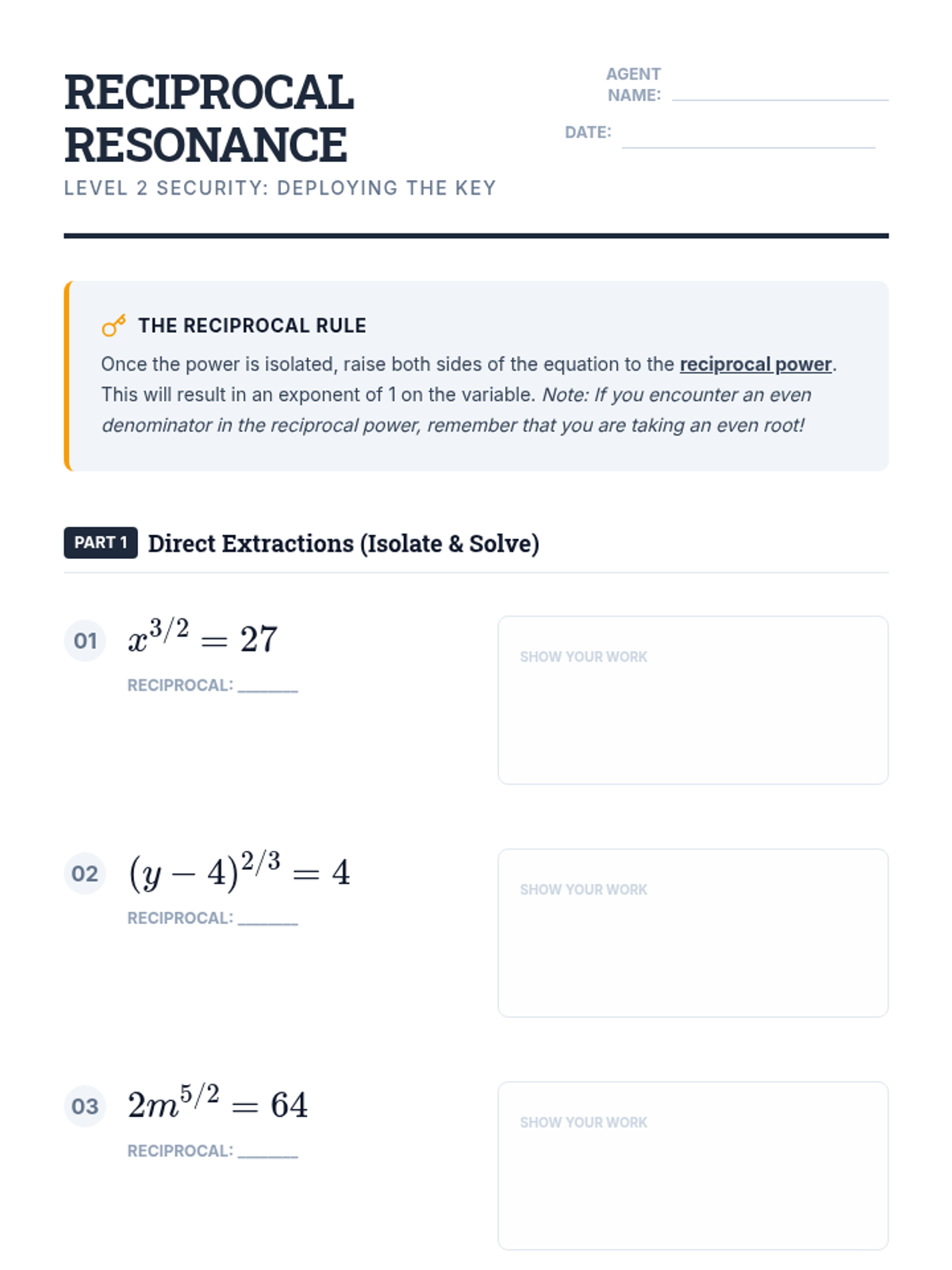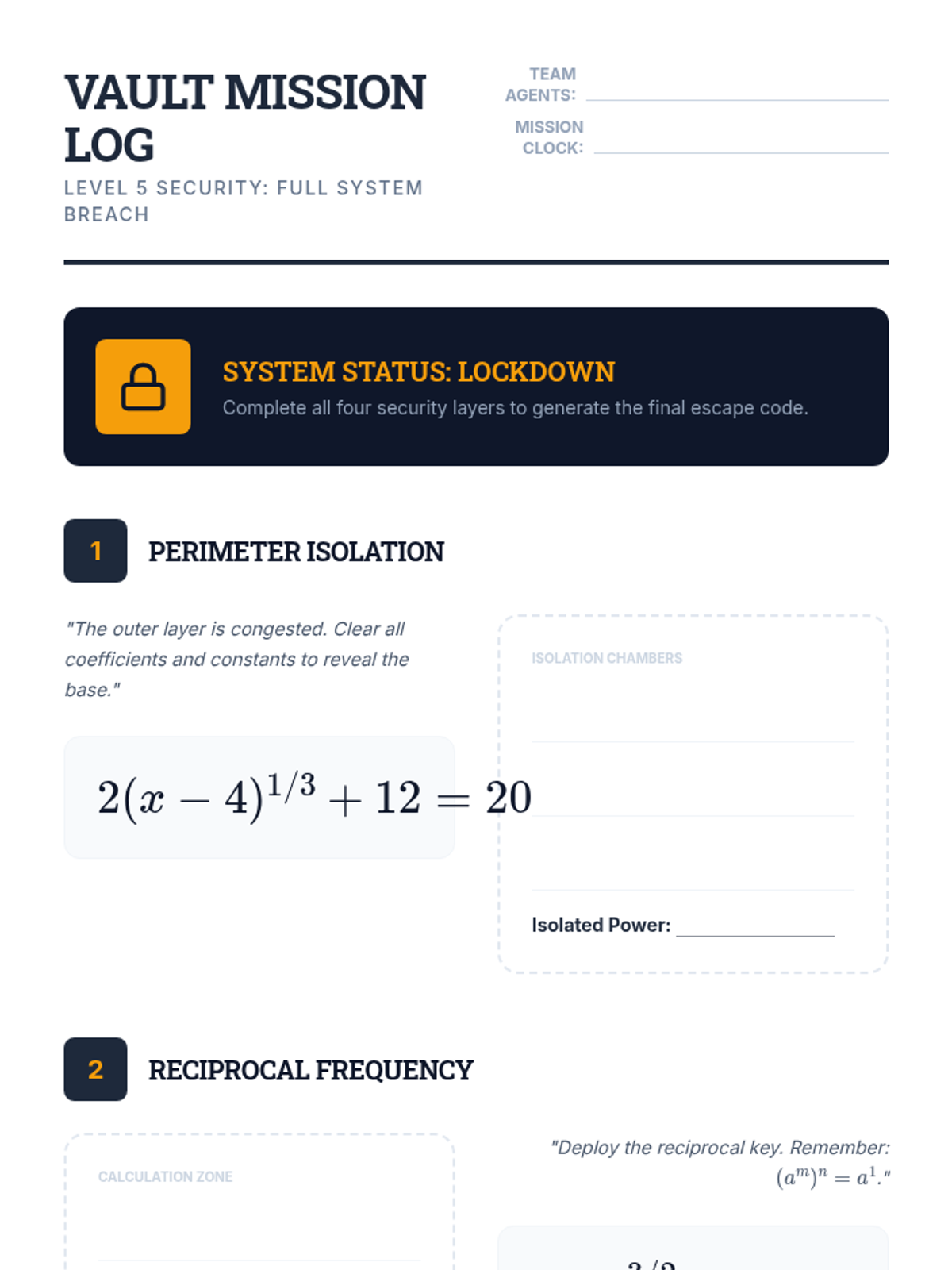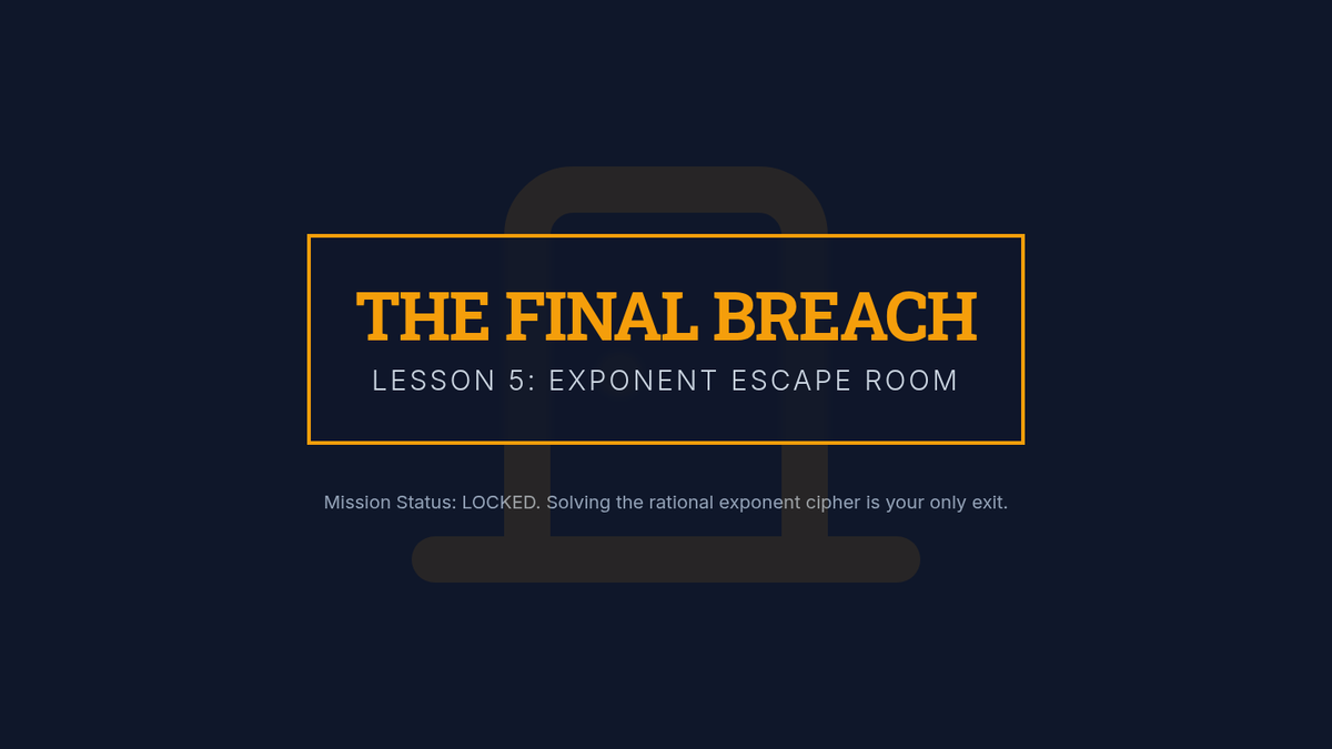 A comprehensive unit for 11th-grade students on solving algebraic equations with rational exponents. Students progress from basic isolation techniques to handling reciprocal powers, even/odd root nuances, and identifying extraneous solutions through a gamified, vault-cracking theme.