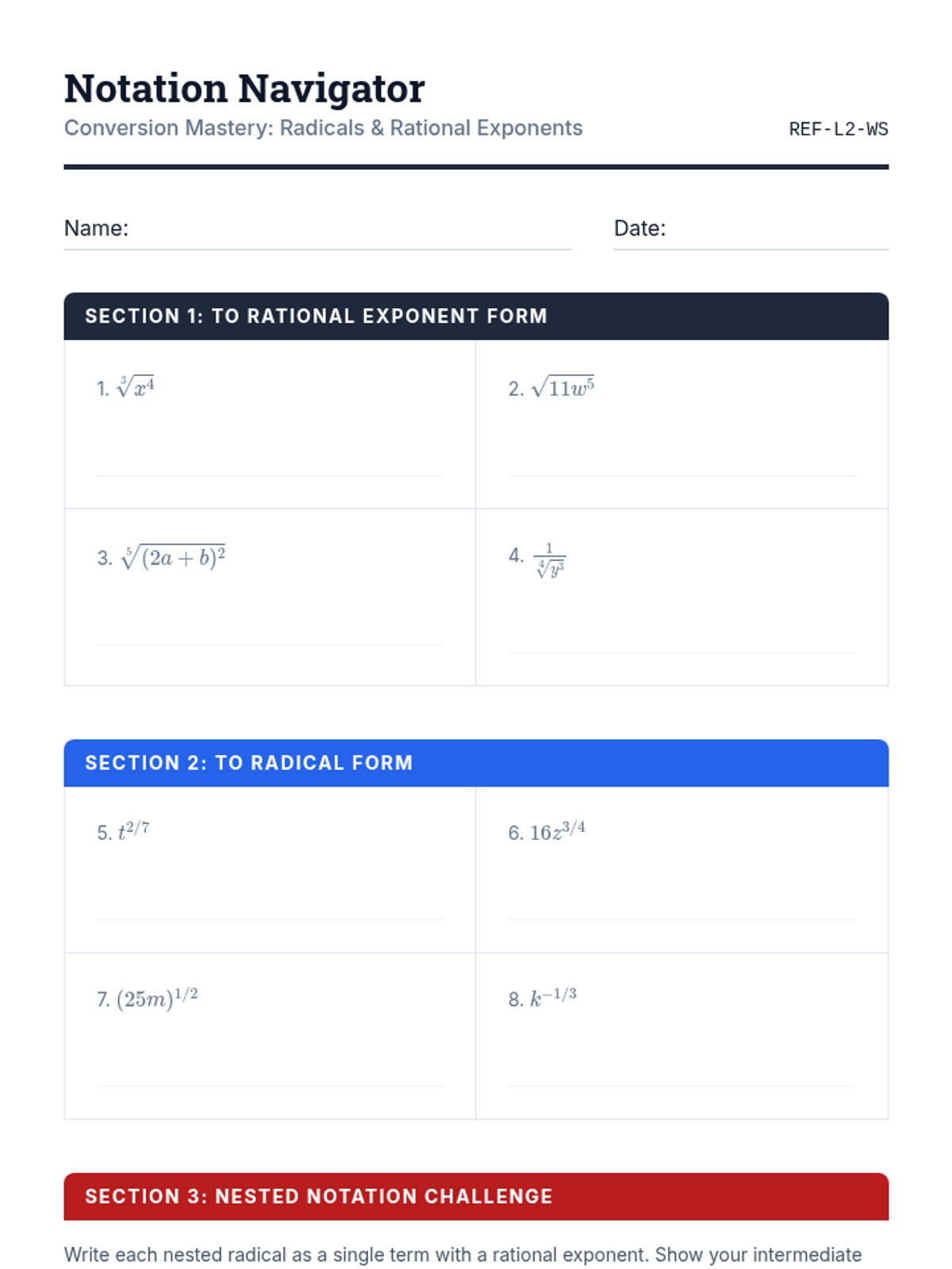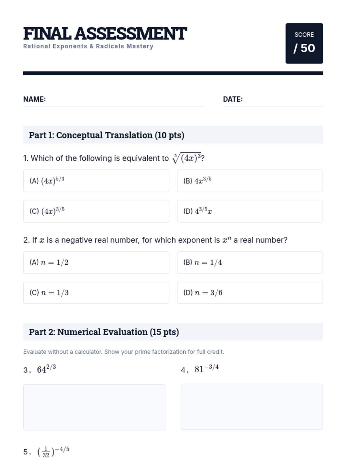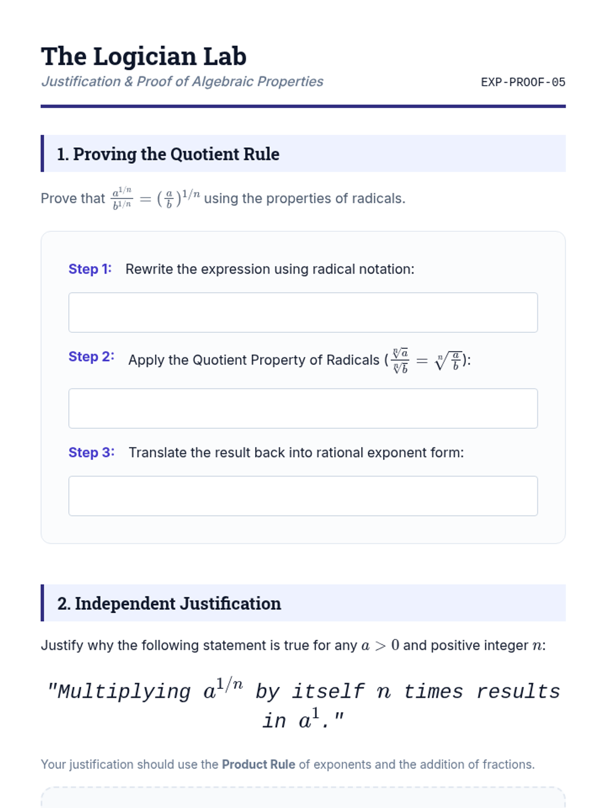 This sequence establishes the theoretical foundation linking radical notation to rational exponents. Students move from conceptual inquiry to rigorous algebraic application, covering translation, evaluation, domain analysis, and formal justification of exponent properties for rational numbers.
