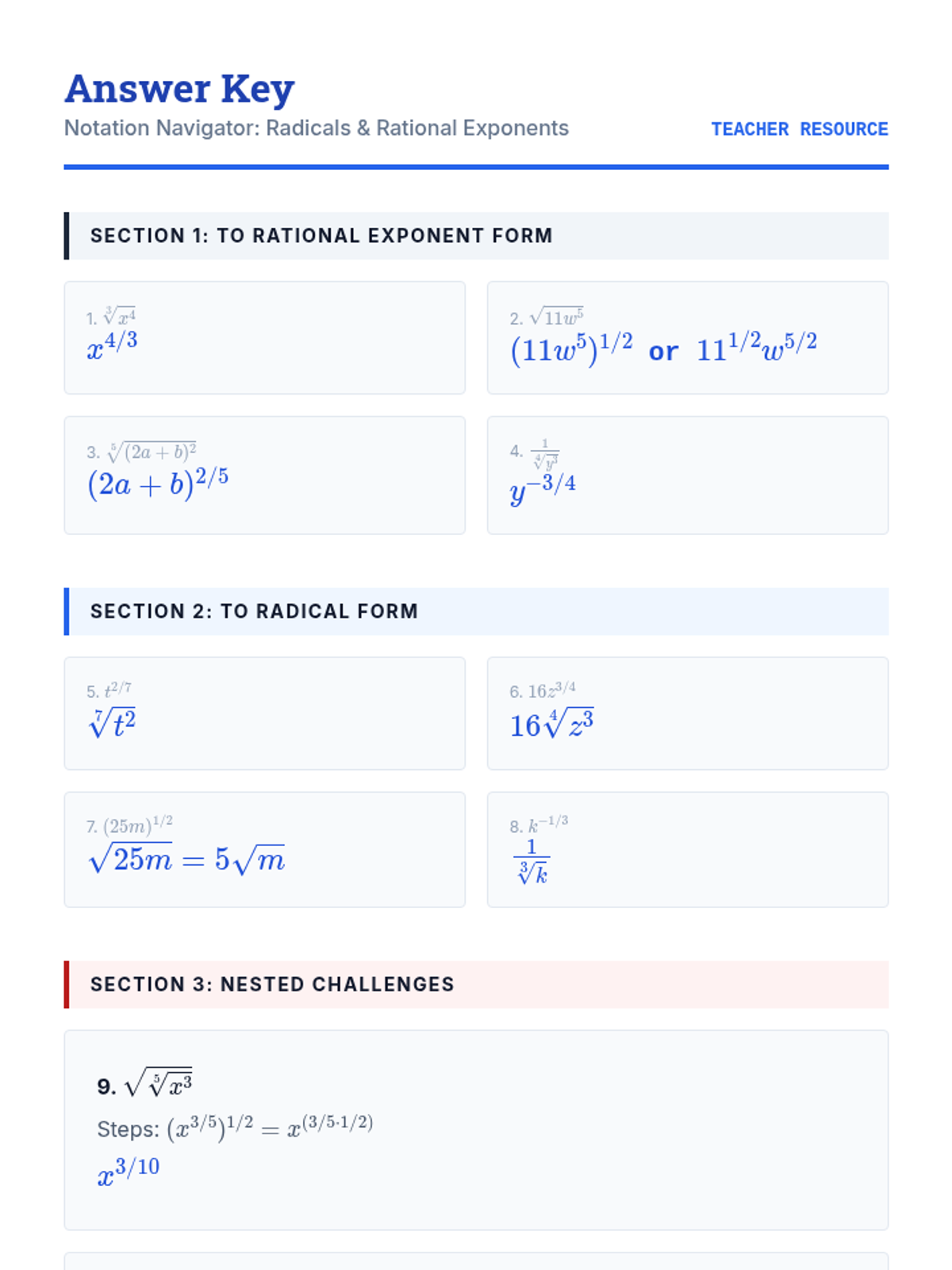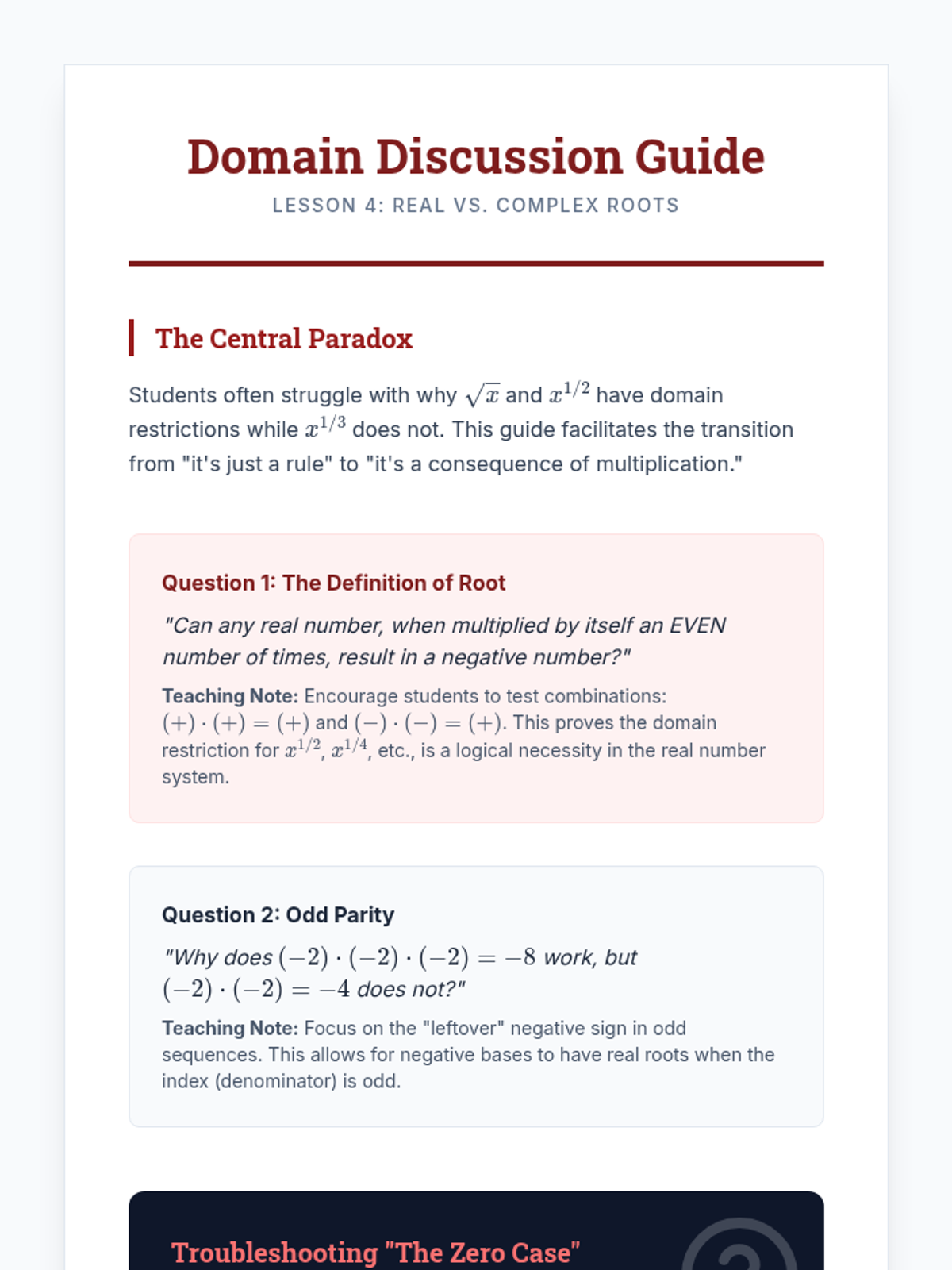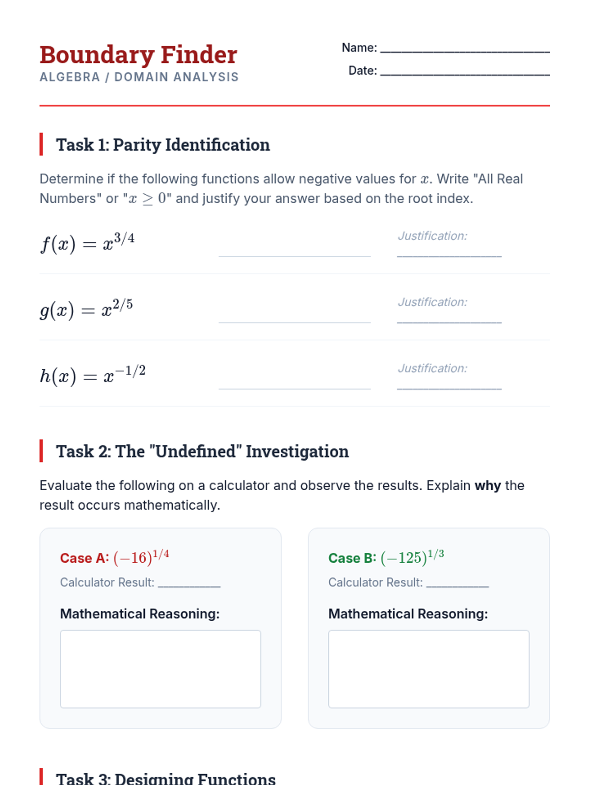 This sequence establishes the theoretical foundation linking radical notation to rational exponents. Students move from conceptual inquiry to rigorous algebraic application, covering translation, evaluation, domain analysis, and formal justification of exponent properties for rational numbers.