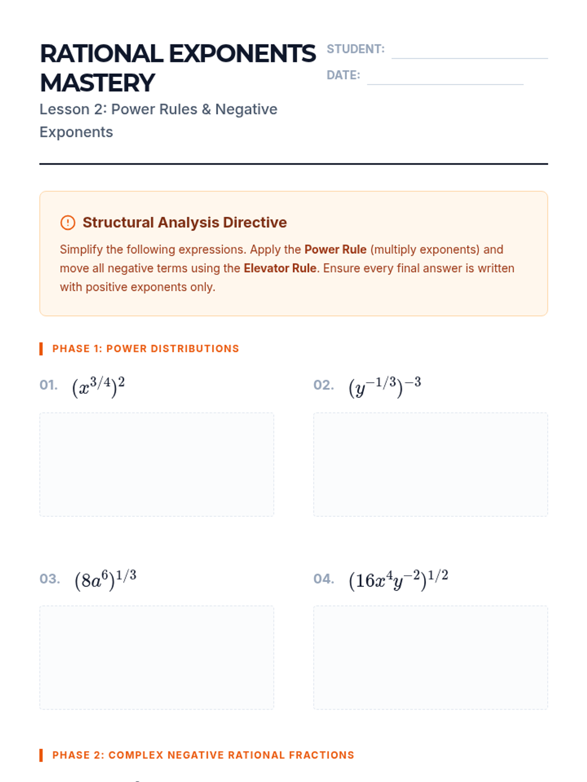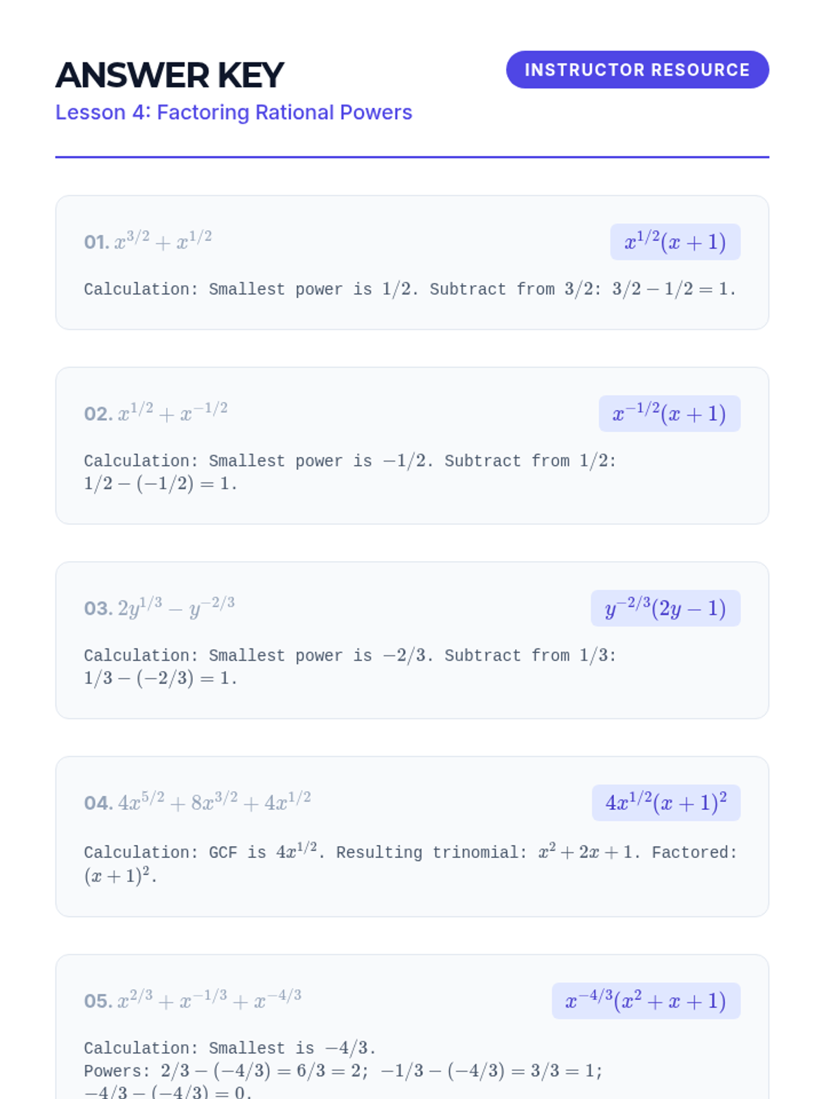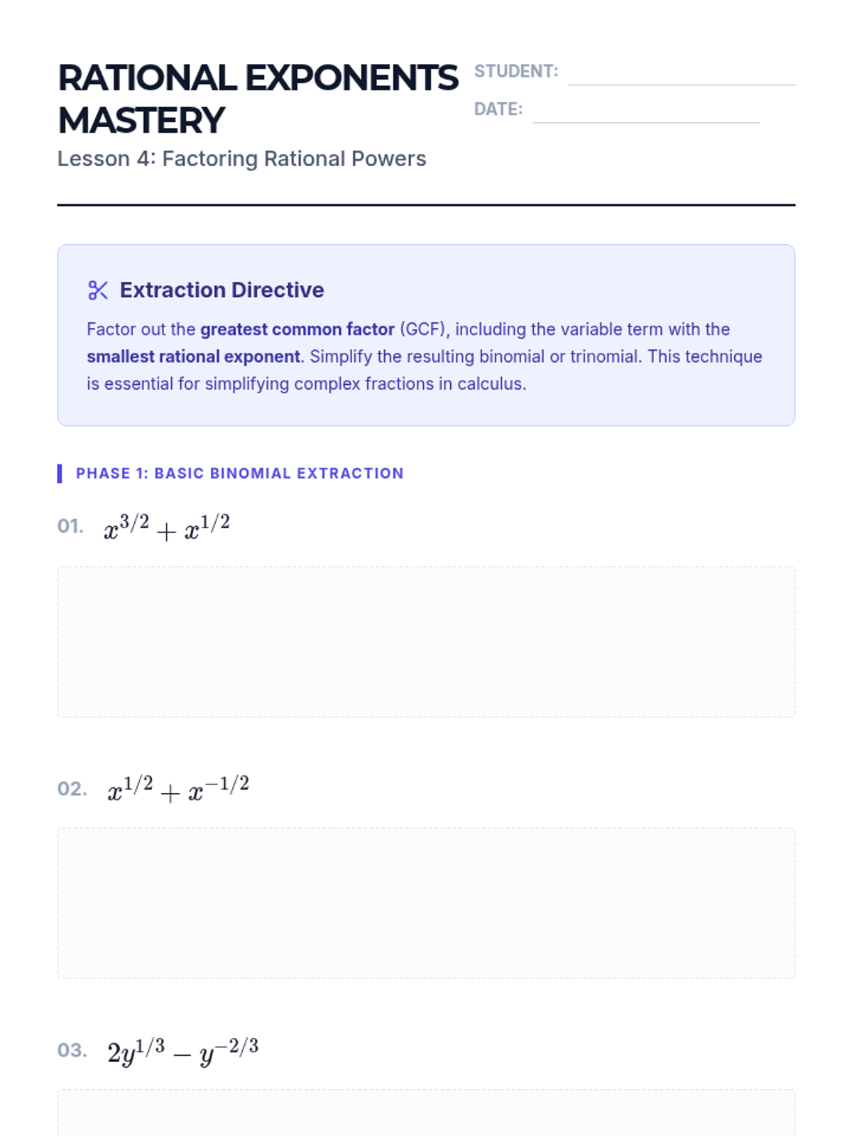 An intensive procedural fluency module for undergraduate students focusing on the systematic simplification of algebraic expressions with rational exponents. The sequence progresses from basic operations to advanced factoring techniques required for higher-level calculus and engineering mathematics.