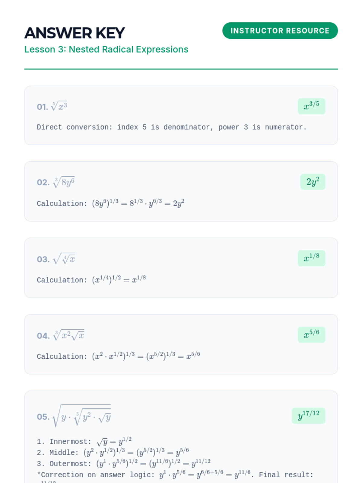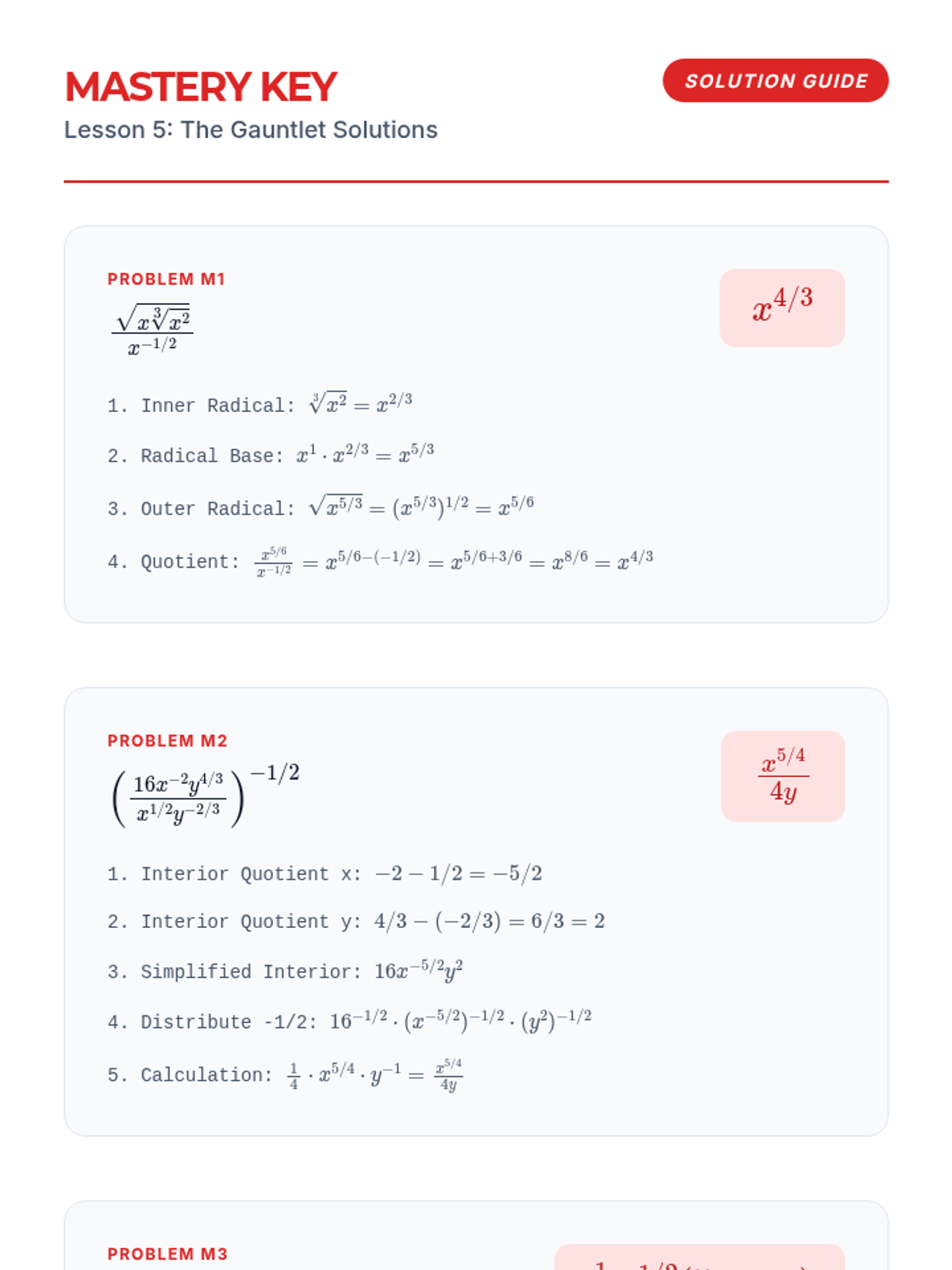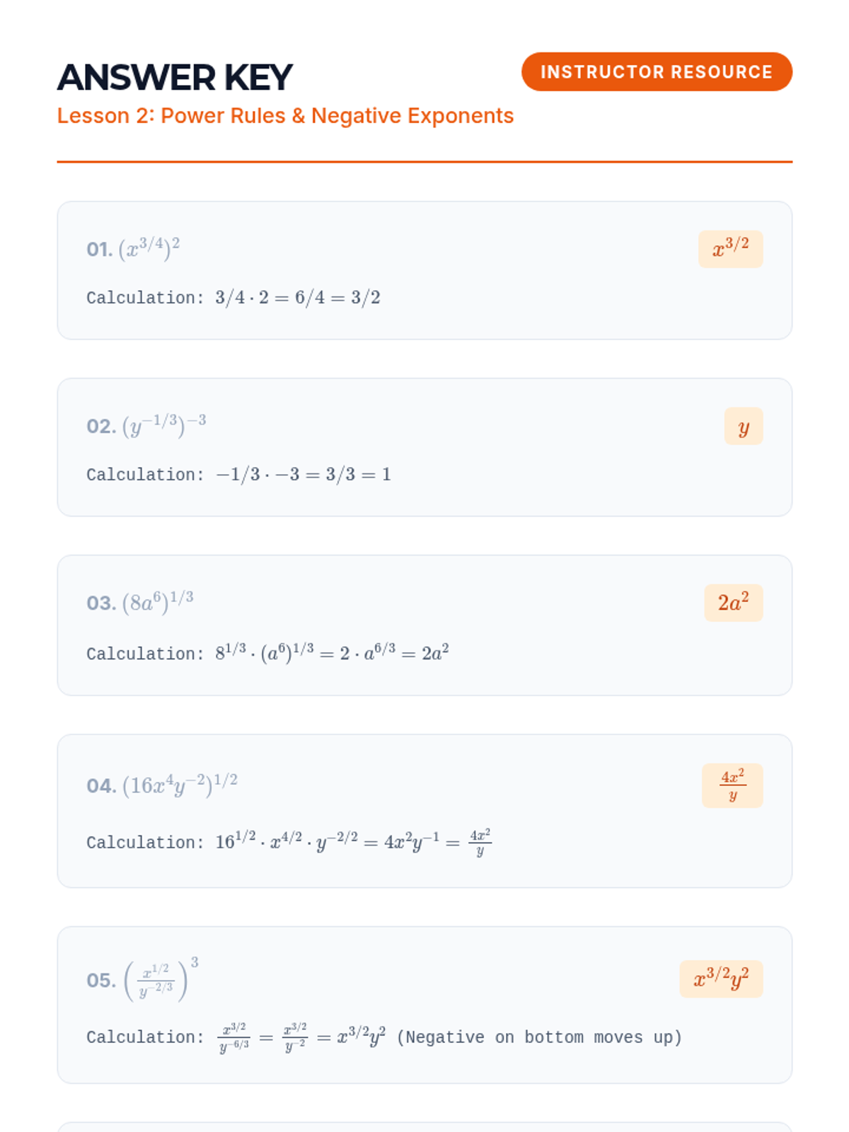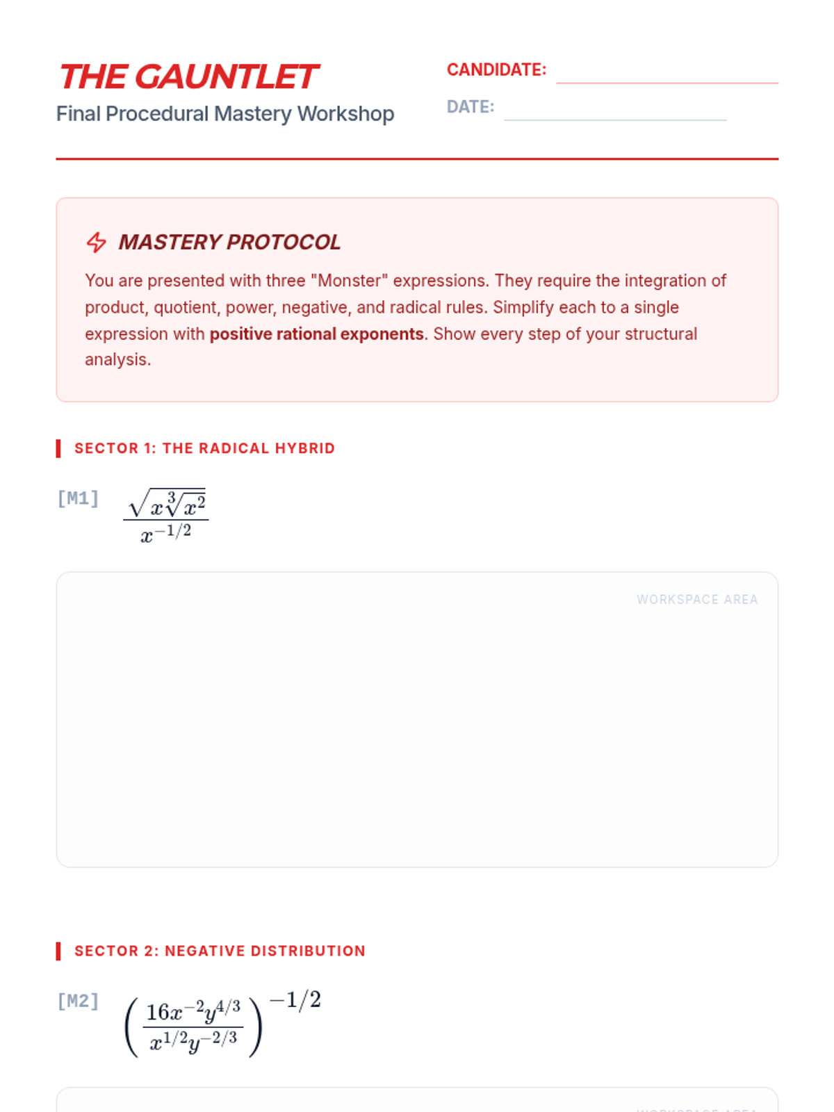 An intensive procedural fluency module for undergraduate students focusing on the systematic simplification of algebraic expressions with rational exponents. The sequence progresses from basic operations to advanced factoring techniques required for higher-level calculus and engineering mathematics.
