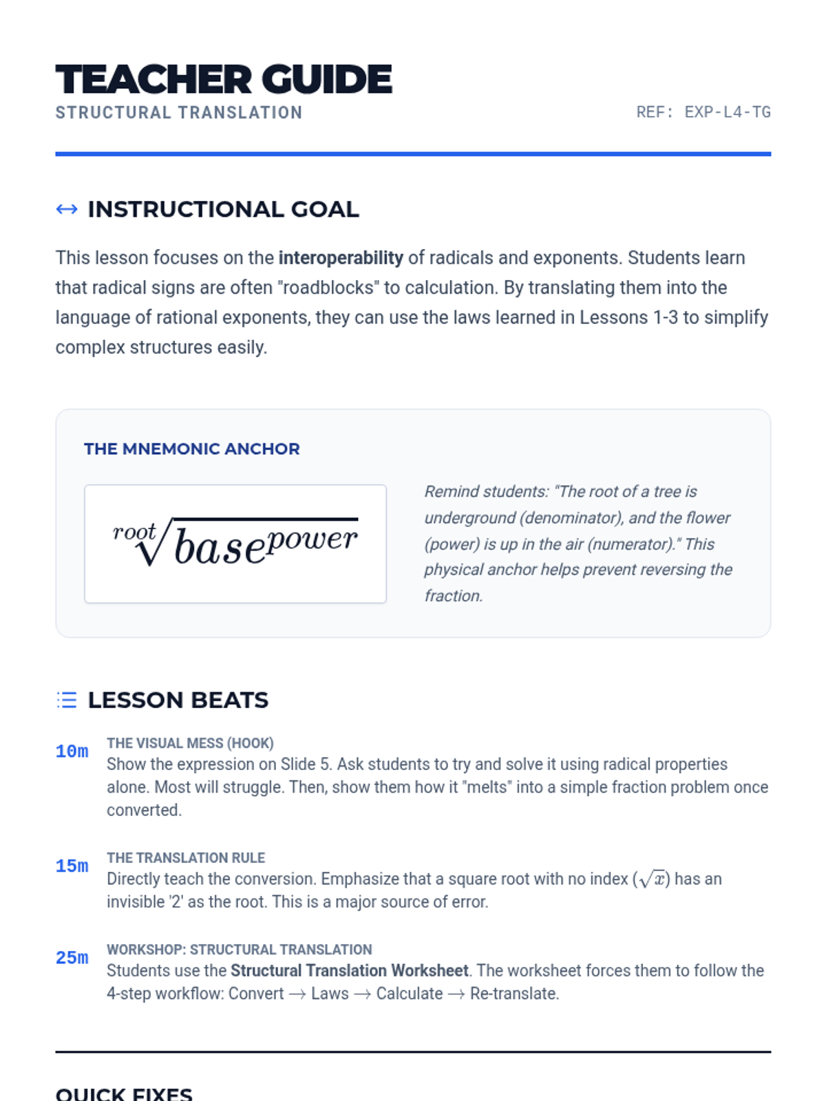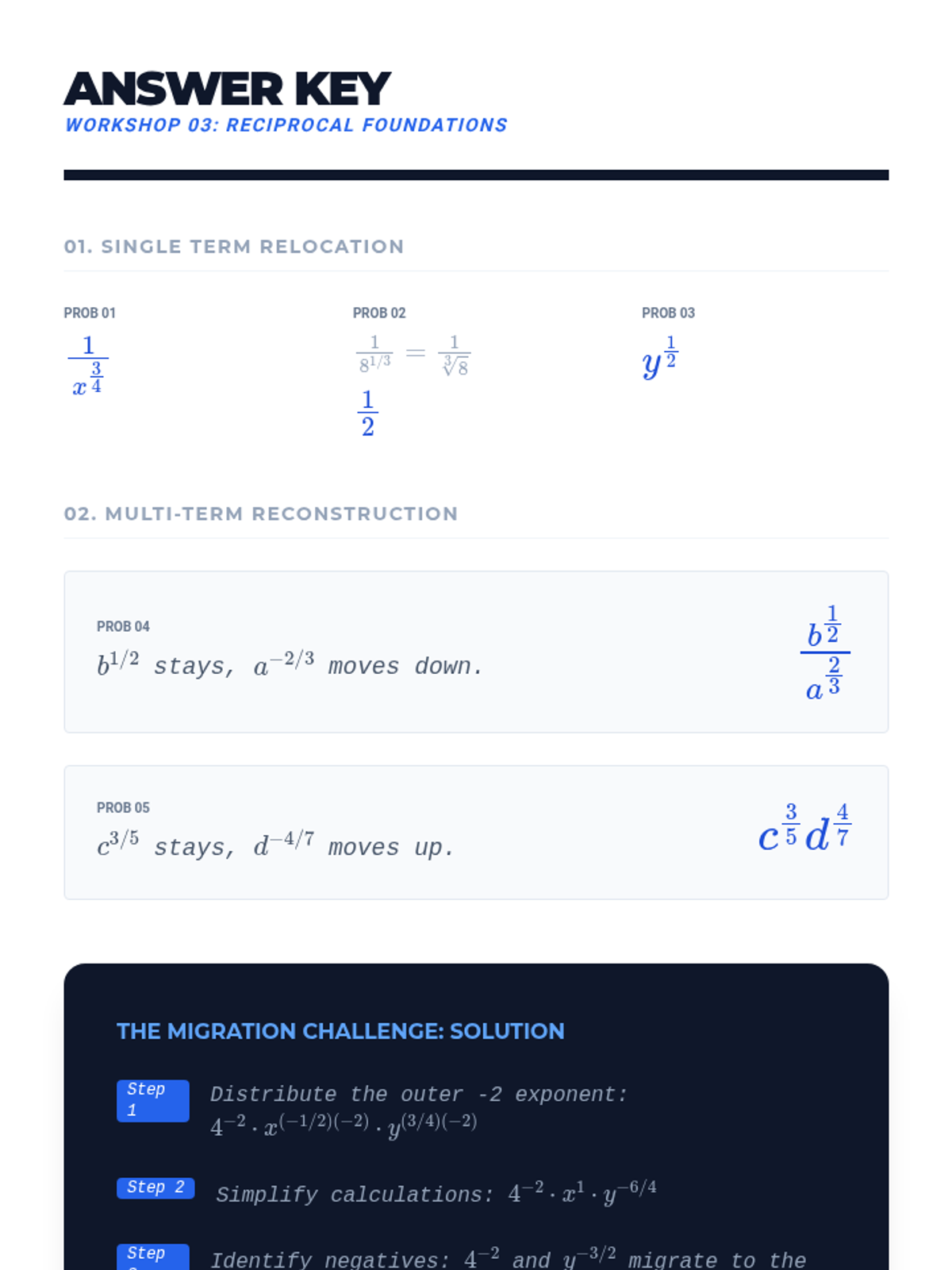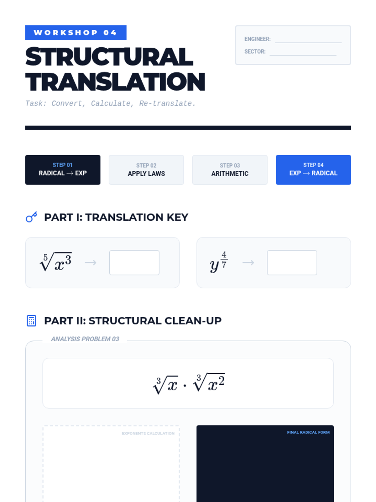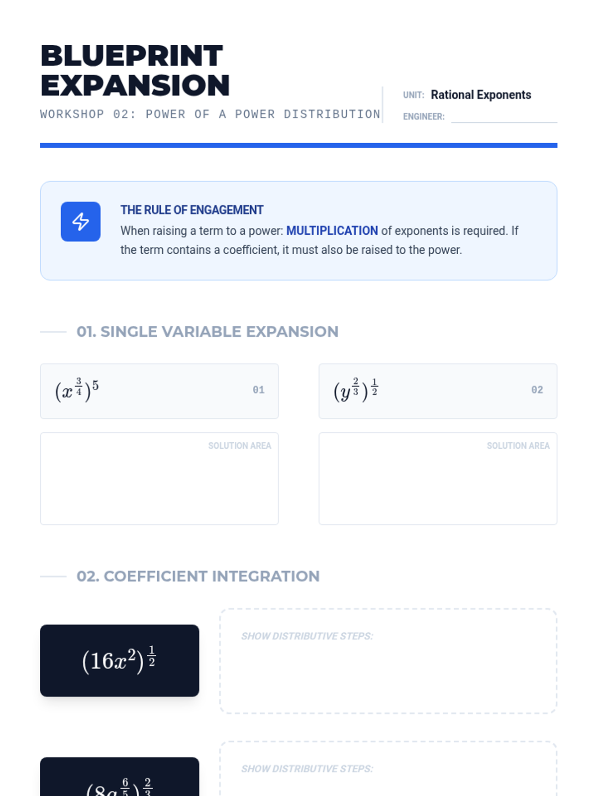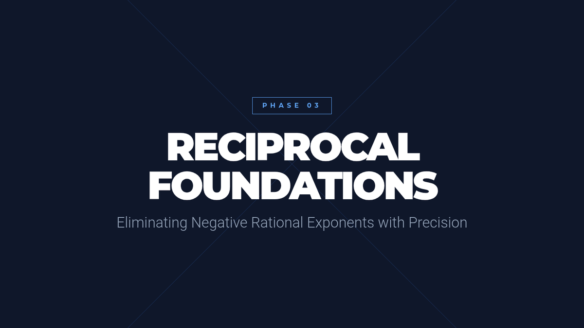 A high-school level algebra sequence focusing on the procedural mastery of rational exponents. Students learn to apply exponent laws to fractional powers, handle negative exponents, and convert between radical and exponential forms through a series of workshops and skill-building activities.