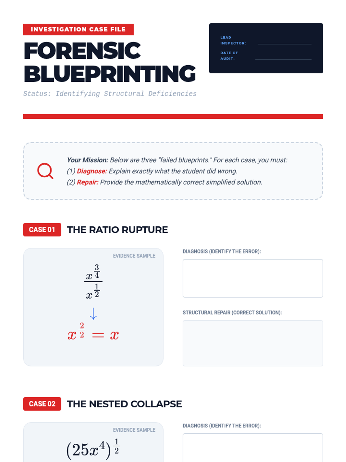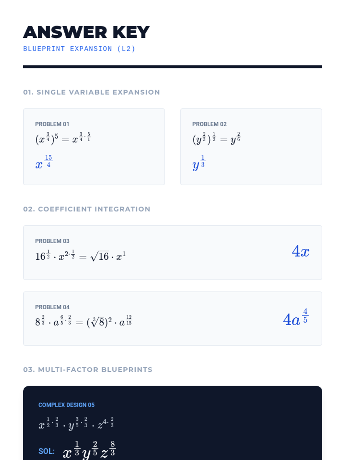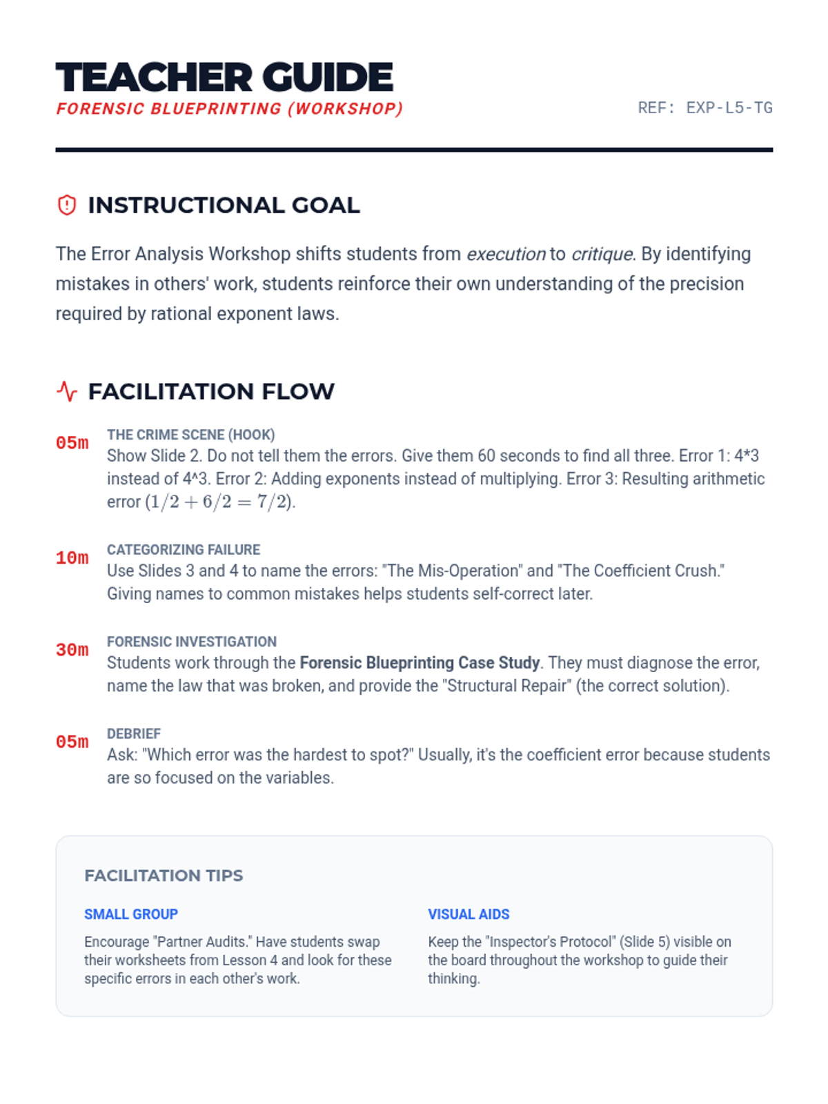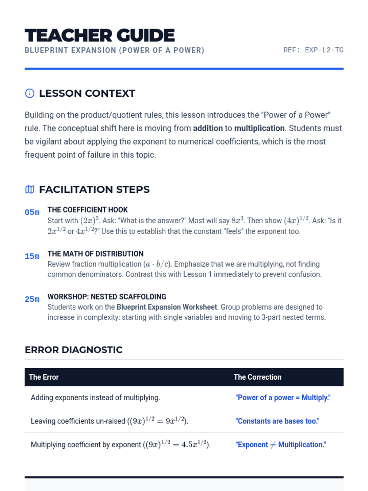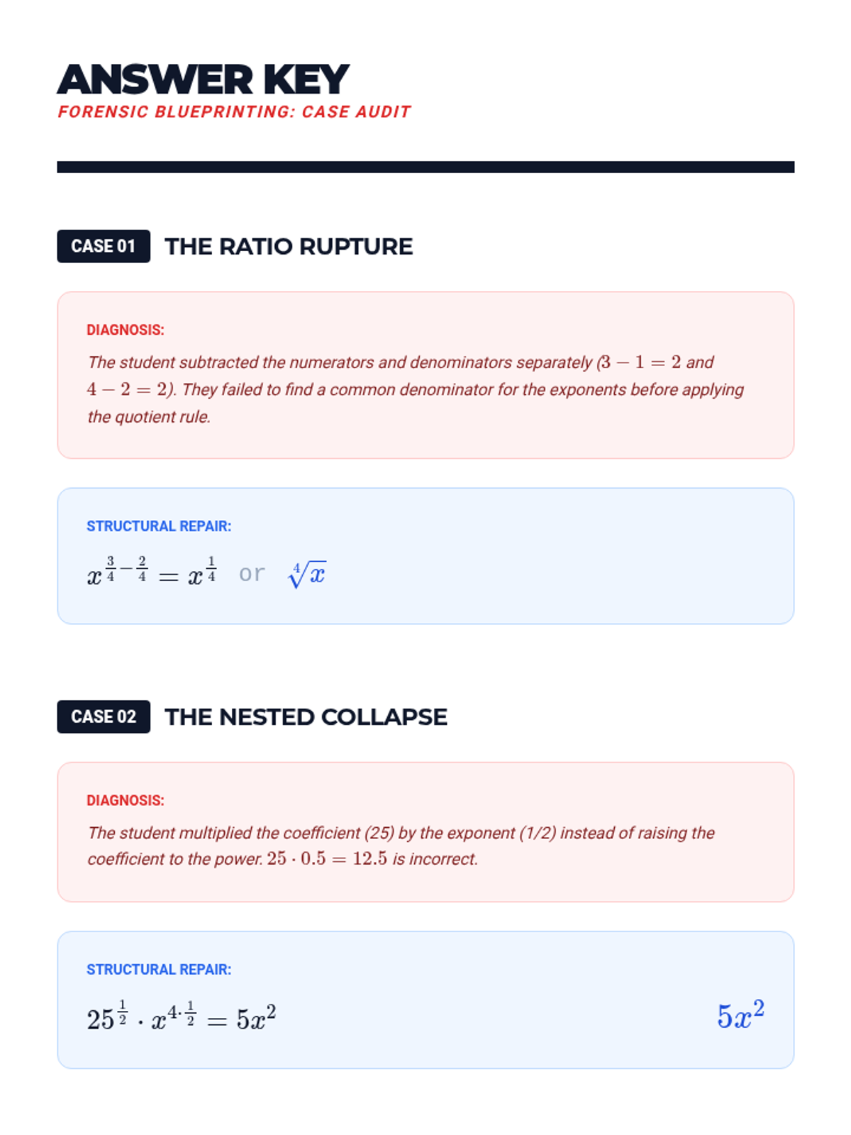 A high-school level algebra sequence focusing on the procedural mastery of rational exponents. Students learn to apply exponent laws to fractional powers, handle negative exponents, and convert between radical and exponential forms through a series of workshops and skill-building activities.