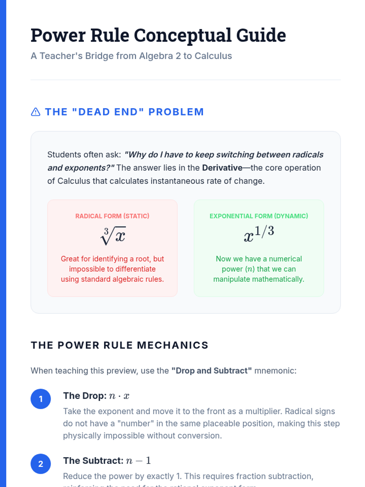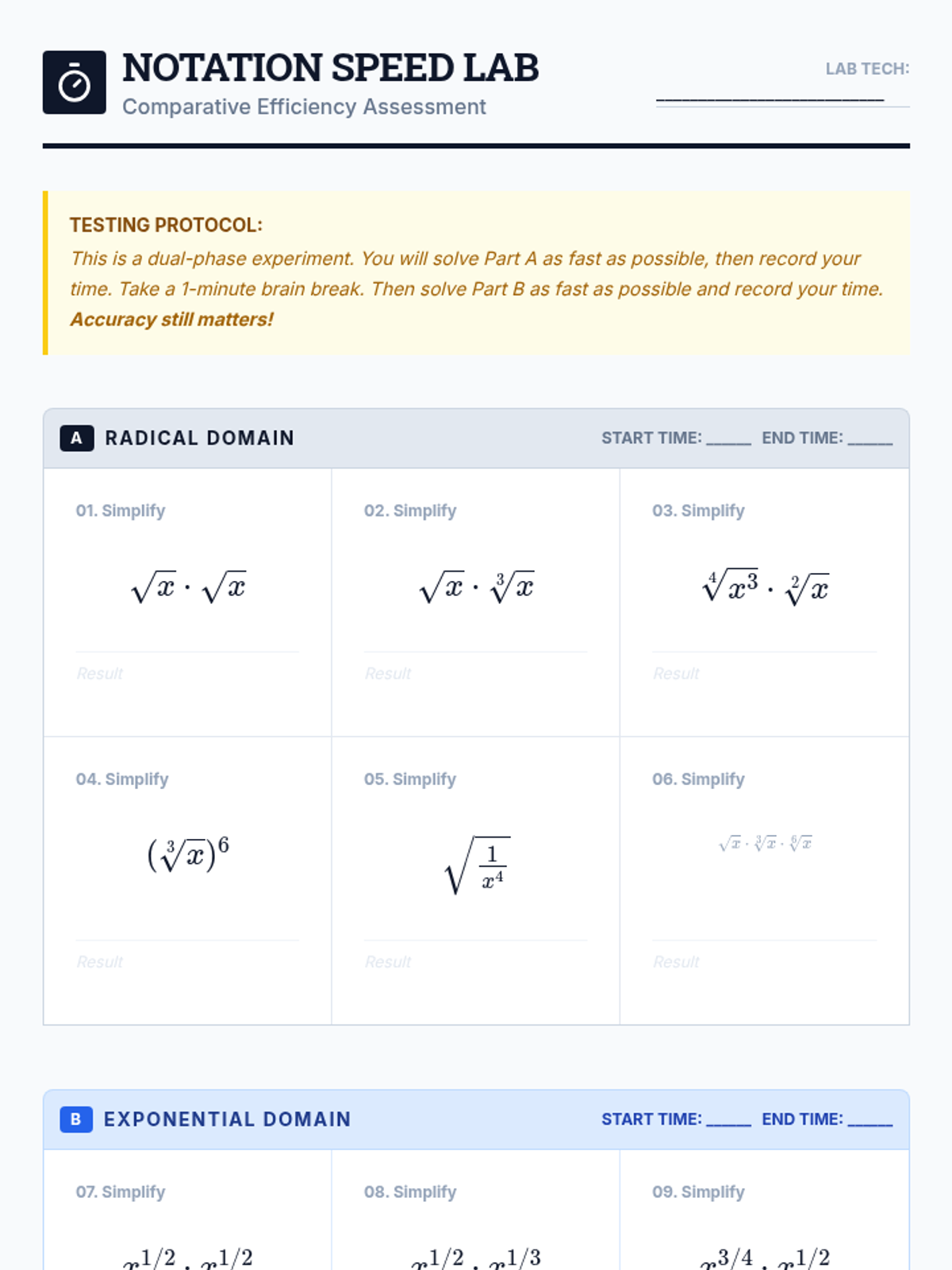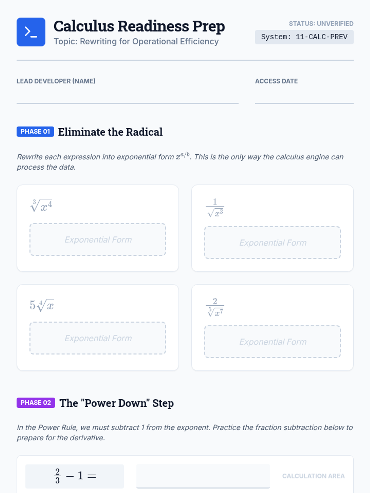 A high-level algebra sequence for 11th graders that explores the utility and structure of rational exponents versus radical notation. Students critique mathematical syntax, justify logical steps, and preview calculus-level applications.