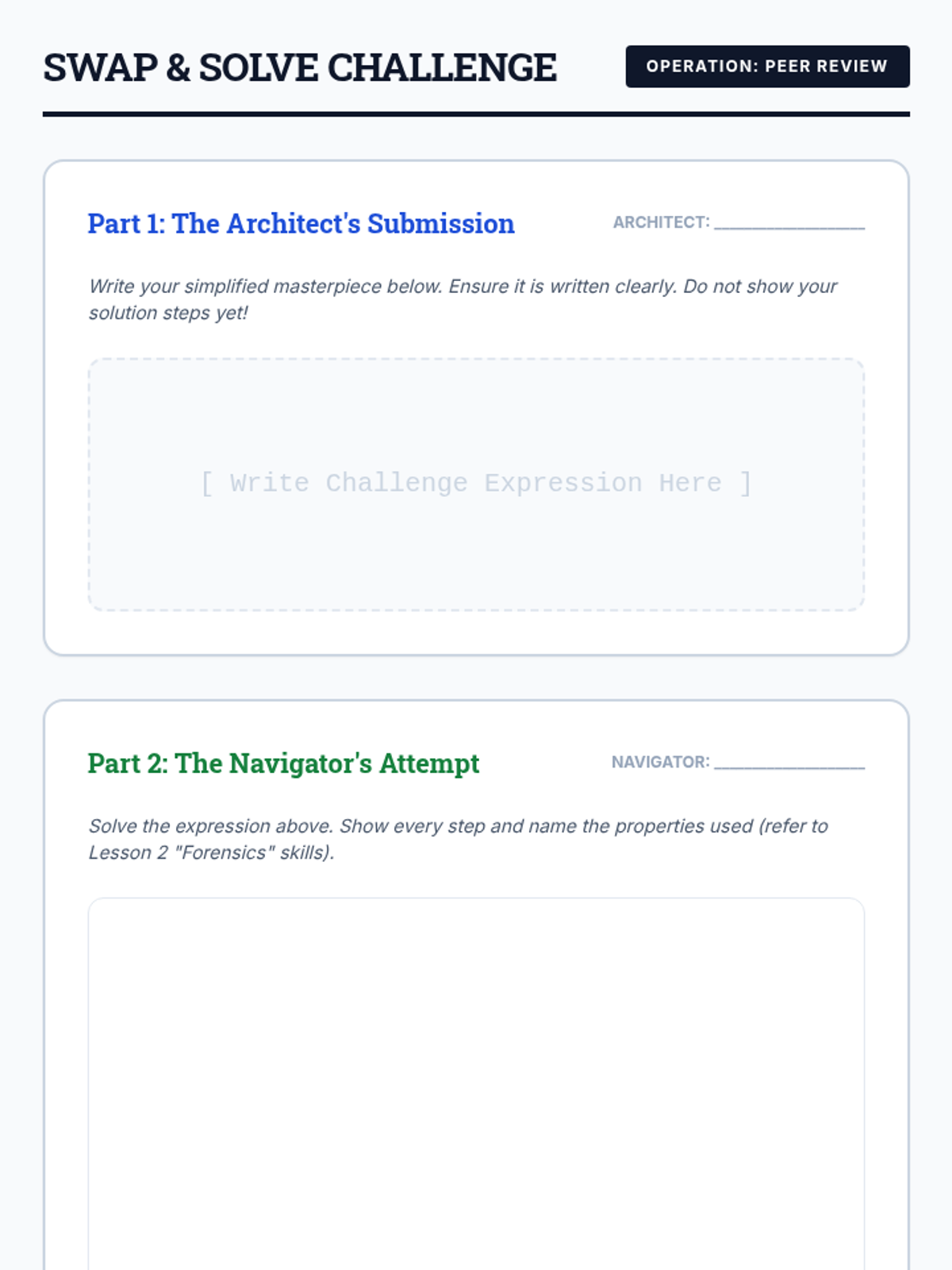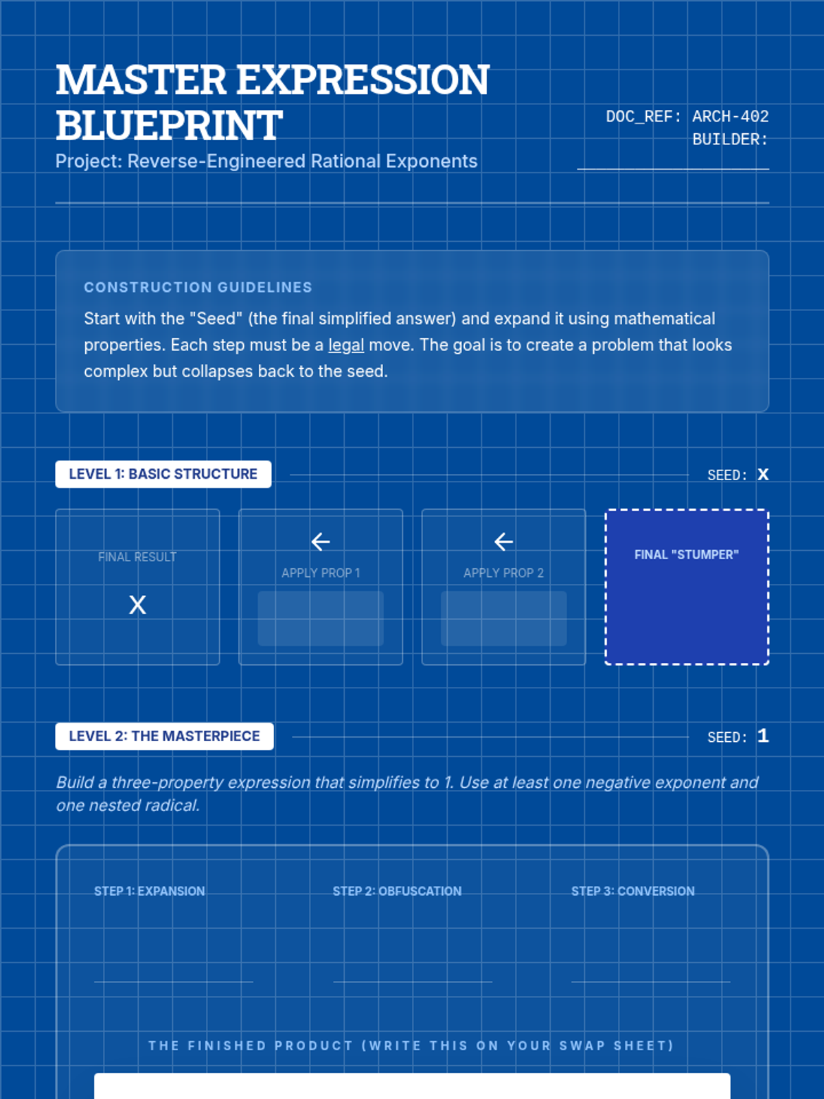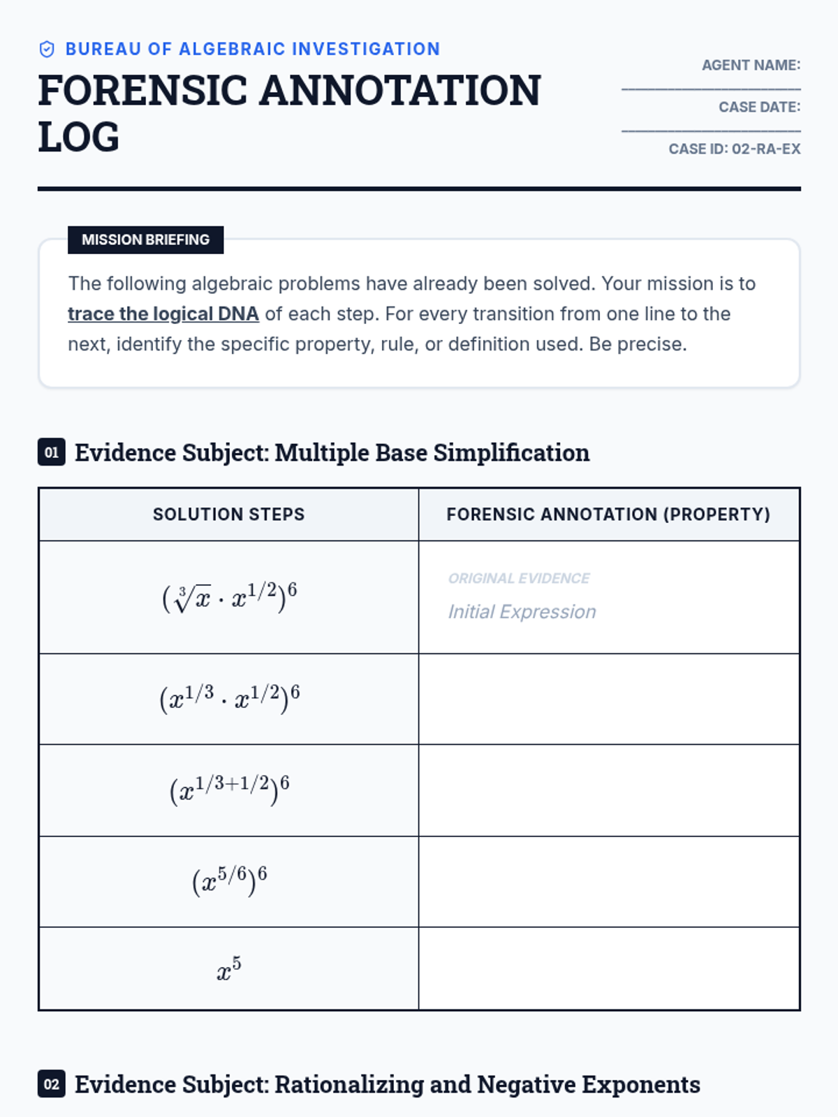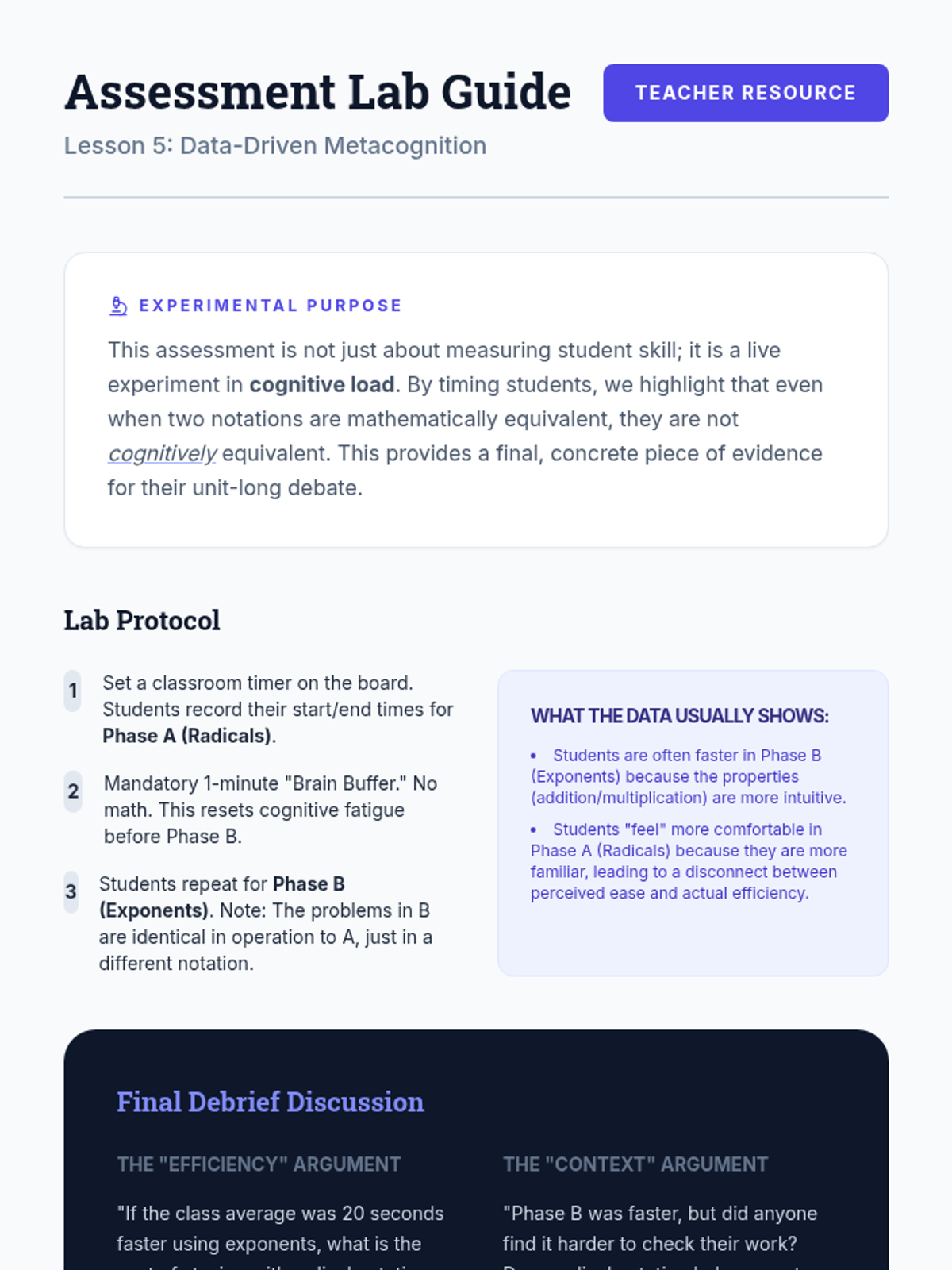 A high-level algebra sequence for 11th graders that explores the utility and structure of rational exponents versus radical notation. Students critique mathematical syntax, justify logical steps, and preview calculus-level applications.