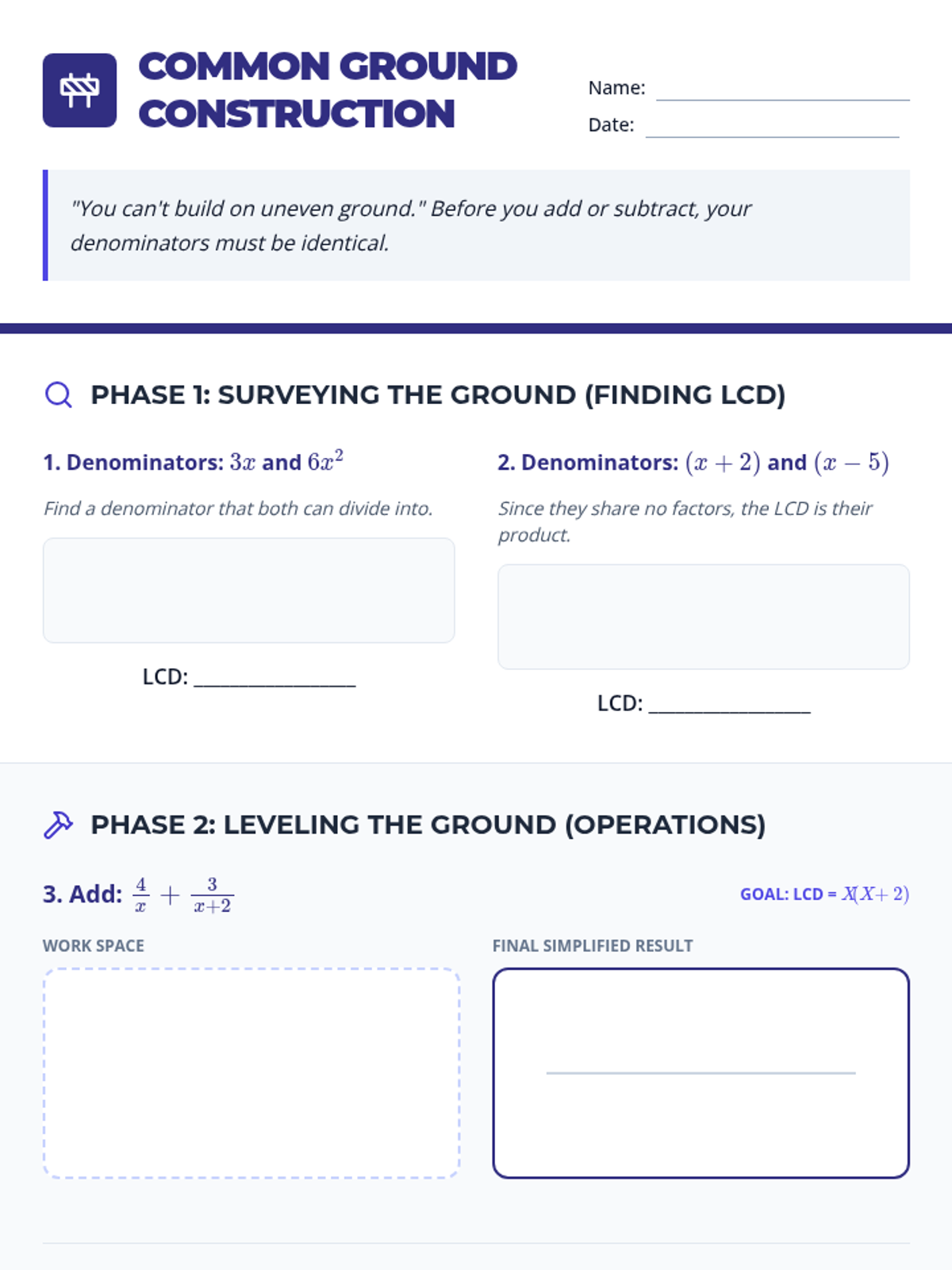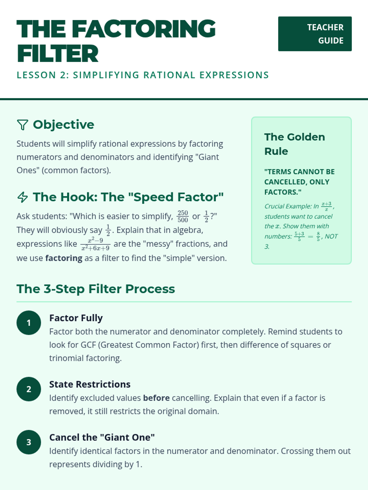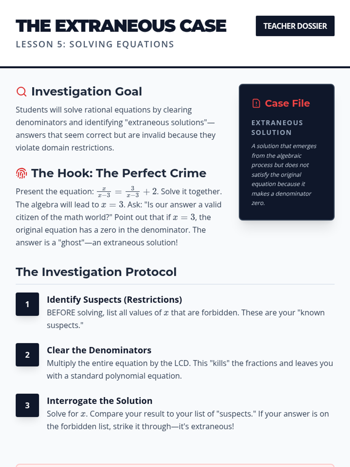 A comprehensive 5-lesson unit on rational expressions, covering domain restrictions, simplification, arithmetic operations, and solving equations with a focus on extraneous solutions.