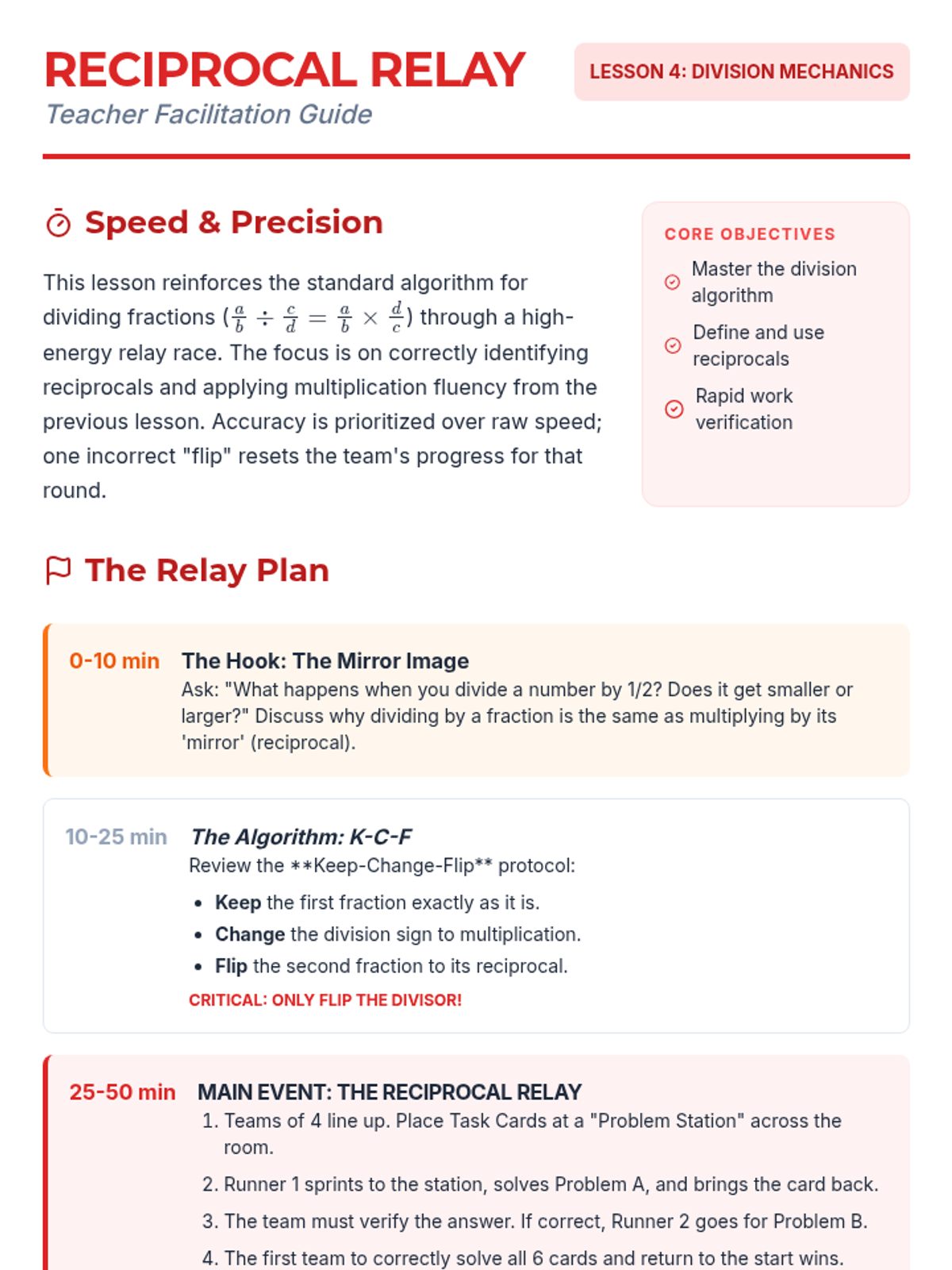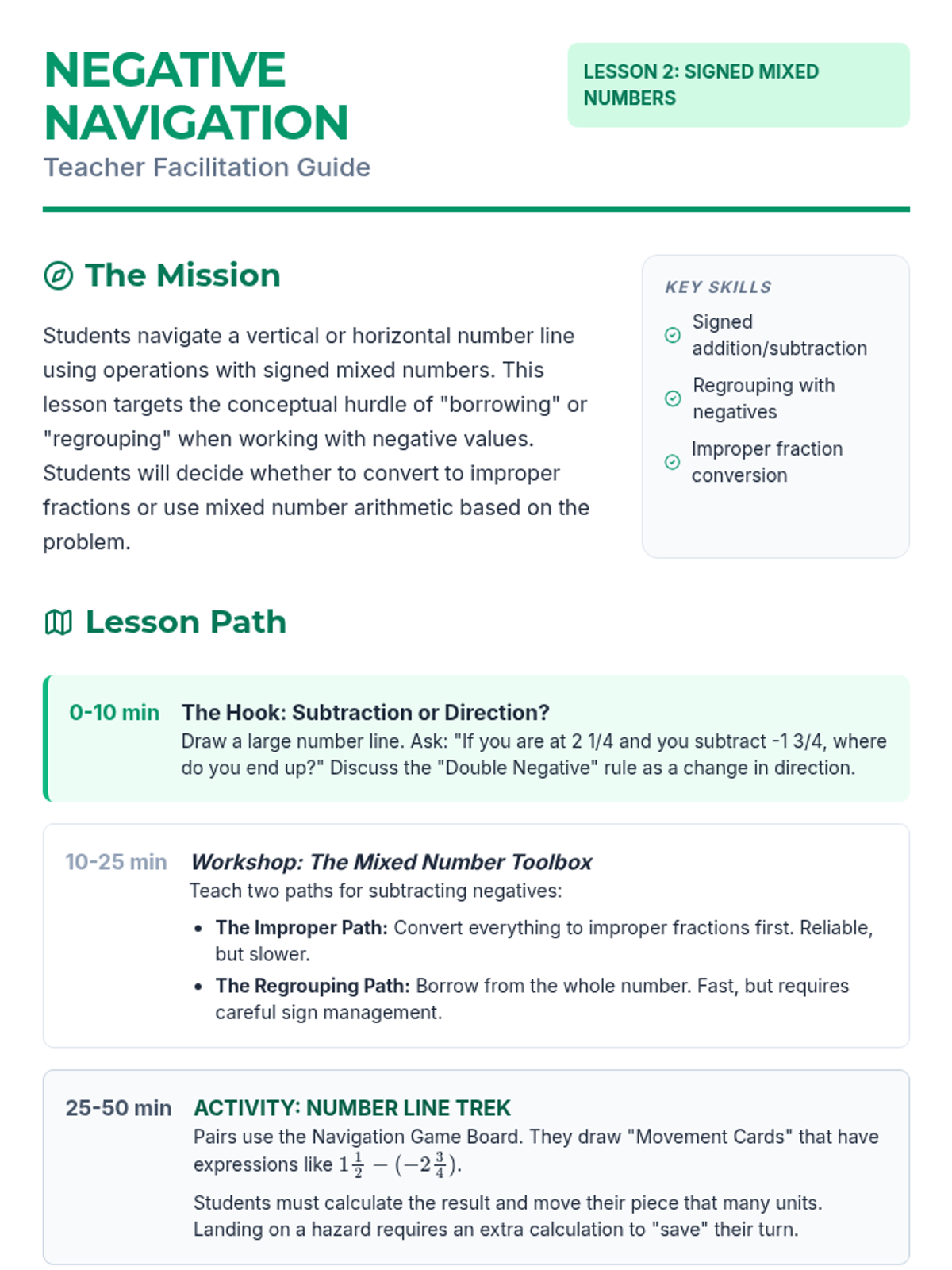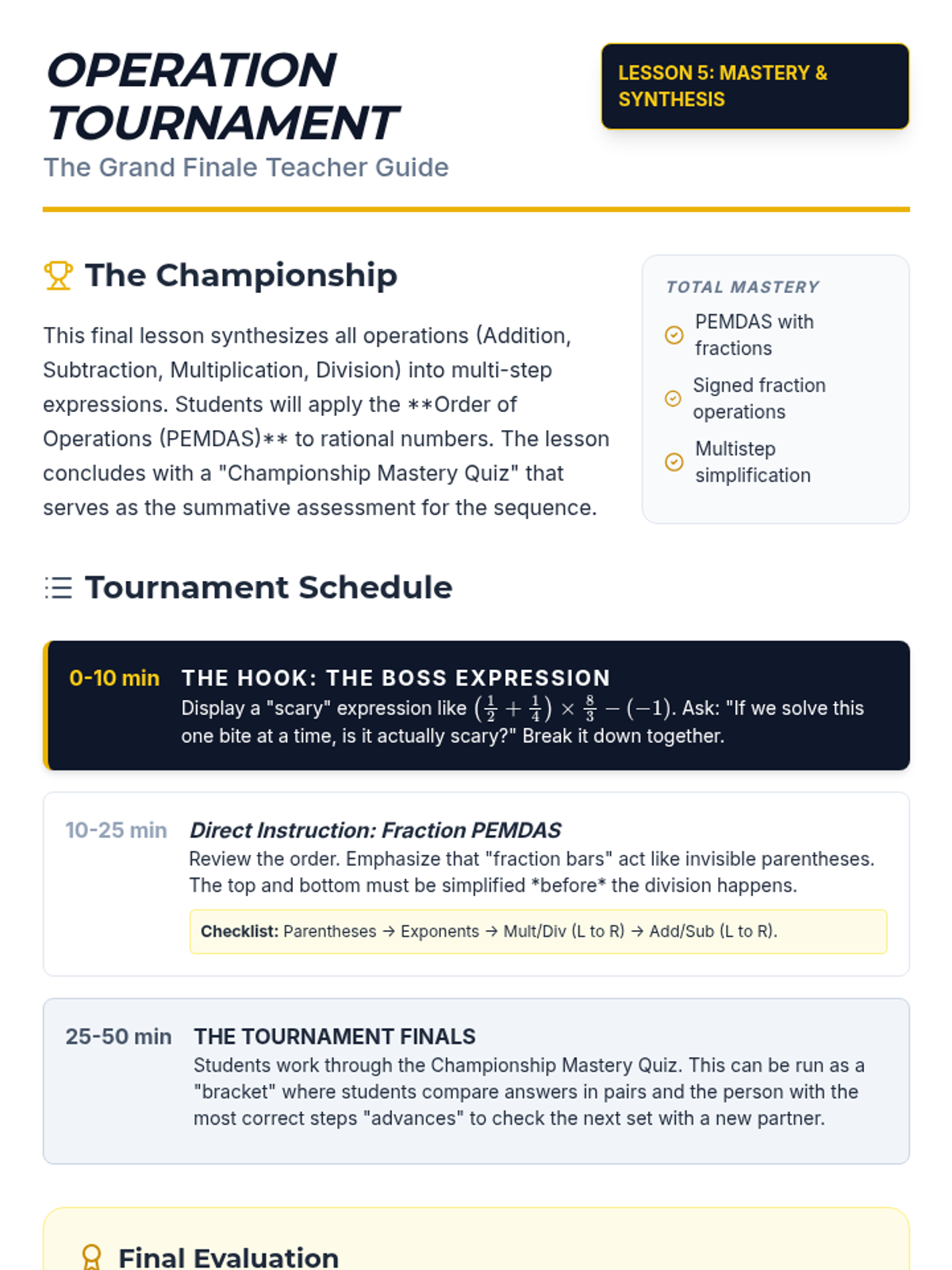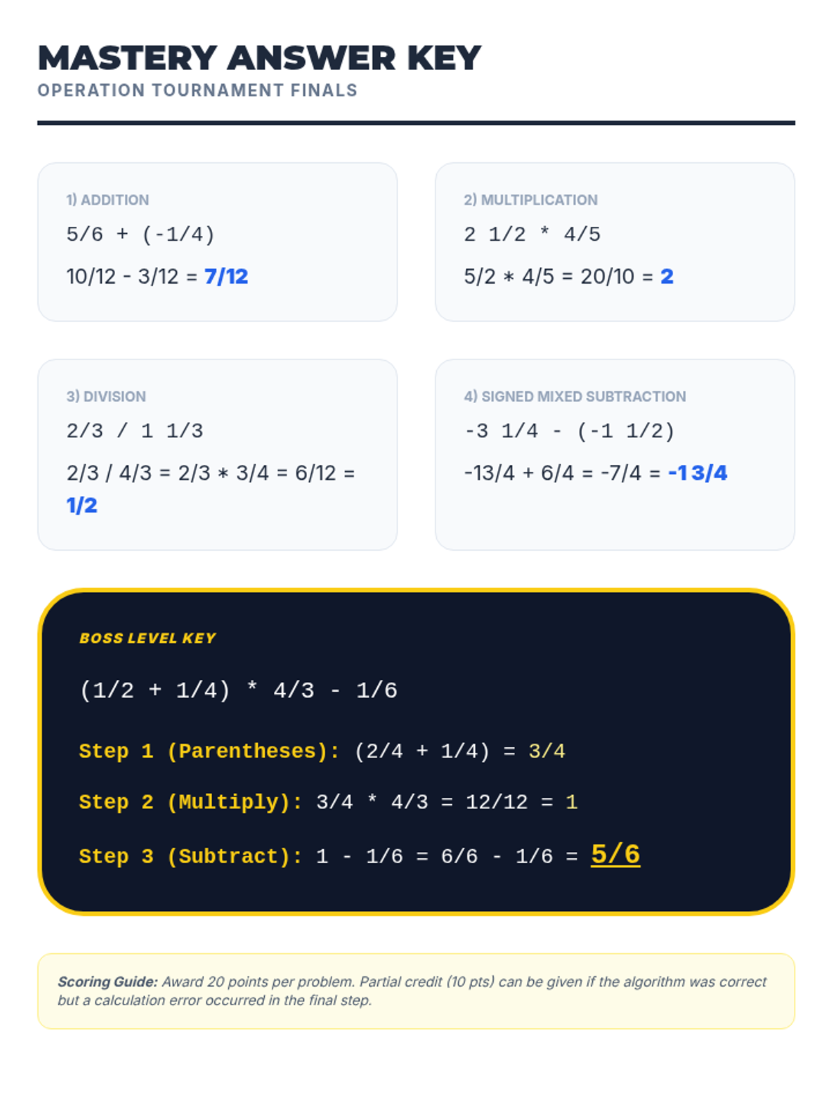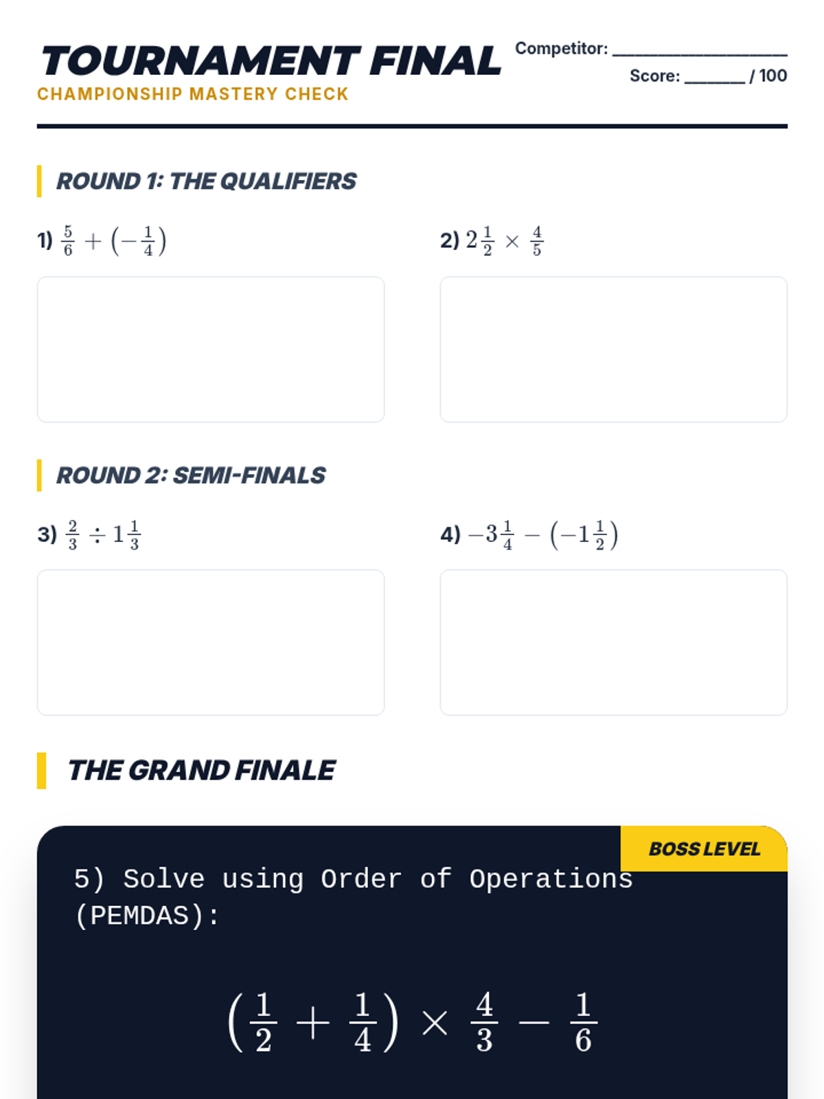 A high-energy series of 7th-grade math lessons focusing on fluency with rational fraction operations through games, puzzles, and competitive challenges. Students master addition, subtraction, multiplication, and division of signed fractions and mixed numbers.