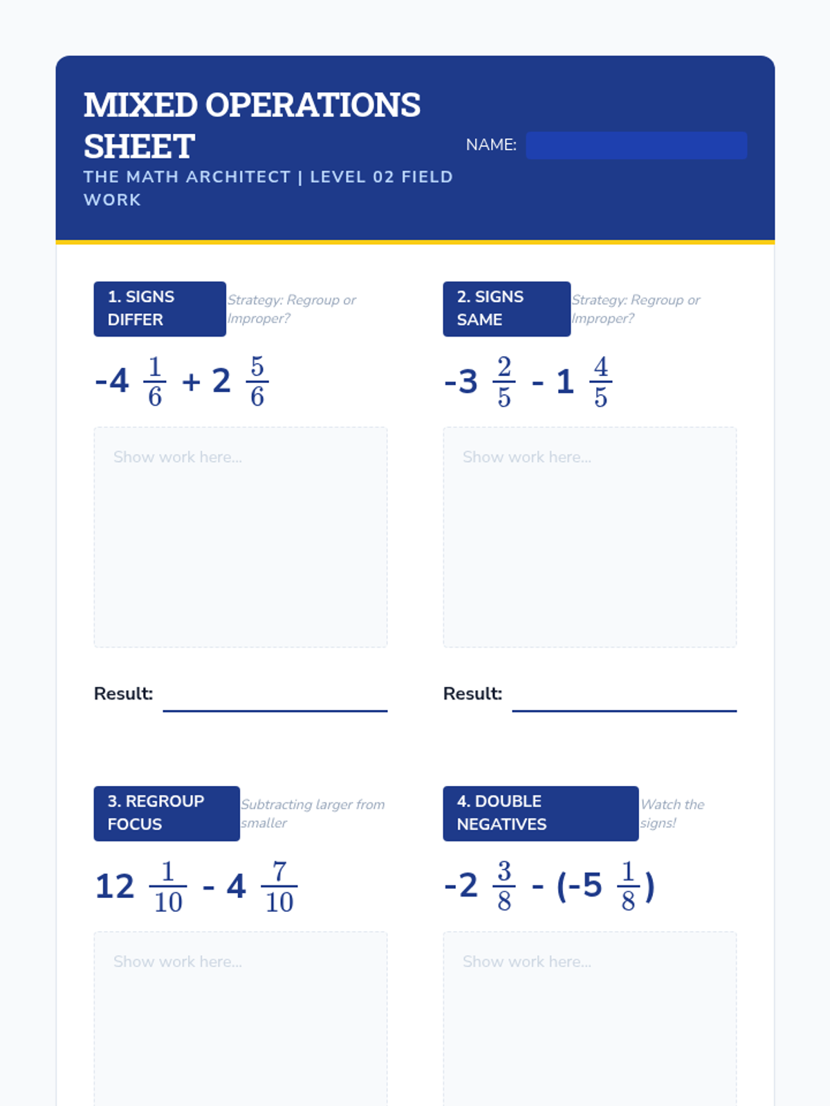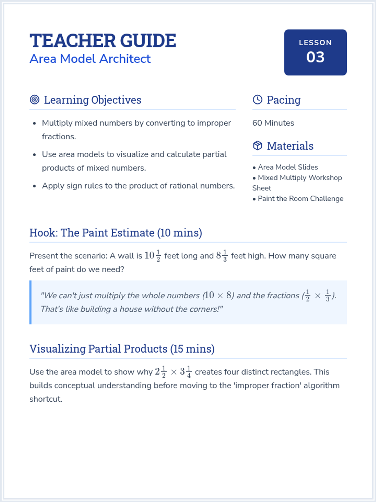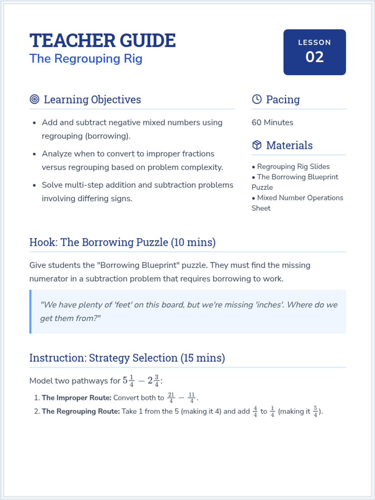 A comprehensive sequence for 7th-grade students focused on building procedural fluency with mixed numbers and improper fractions, including negative values. Students will learn to navigate between forms, apply regrouping strategies, and choose the most efficient methods for multi-step rational number operations.