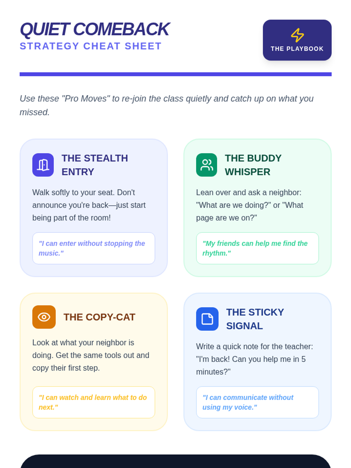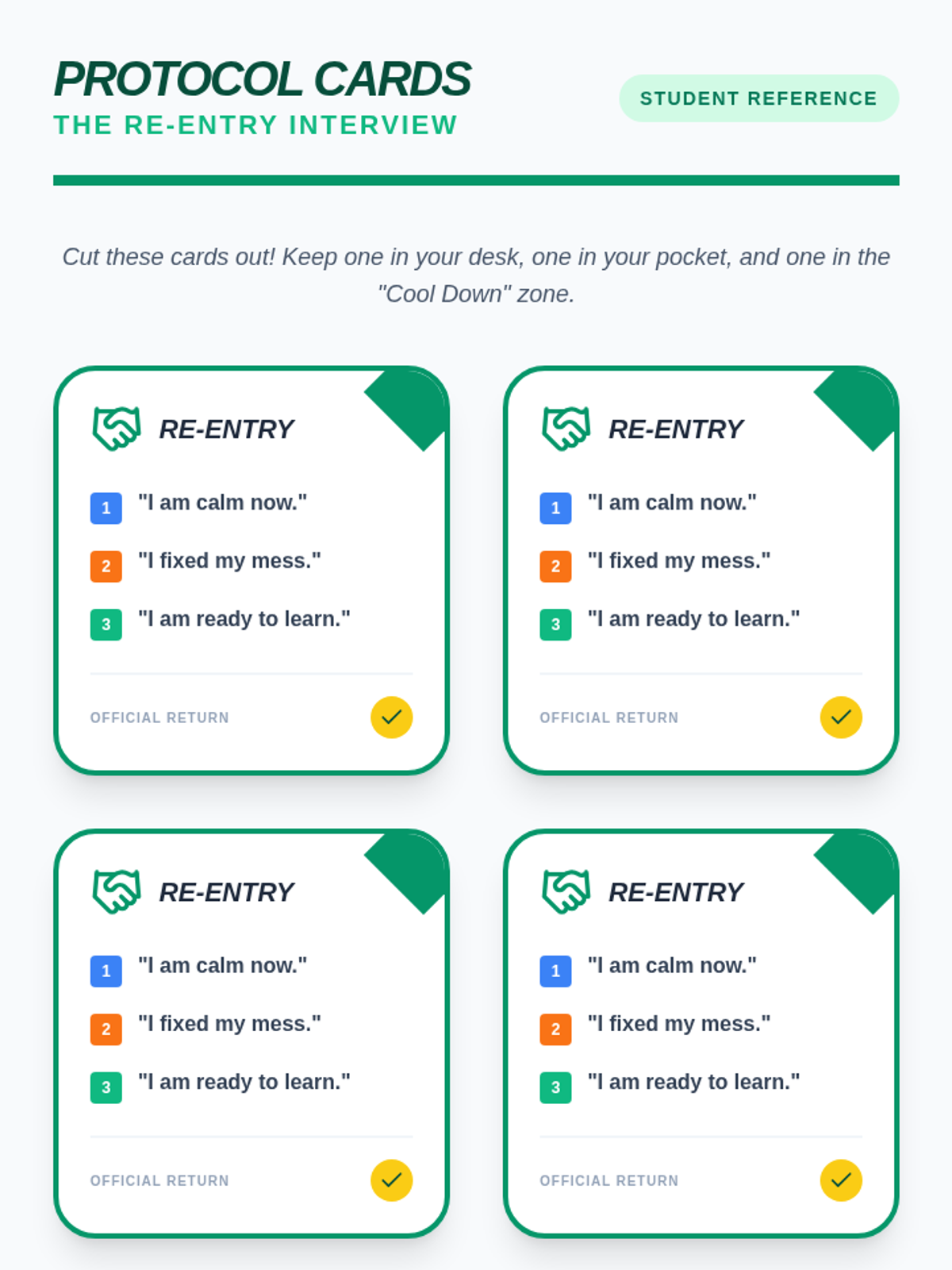 A 5-lesson sequence designed for 3rd-grade students to navigate the 'Re-entry' phase following dysregulation. Students learn to recognize their own readiness signals, practice restorative repairs, master academic re-entry strategies, combat shame with positive self-talk, and formalize their return through structured check-ins.