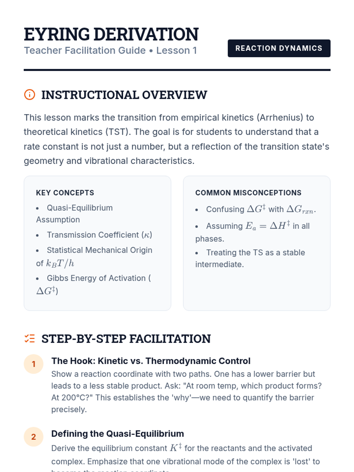 A graduate-level exploration of the energy landscapes governing chemical reactions, linking thermodynamics and kinetics through Transition State Theory, solvent effects, quantum tunneling, and Marcus Theory.