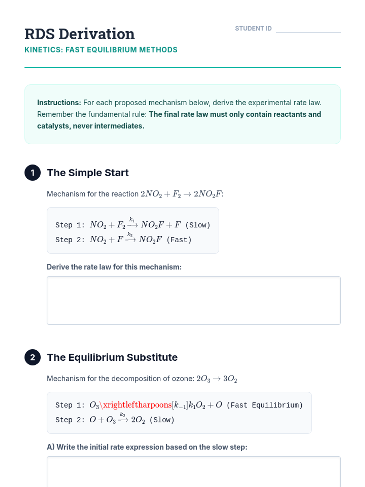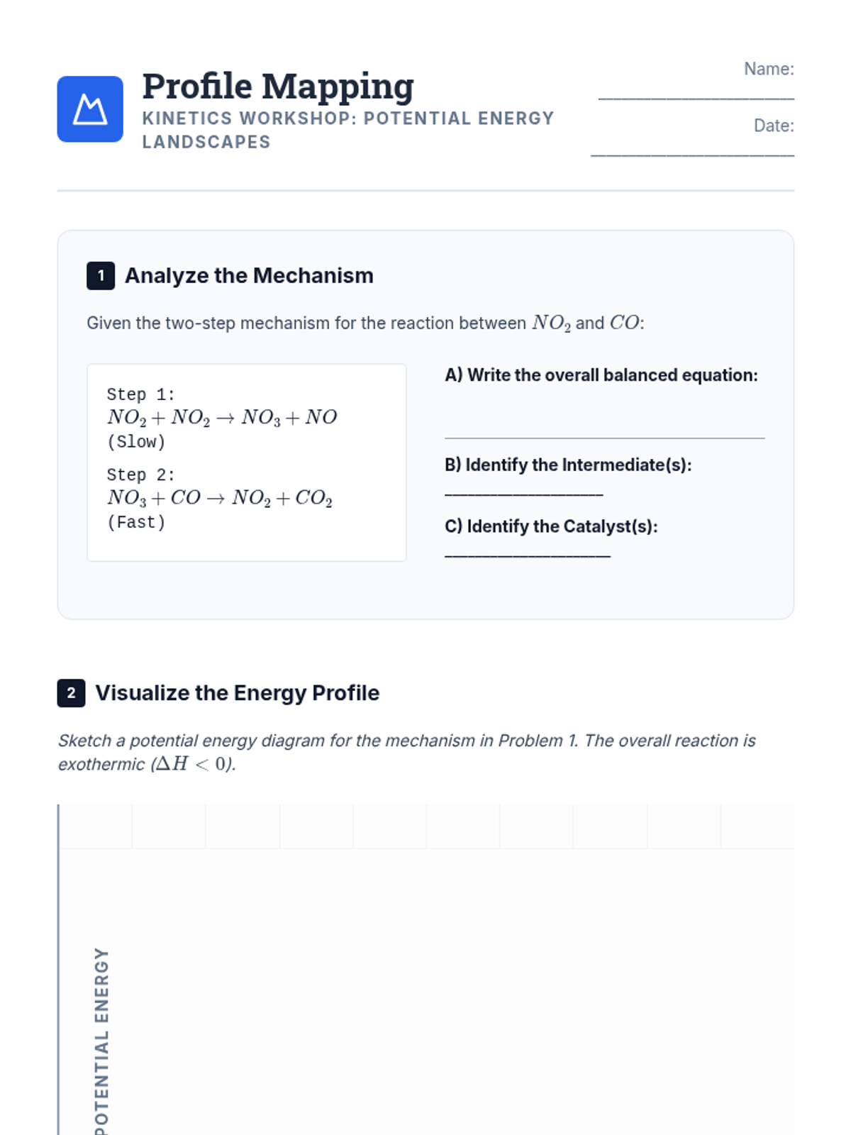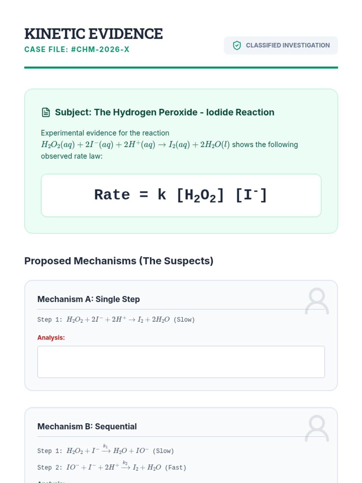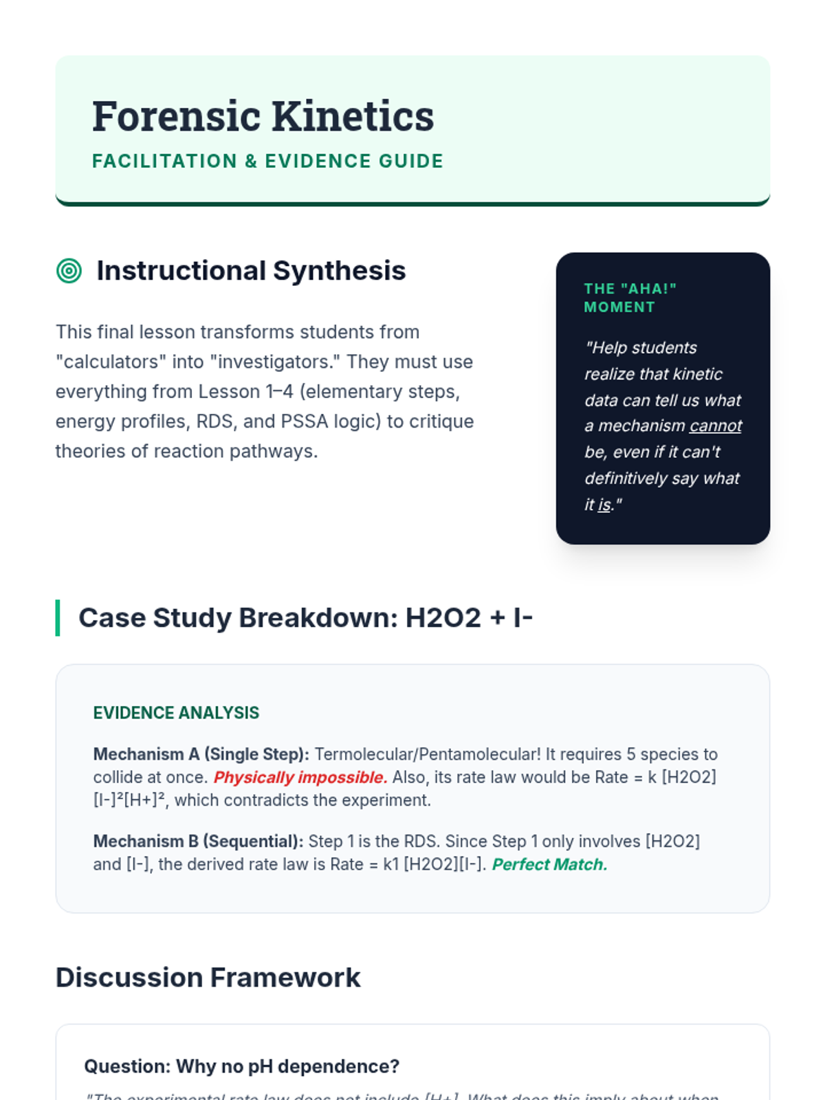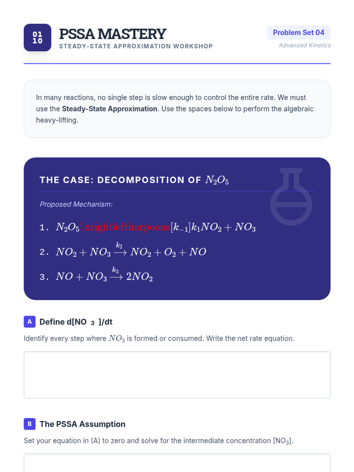 An undergraduate chemistry sequence exploring the step-by-step pathways of chemical reactions, from elementary steps and molecularity to advanced kinetic approximations like the Steady-State Approximation. Students learn to deduce and validate reaction mechanisms using experimental rate laws and potential energy profiles.