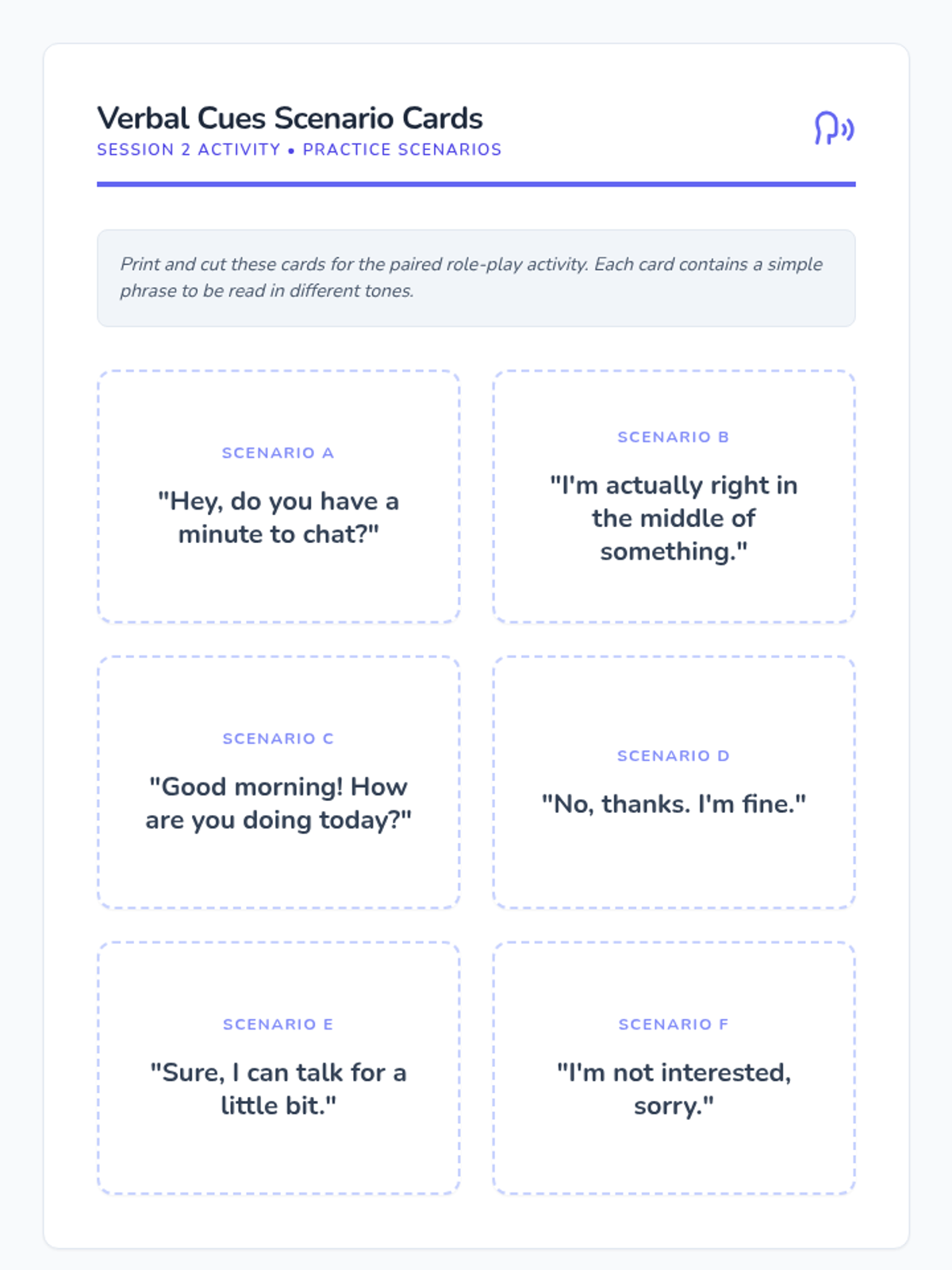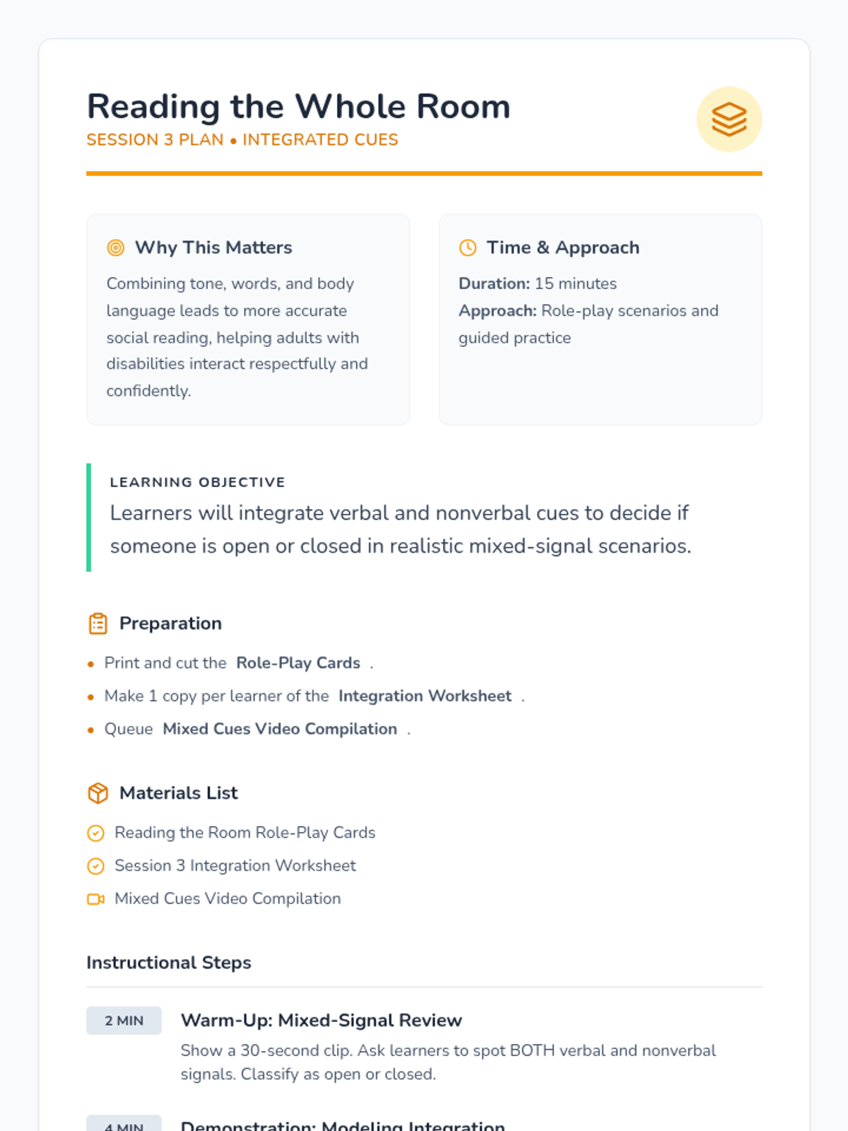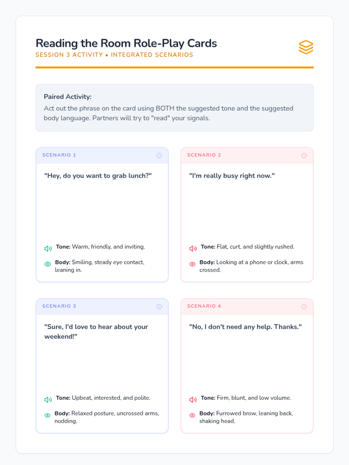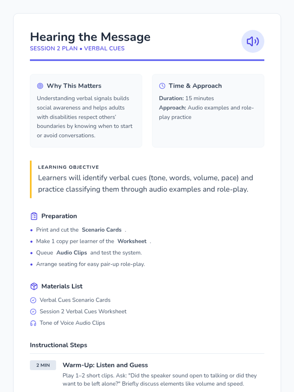 A three-session mini-course for adults with disabilities focused on recognizing verbal and nonverbal cues to navigate social interactions respectfully. Learners progress from identifying body language to tone of voice and finally integrating both to read social situations accurately.