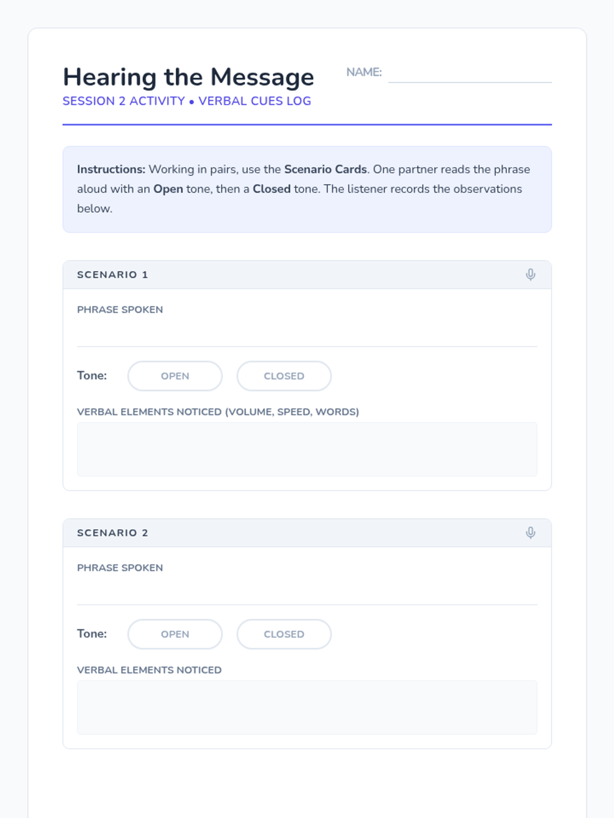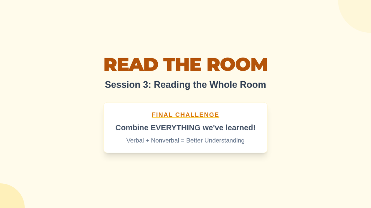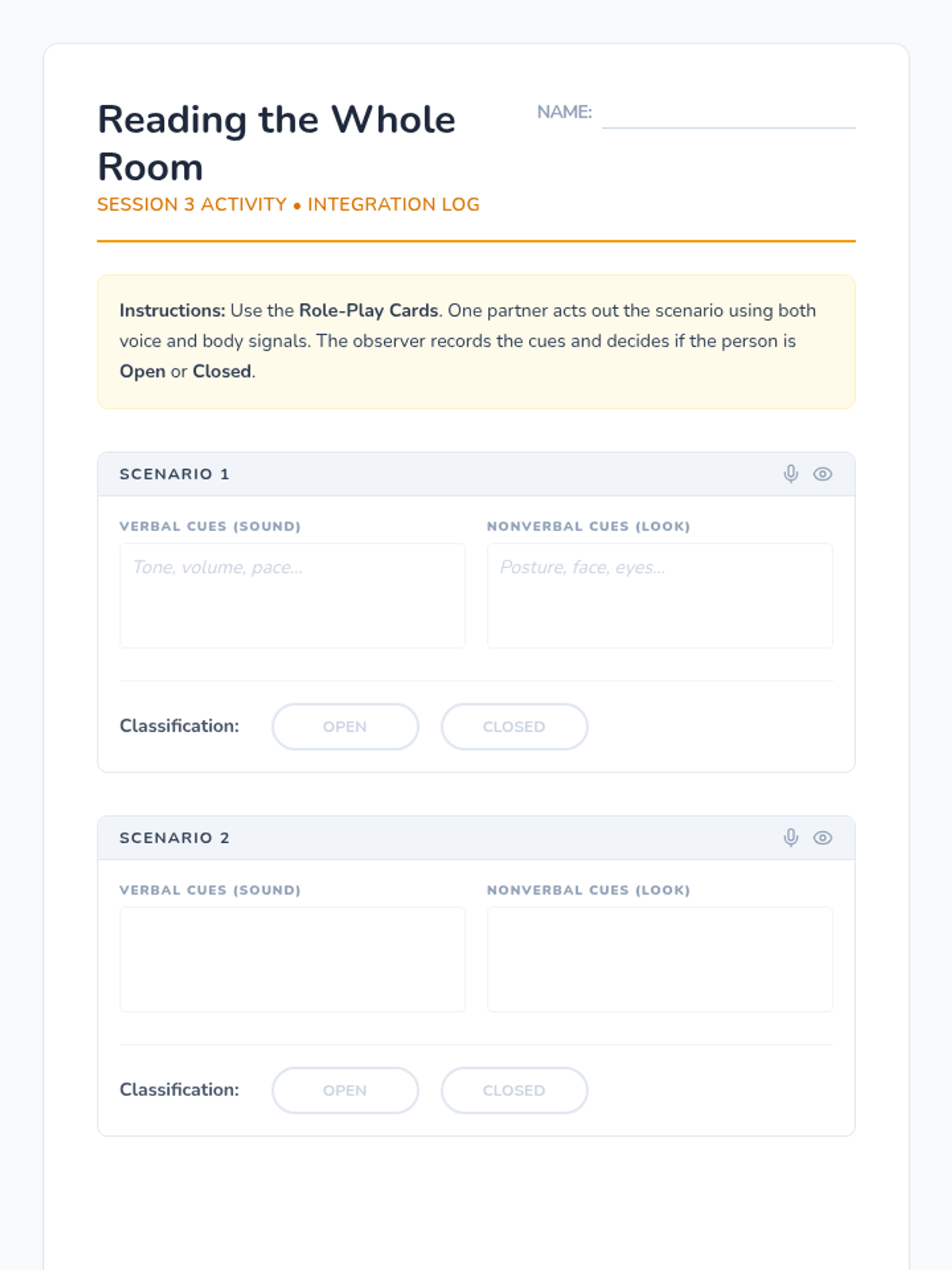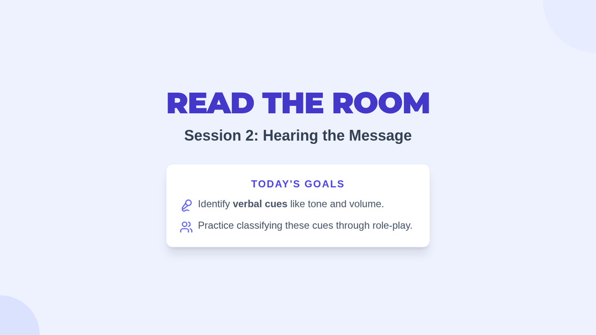 A three-session mini-course for adults with disabilities focused on recognizing verbal and nonverbal cues to navigate social interactions respectfully. Learners progress from identifying body language to tone of voice and finally integrating both to read social situations accurately.