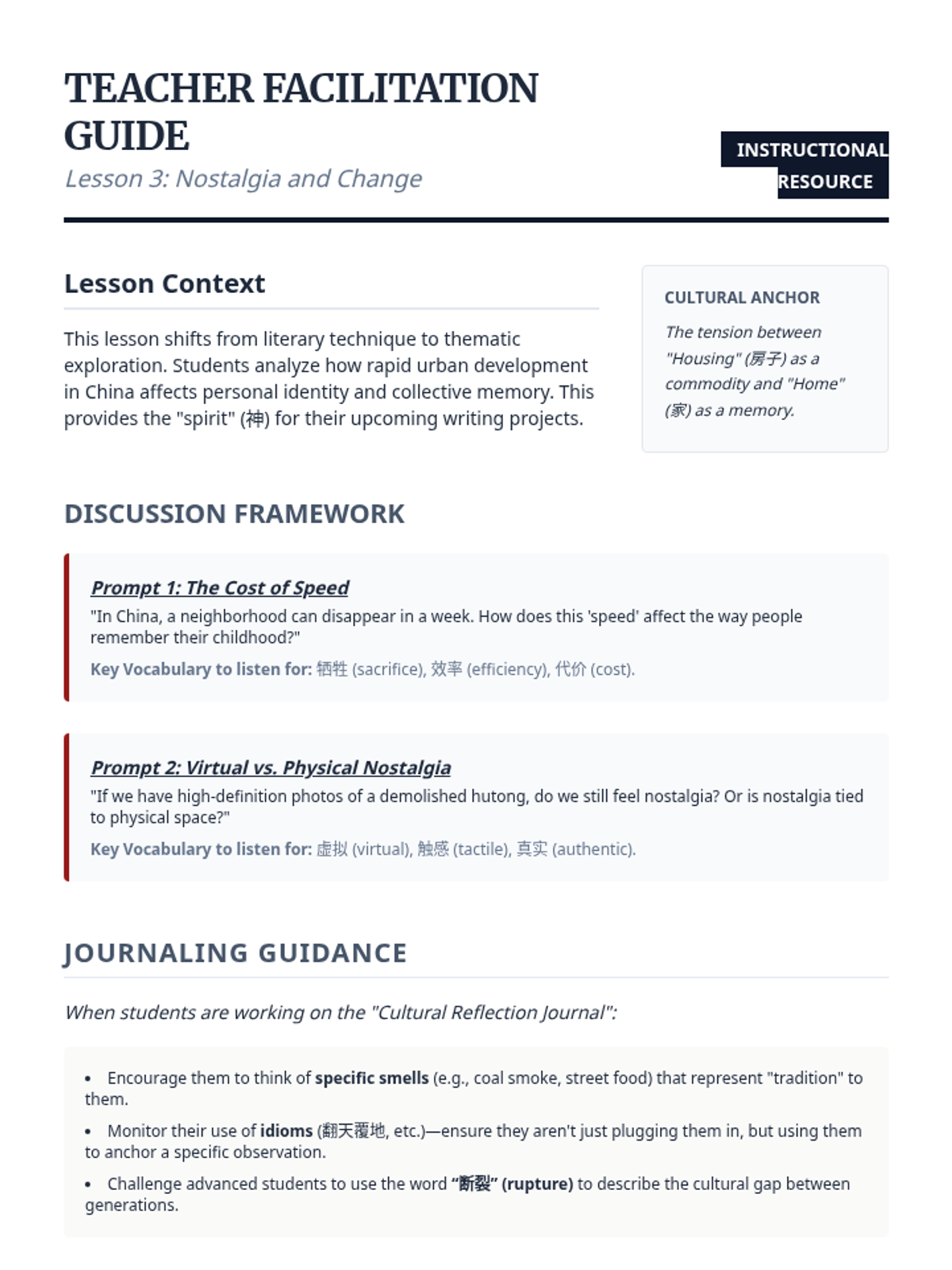 This sequence bridges the gap between classroom character learning and real-world application for graduate-level learners. By analyzing authentic artifacts like signage, menus, and business cards, students develop the 'environmental literacy' needed to navigate Mandarin-speaking urban and professional spaces.