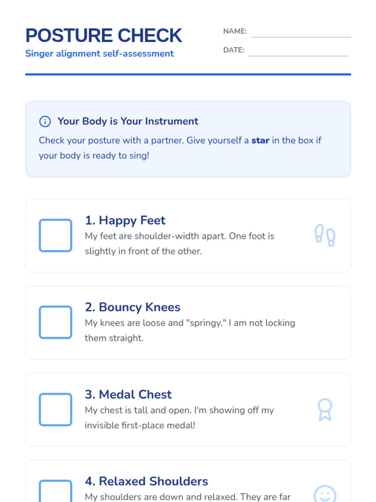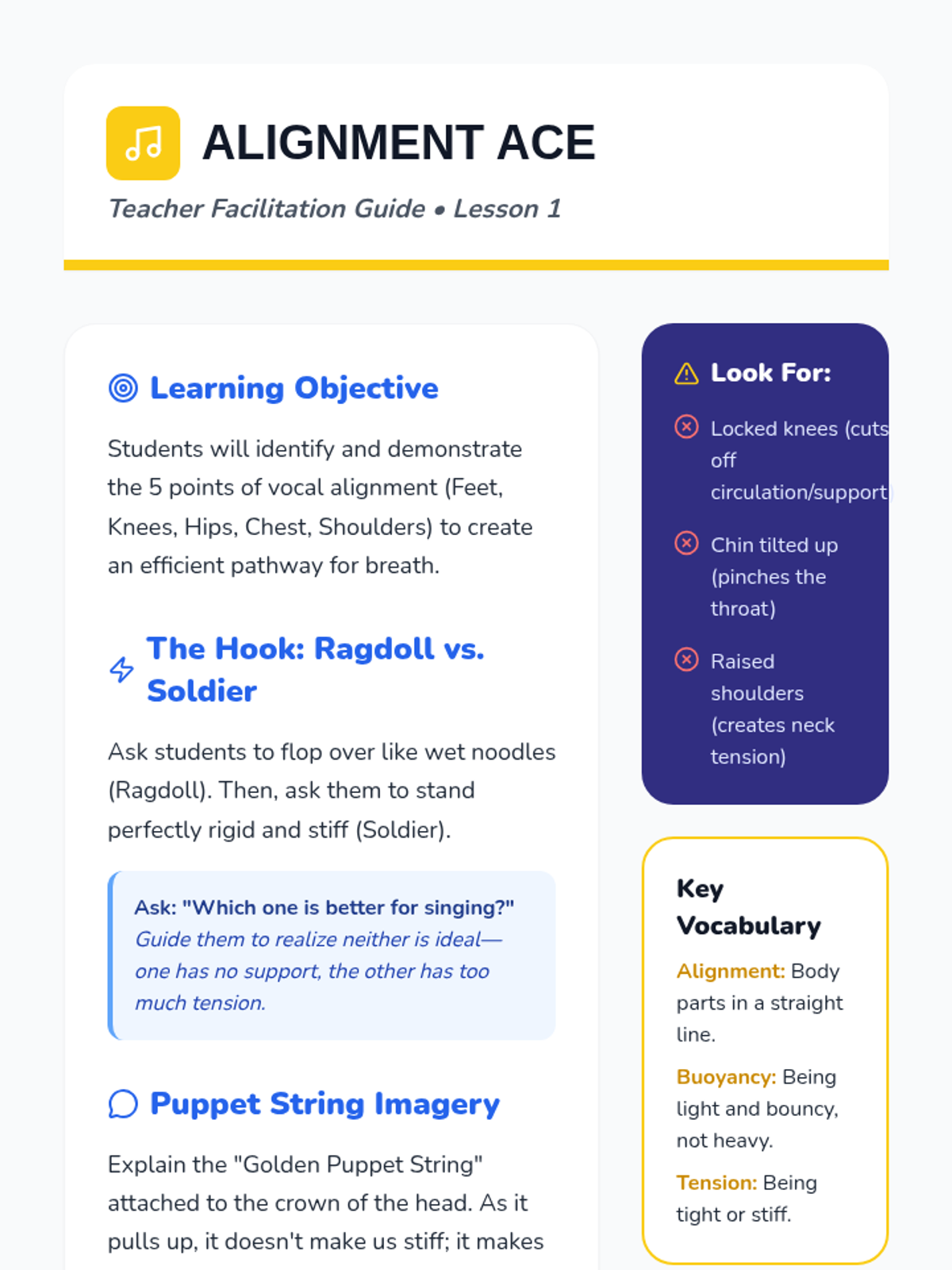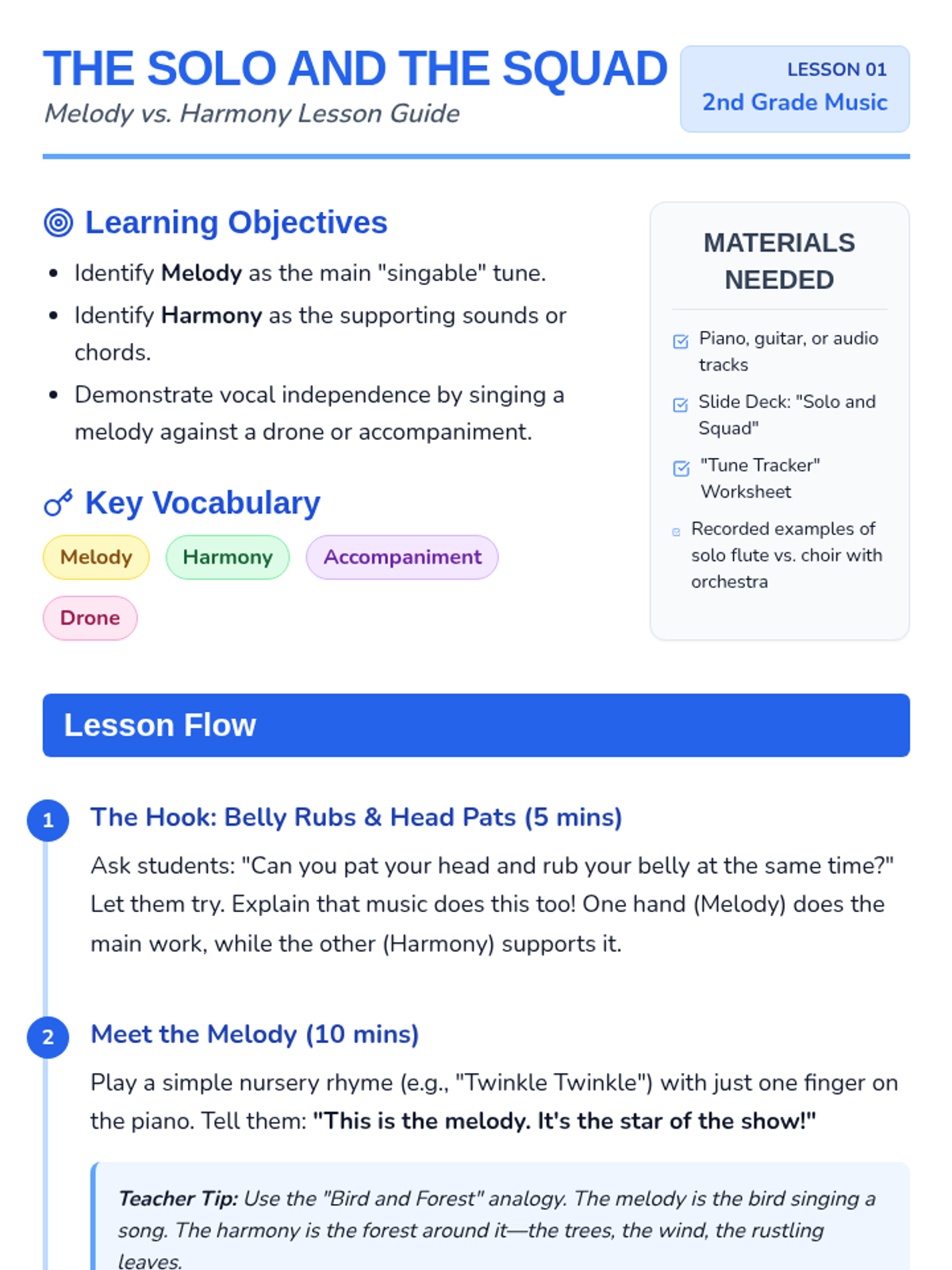 A foundational music sequence for 2nd graders focusing on the physical mechanics of singing. Students explore posture, diaphragmatic breathing, vocal registers, and vowel shapes to build a healthy 'human instrument'.