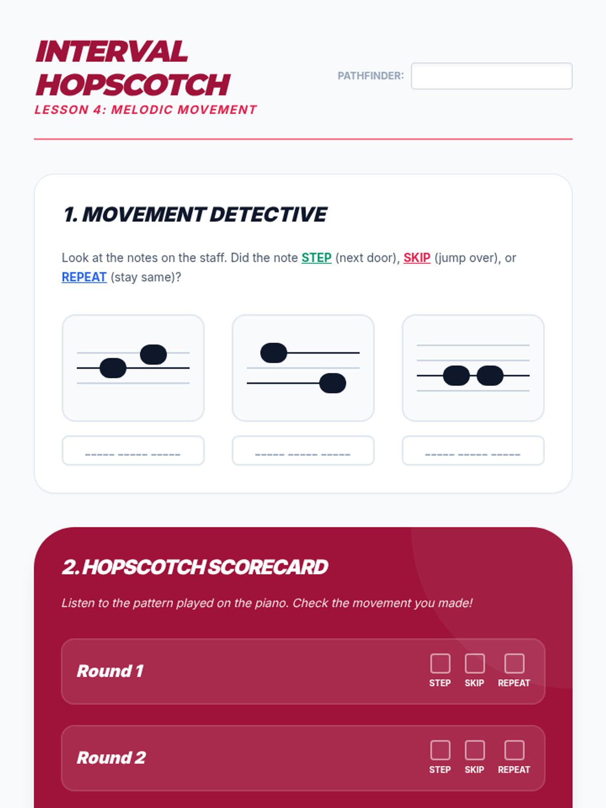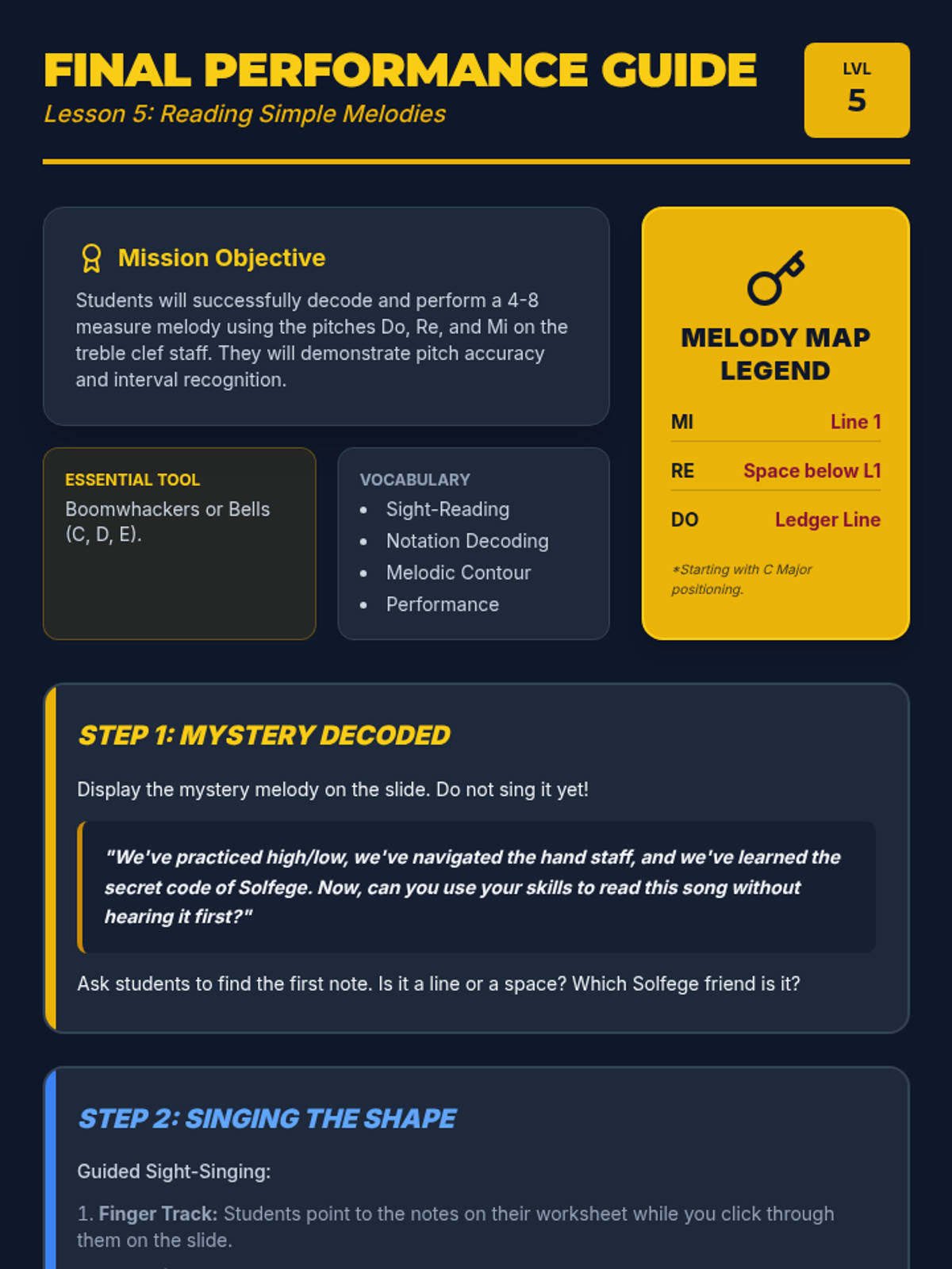 This sequence introduces students to reading standard music notation on melodic instruments. Students learn to identify pitch on the treble clef staff and map it to their instrument, building from finding notes to playing stepwise melodies and managing leaps.